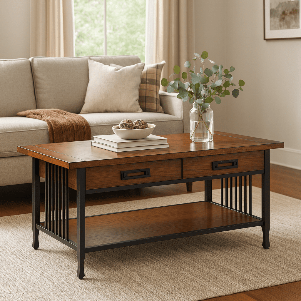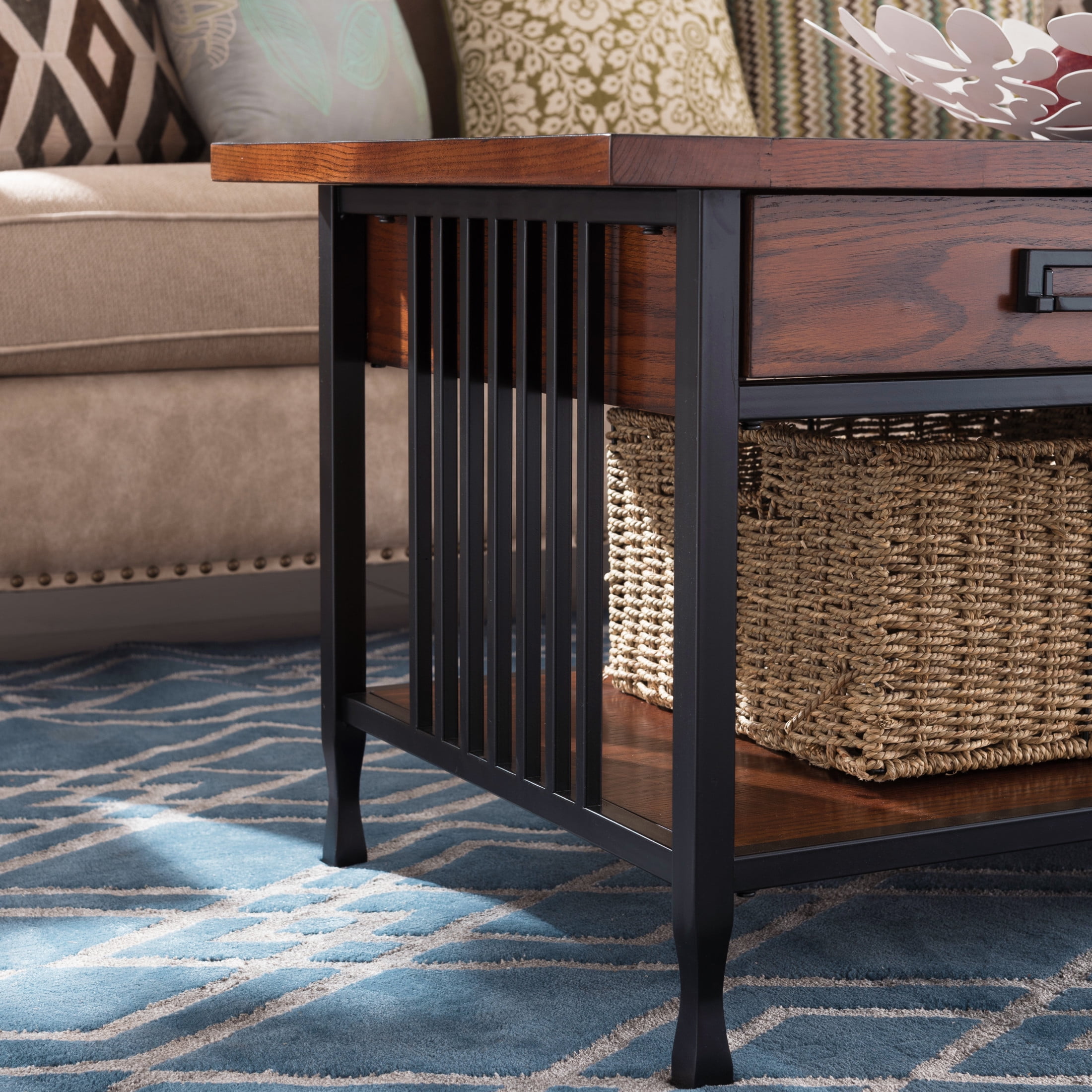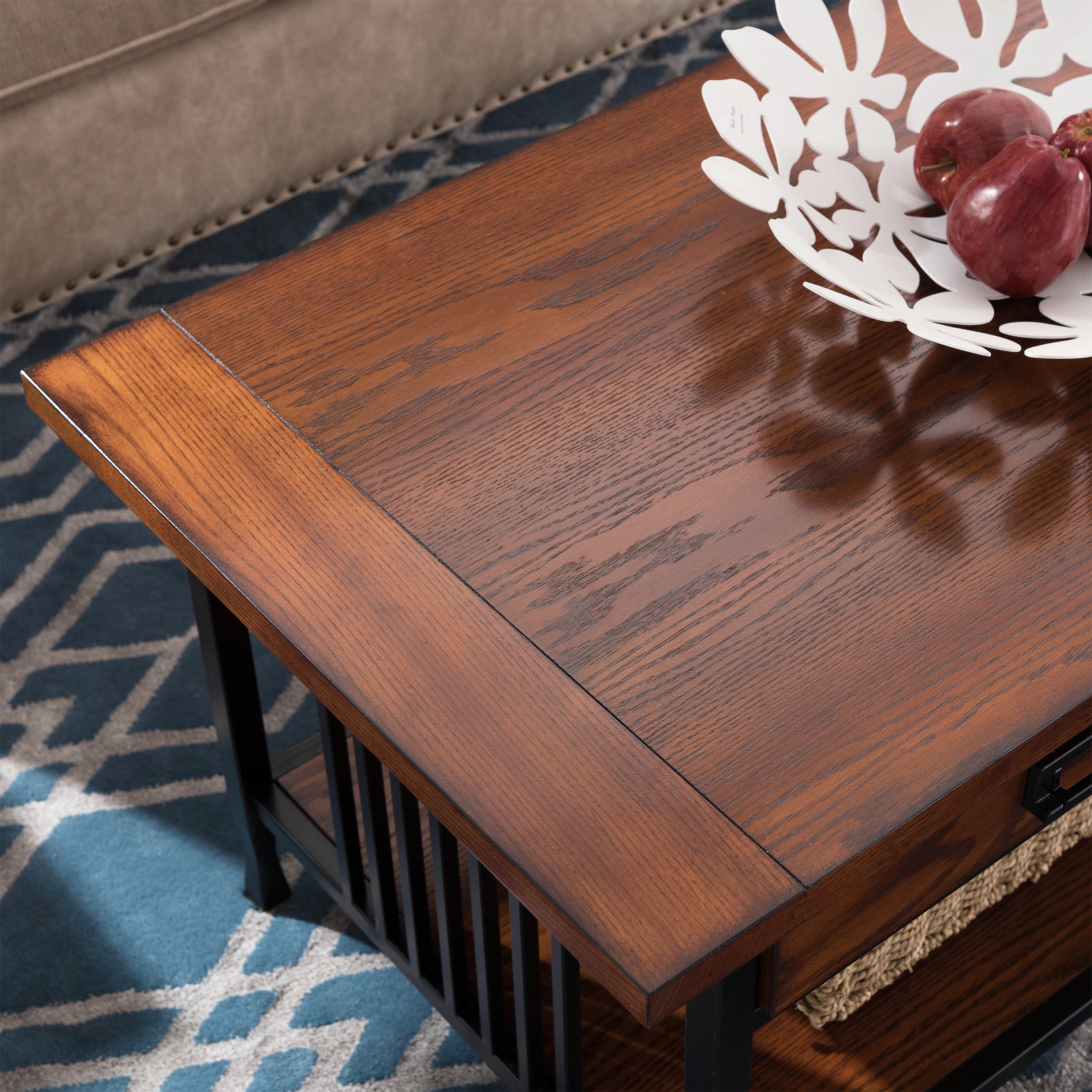 Spacious and Functional Design: This 46″ coffee table features a burnished Mission Oak finish and matte black metal accents, offering a timeless look for any living space Durable Hardwood Construction: Crafted from high-quality hardwoods, this table provides exceptional strength, stability, and long-lasting beauty Ample Storage with Two Drawers: Full-extension, ball-bearing drawer guides provide smooth access to storage, while custom two-piece hardware adds a refined touch Easy Assembly: Designed for quick and simple setup with pre-assembled drawers and included instructions, so you can enjoy your new coffee table in minutes