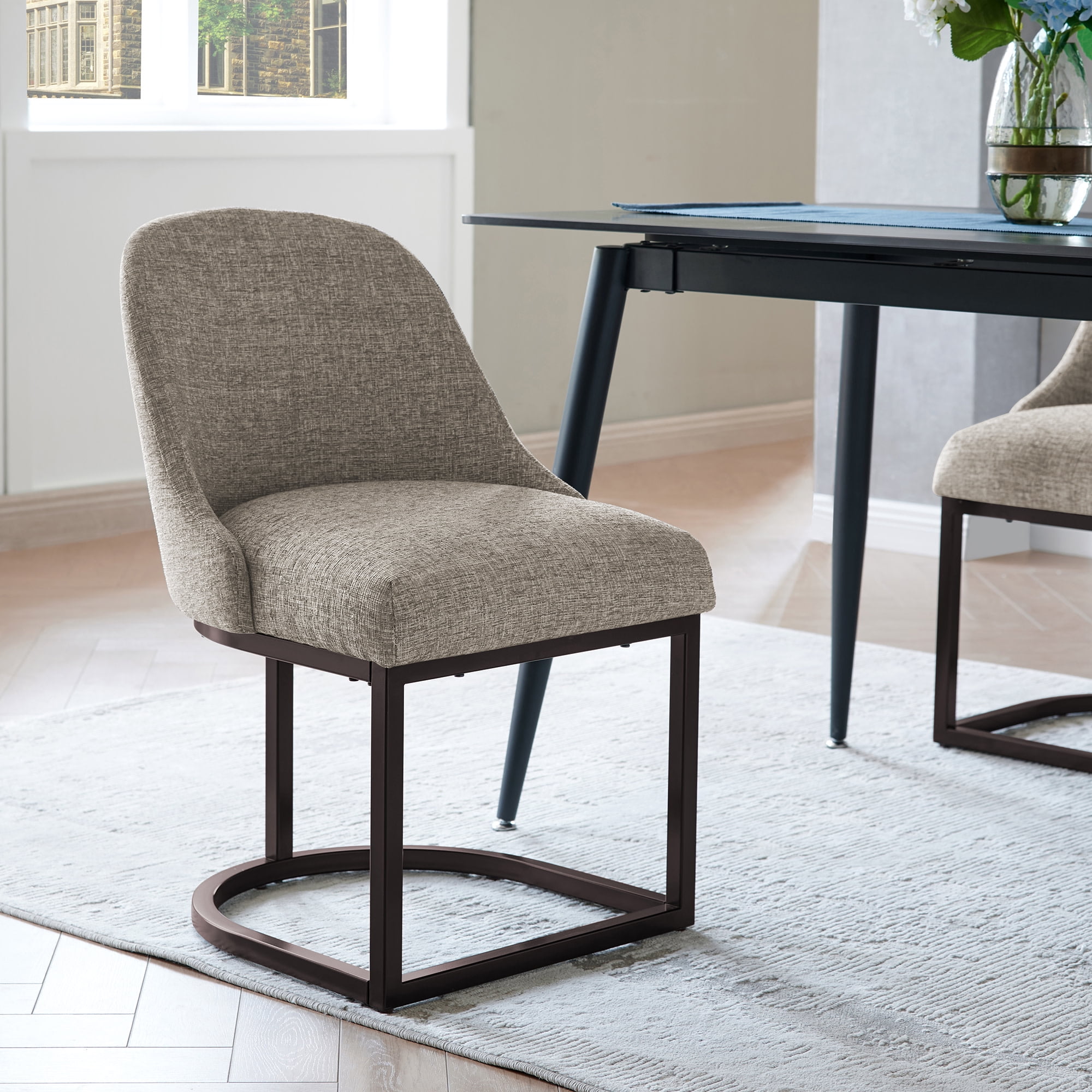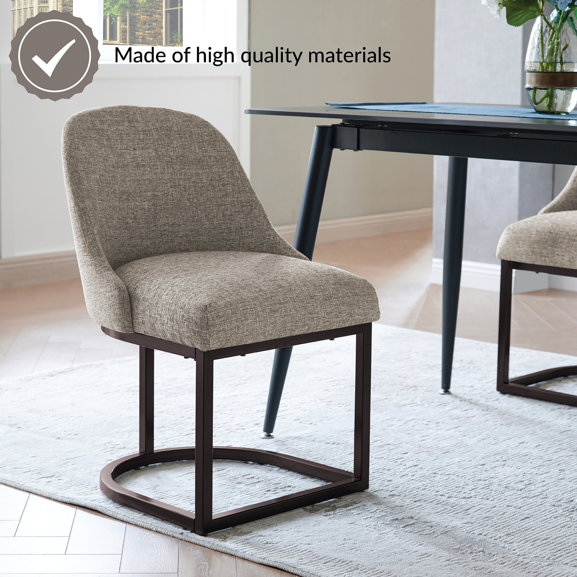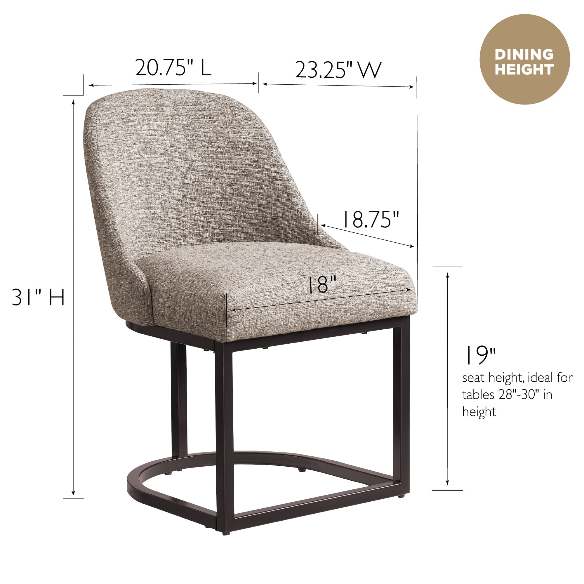 Dining Height Chair: Measures 20.75″ L x 23.25″ D x 34″ H and is compatible with counters and tables 28″ to 30″ high; comes in a set of two High Quality Craftsmanship: Durable fabric provides long-lasting use and heavy gauge steel base ensures stability Comfortable Seat: High density foam seat cushion maintains its shape over time and supportive barrelback design provides comfort for everyone Modern Design: Gray linen upholstery with curved metal elements complements many decor styles including modern and contemporary to give you a versatile piece for your home Stress-Free Assembly: Simple assembly allows you to enjoy your new chair in minutes Buy with Confidence: Customer satisfaction has been our priority for 150 years; with our 1-year limited warranty, you can rest assured your purchase is risk-free