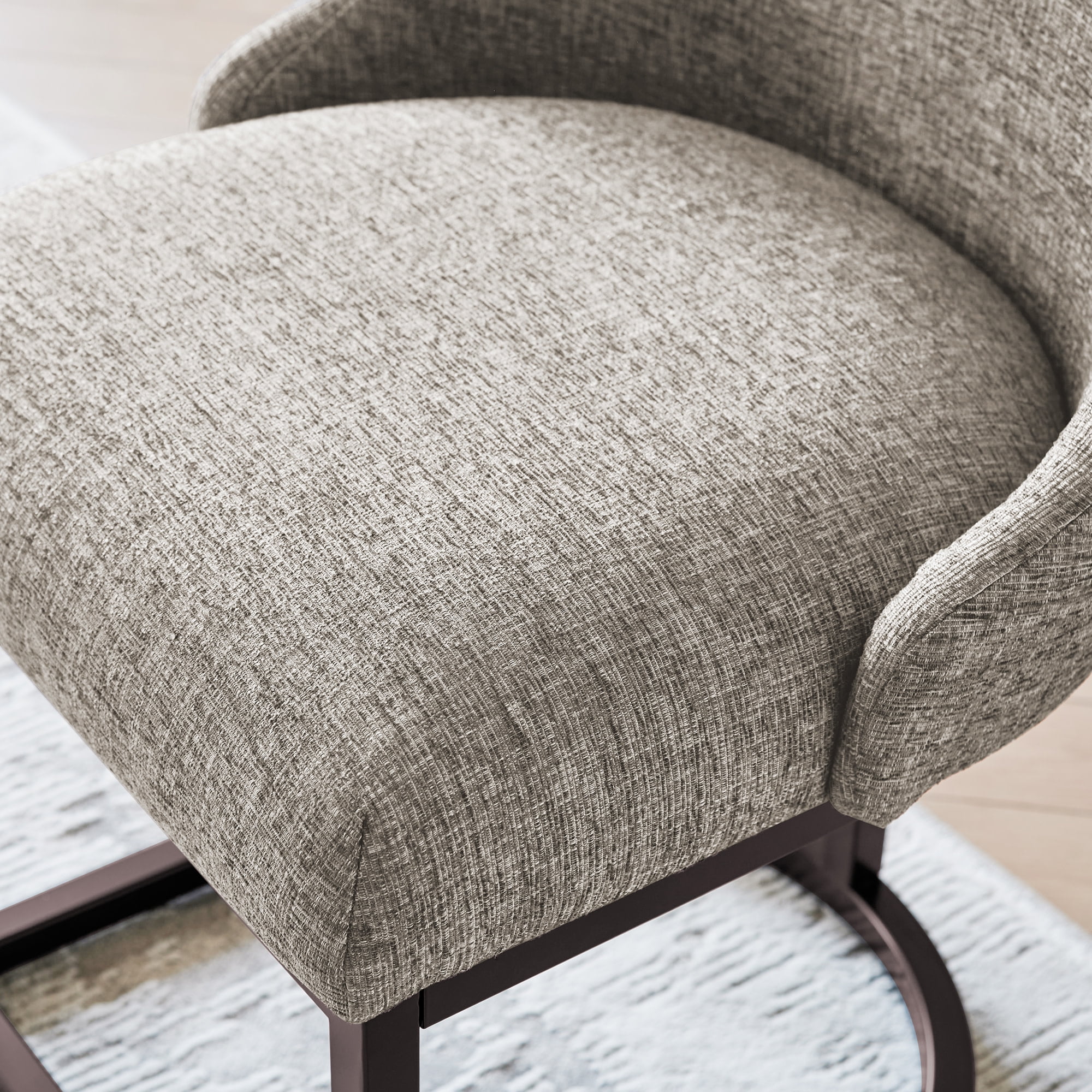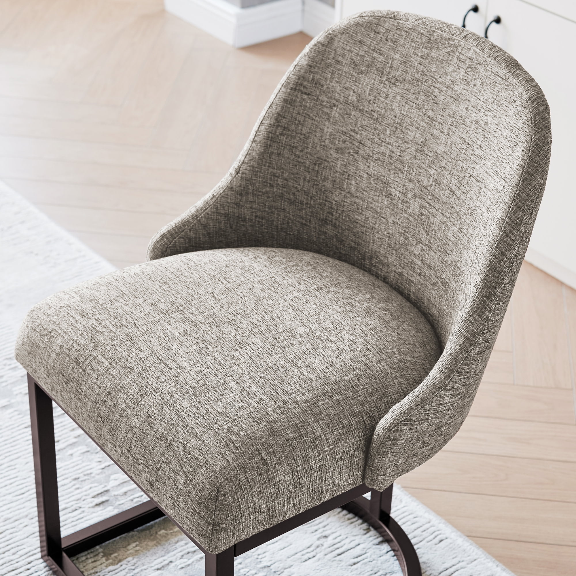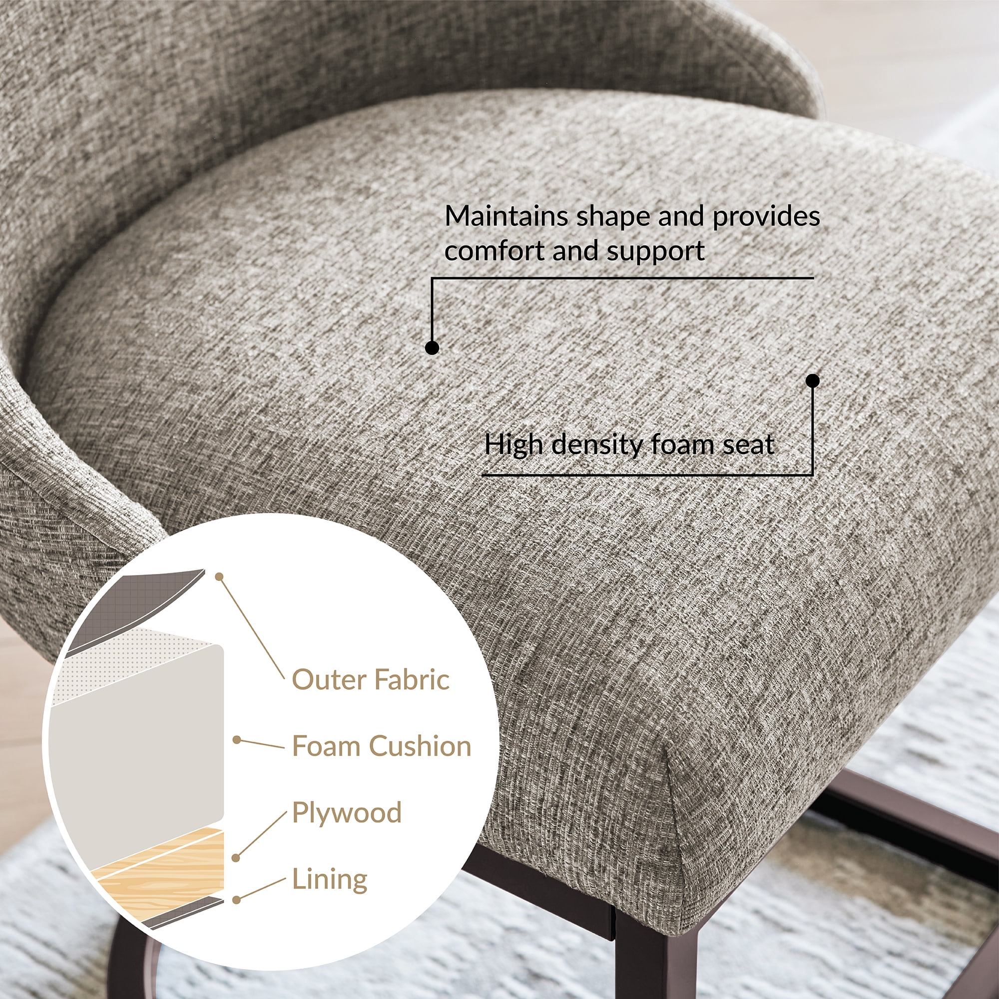 Dining Height Chair: Measures 20.75″ L x 23.25″ D x 34″ H and is compatible with counters and tables 28″ to 30″ high; comes in a set of two High Quality Craftsmanship: Durable fabric provides long-lasting use and heavy gauge steel base ensures stability Comfortable Seat: High density foam seat cushion maintains its shape over time and supportive barrelback design provides comfort for everyone Modern Design: Gray linen upholstery with curved metal elements complements many decor styles including modern and contemporary to give you a versatile piece for your home Stress-Free Assembly: Simple assembly allows you to enjoy your new chair in minutes Buy with Confidence: Customer satisfaction has been our priority for 150 years; with our 1-year limited warranty, you can rest assured your purchase is risk-free