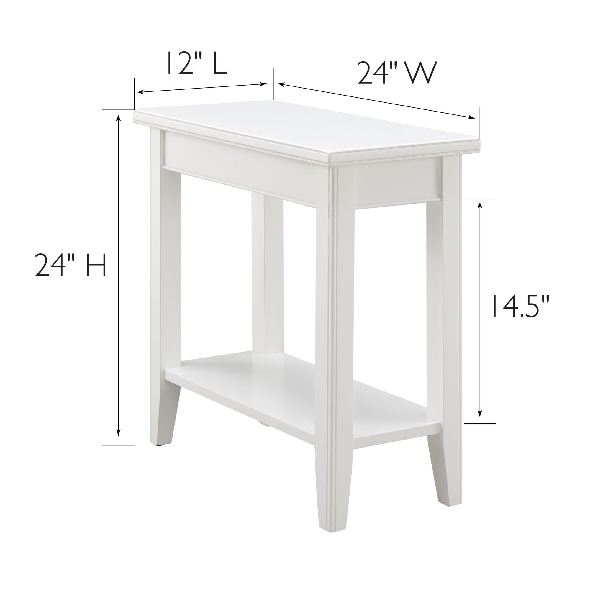 Assembled Product Dimensions: 24 inches D x 12 inches L x 24 inches H Expertly crafted from solid wood, this table showcases natural variations in grain and texture, making each piece truly one of a kind Heavily scaled top and posts with beaded edge details High display shelf for easy cleaning beneath Durable, white painted finish Simple assembly in minutes Solid hardwood and veneer construction Perfect small space solution for apartments and condos Recommended location: Indoor