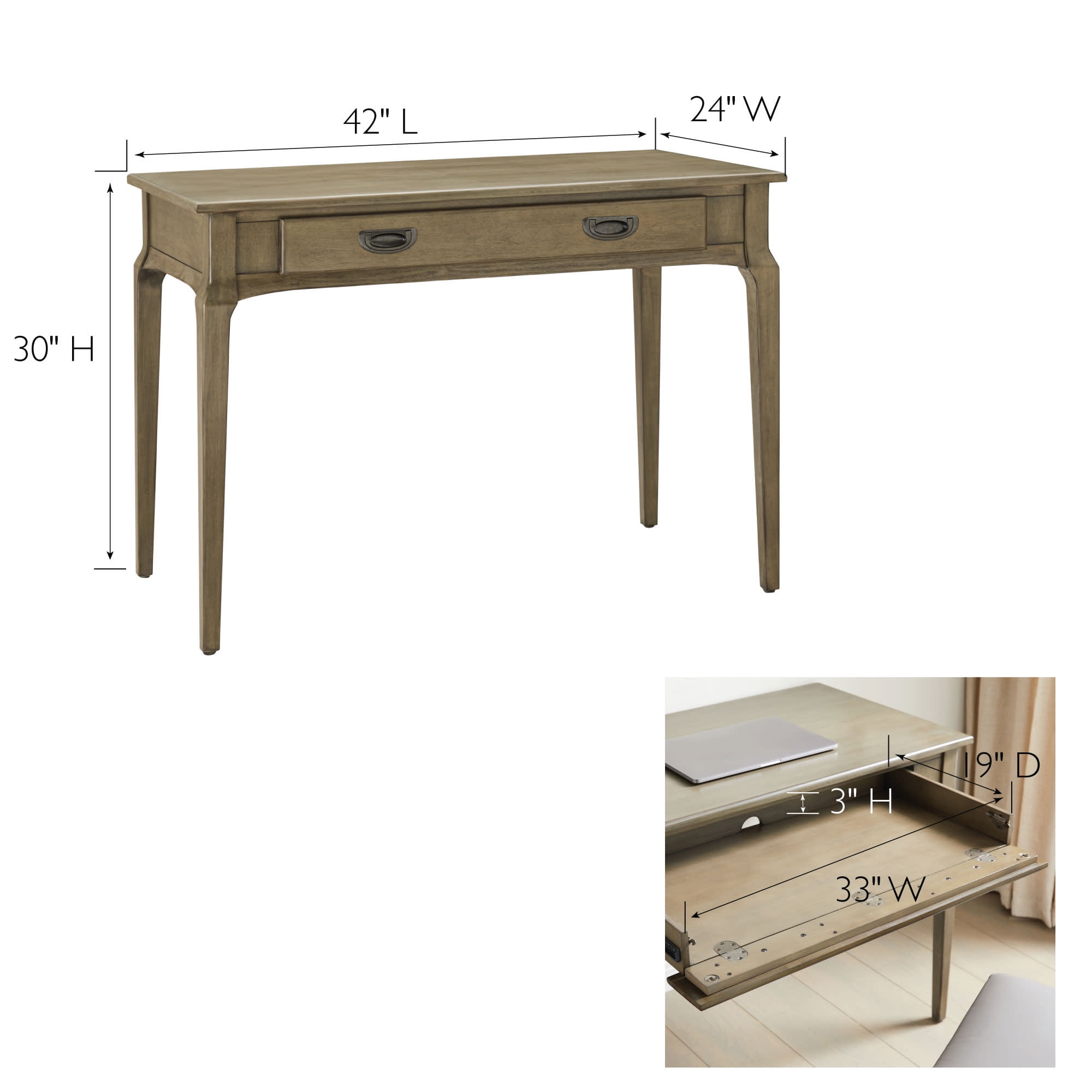 Assembled Product Dimensions: 24 inches D x 42 inches L x 30 inches H Ball-bearing full extension drawer guides offers reliable, smooth glide access to the entire 16 inch drawer depth Drop lid drawer front for keyboard access when needed with a locking front for storage when not in use. Durable solid hardwoods and cherry veneers in a Smoke Gray finish Simple assembly in minutes Wire retaining grommet on the back to organize unsightly, draping wires