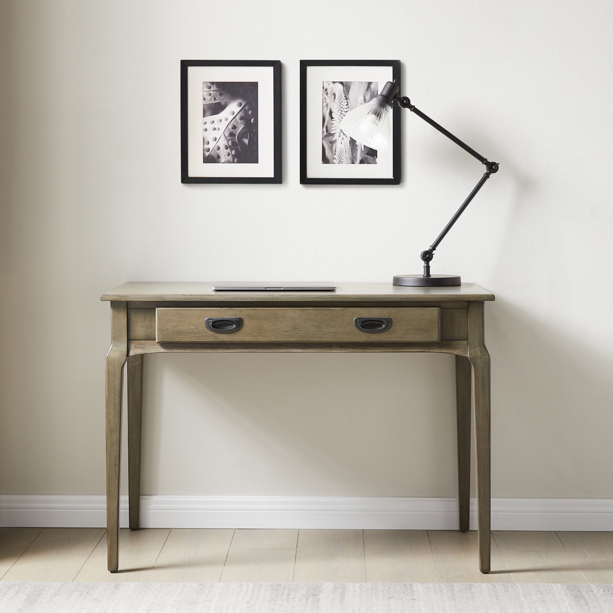 Perfect for laptops or to hide away papers or a desktop keyboard, this delicately scaled desk offers abundant organization assistance. The drop front drawer keeps the keyboard at a comfortable work height while full extension drawer guides offer the full depth of the drawer as useable space. The soft, Smoke Gray finish is beautiful to be sure, but also delivers durability and protection leading to many years of service. Designed and manufactured by Leick Home, the trusted source for quality home furnishings for every taste and budget.All Leick products are guaranteed against defects in workmanship for a period of one year under normal residential use. Please keep dated invoice for claims.