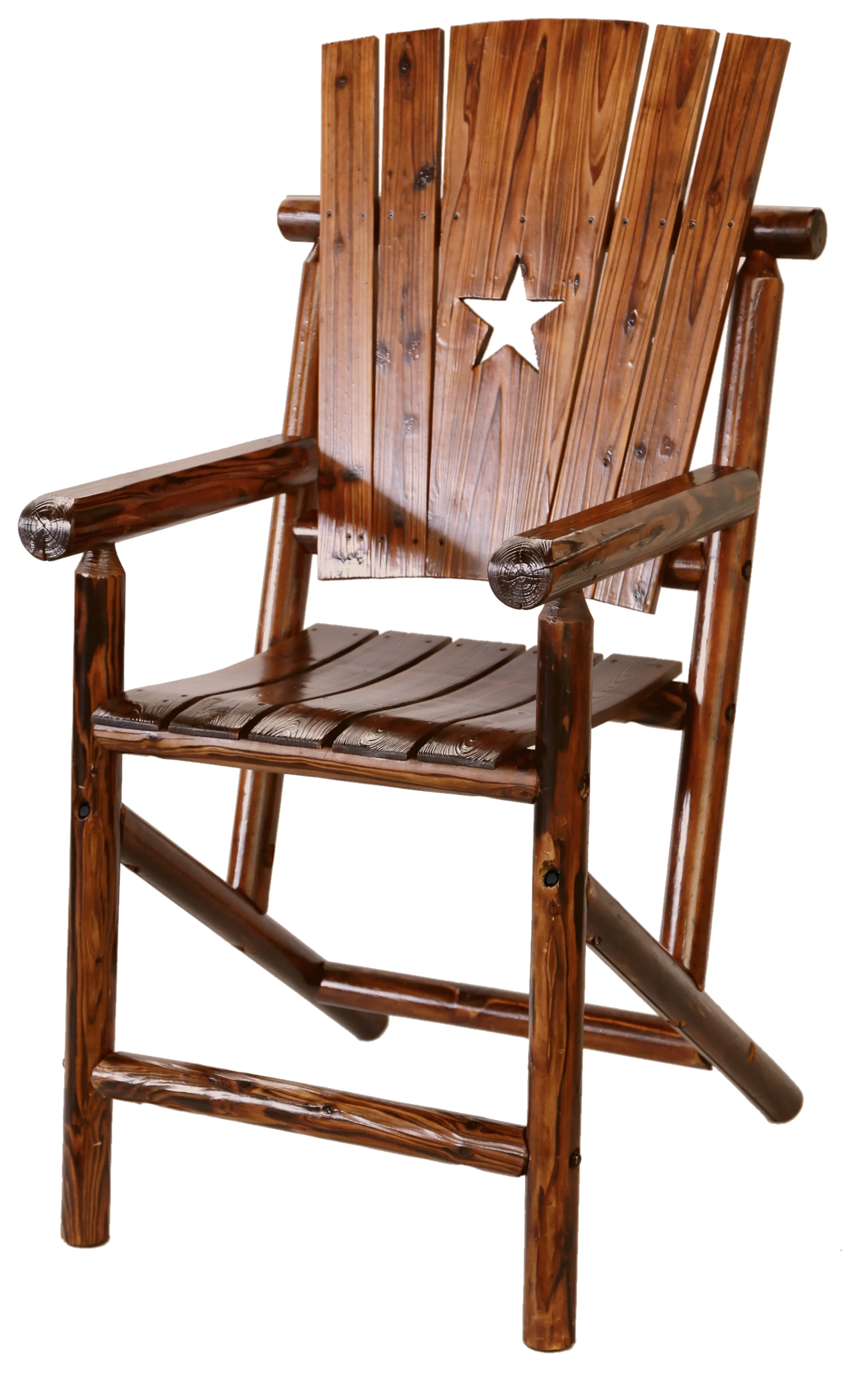 Our Char-log Bar Arm chair is wide, with a tall back and features a cut-out star on the back. Unlike a typical bar stool, our bar height chair features arm rests for extra comfort. Try pairing it with our Char-Log Round Bar Table! (Sold separately).