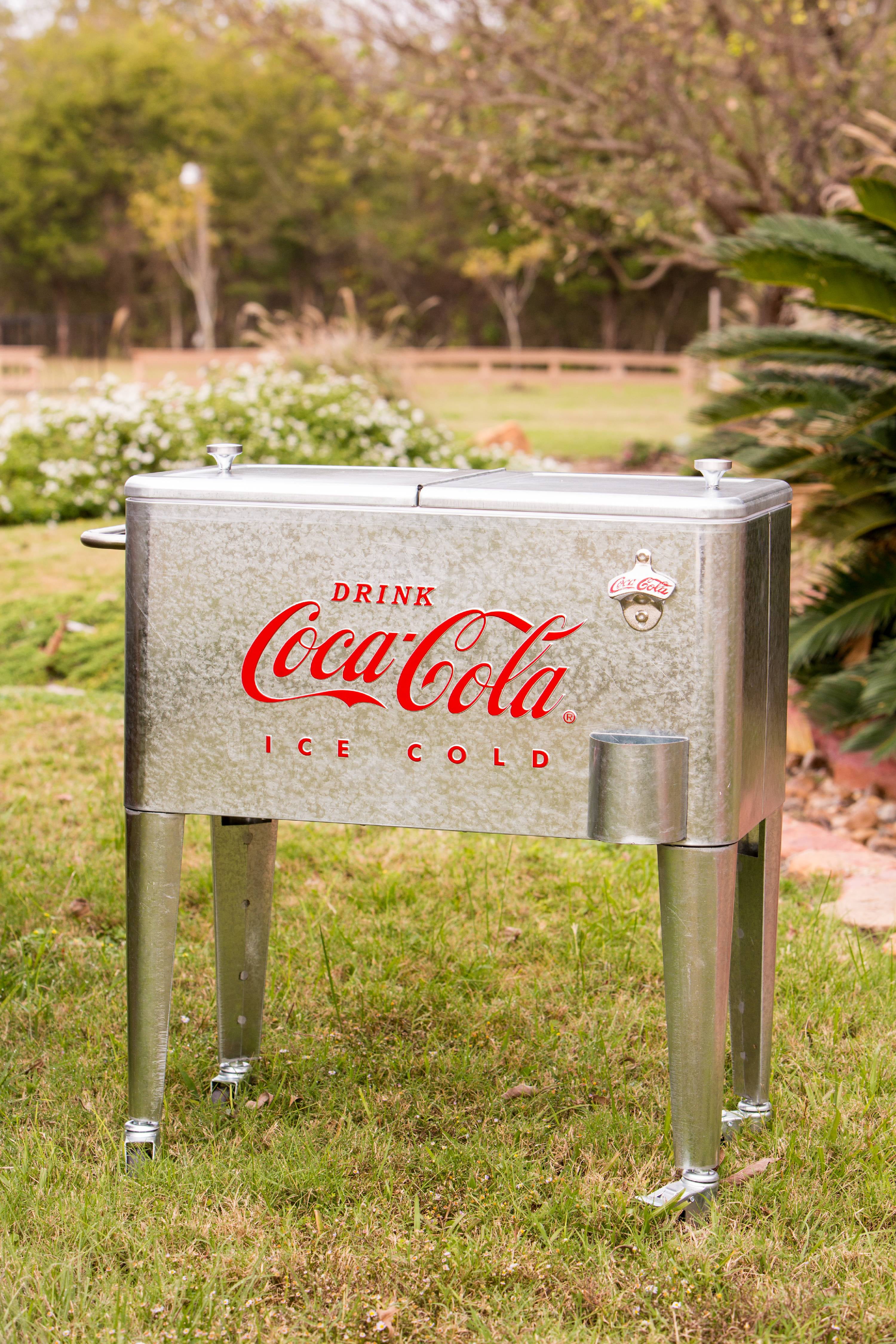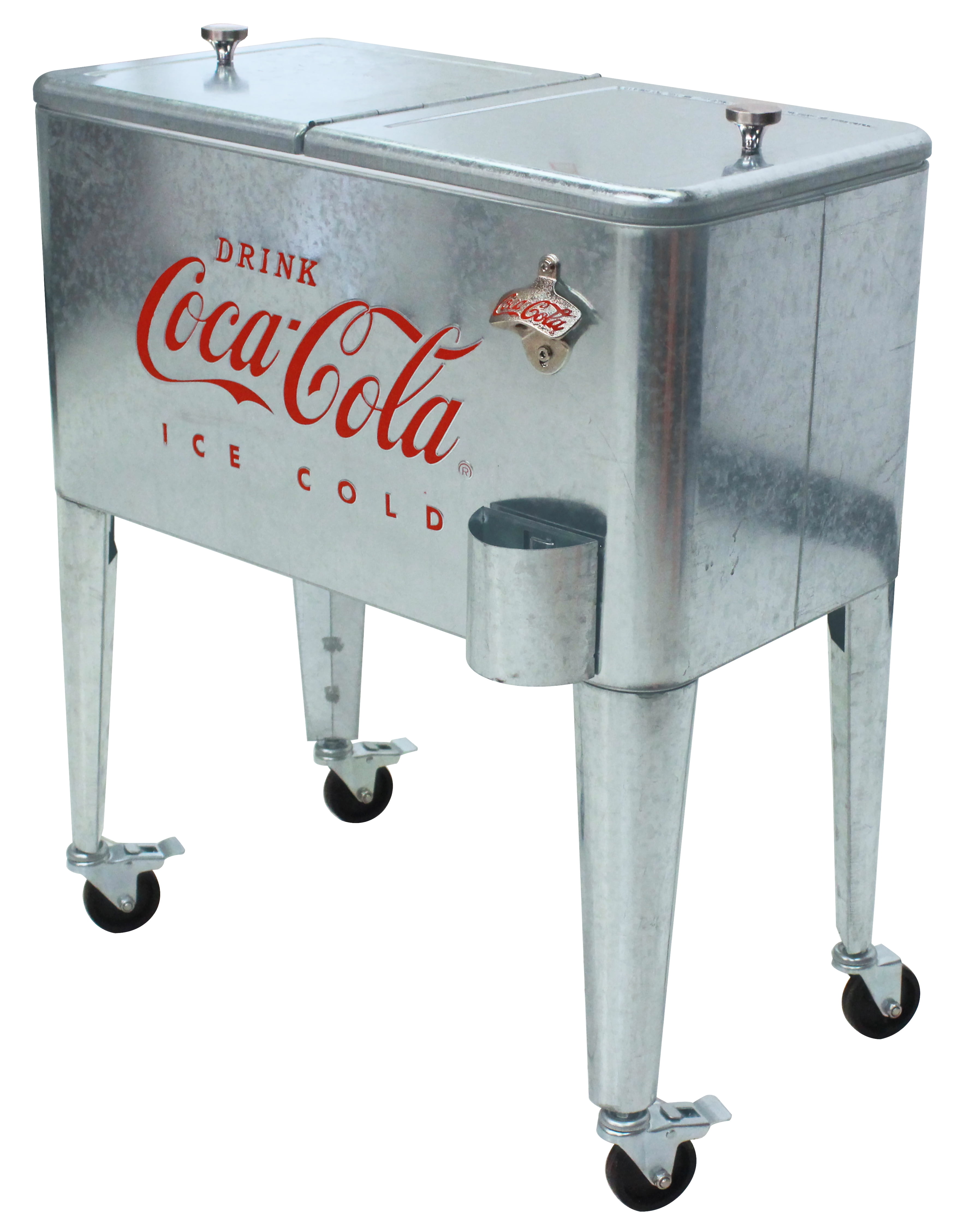 Get the party rolling with our Leigh Country CP 98104 Coca-Cola 60 Qt. Metal Outdoor Patio Cooler -in silver. Made of galvanized metal, with a Polypropylene liner and removable lids that open on both ends. It includes a stainless-steel towel bar, a heavy-duty bottle opener with the Coca-Cola logo, an attached cap catcher, with an attractive embossed old-school Coca-Cola logo in red, a drain plug. The lid has stainless-steel hinges. It’s a great way to take the party where you need it, and since the casters have brakes, it rolls only when you want it to.