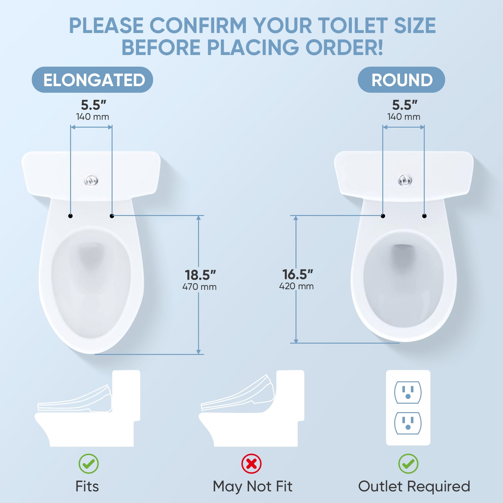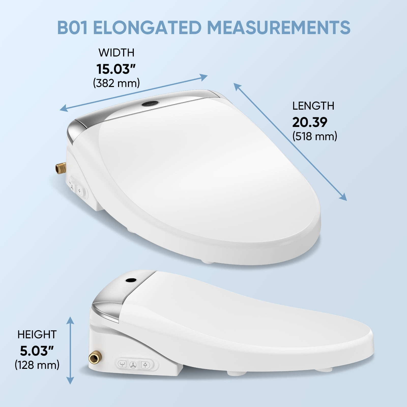 LEIVI B01 electric bidet toilet seat is designed to give you high-quality features and unique bathroom experience. It is equipped with adjustable instant warm water wash, warm air dry, various wash modes, dual nozzle system, ergonomic heated seat, wireless remote control, side control, auto nightlight, and more. Enjoyable Home Spa – This smart bidet provides a refreshing clean for your entire family. The strong wash mode gives an added boost of power when needed, while the soft wash mode is perfect when a gentle wash is desired. Front and rear washes are naturally aerated for superior cleaning and users can also opt for a pulsing or oscillating spray. Pressure, temperature, and nozzle position are fully adjustable. Dual Control System – This bidet seat is equipped with remote control and side control, which facilitate the pregnant or elderly people who are not so convenient to move around. The indicator lights on the remote embedded for different cleansing, drying and seat temperature. With a stylish design and weighted feel, the wireless remote could be wall mounted or used in-hand. Various Practical Features – The advanced heating technology provides an extended warm water cycle and the warm air dryer gives an added touch of luxury. The auto nightlight adds benefit of enhanced usability at night and the activated carbon filter helps to keep your bathroom fresh. The bidet nozzle would clean itself automatically between uses, the soft-close lid and seat would make no loud and abrupt slamming. How to install – Straight insertion and click for main unit as well as clamping connector for inlet water pipe, making assembling or disassembly easy and fast. For quick installation follow the steps by downloading our install manual or watching tutorial. ( PS: This bidet seat must be seated on before operating the remote control or side control.)