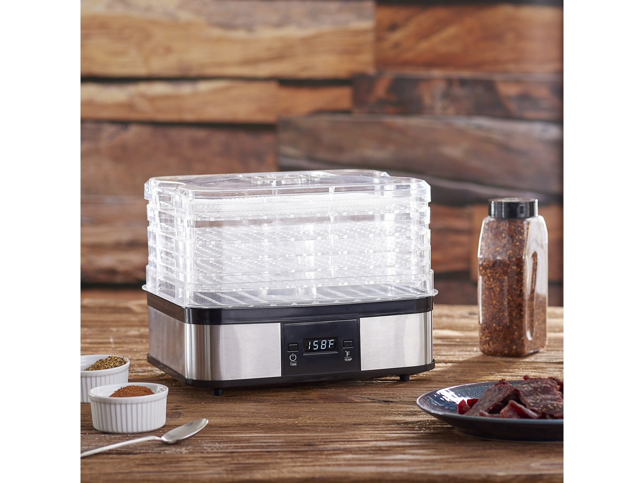 LEM 5 Tray 0 W 5-Tray Food Dehydrator Perfect countertop size for making tasty treats Chimney-like center design allows for even air flow and uniform drying Clear body enables easy monitoring of food while dehydrating User-friendly digital display with auto shut-off feature Offers 3.5 sq. ft. of drying space Timer adjustable from 1 to 36 hours Digital presets available for temperature settings
