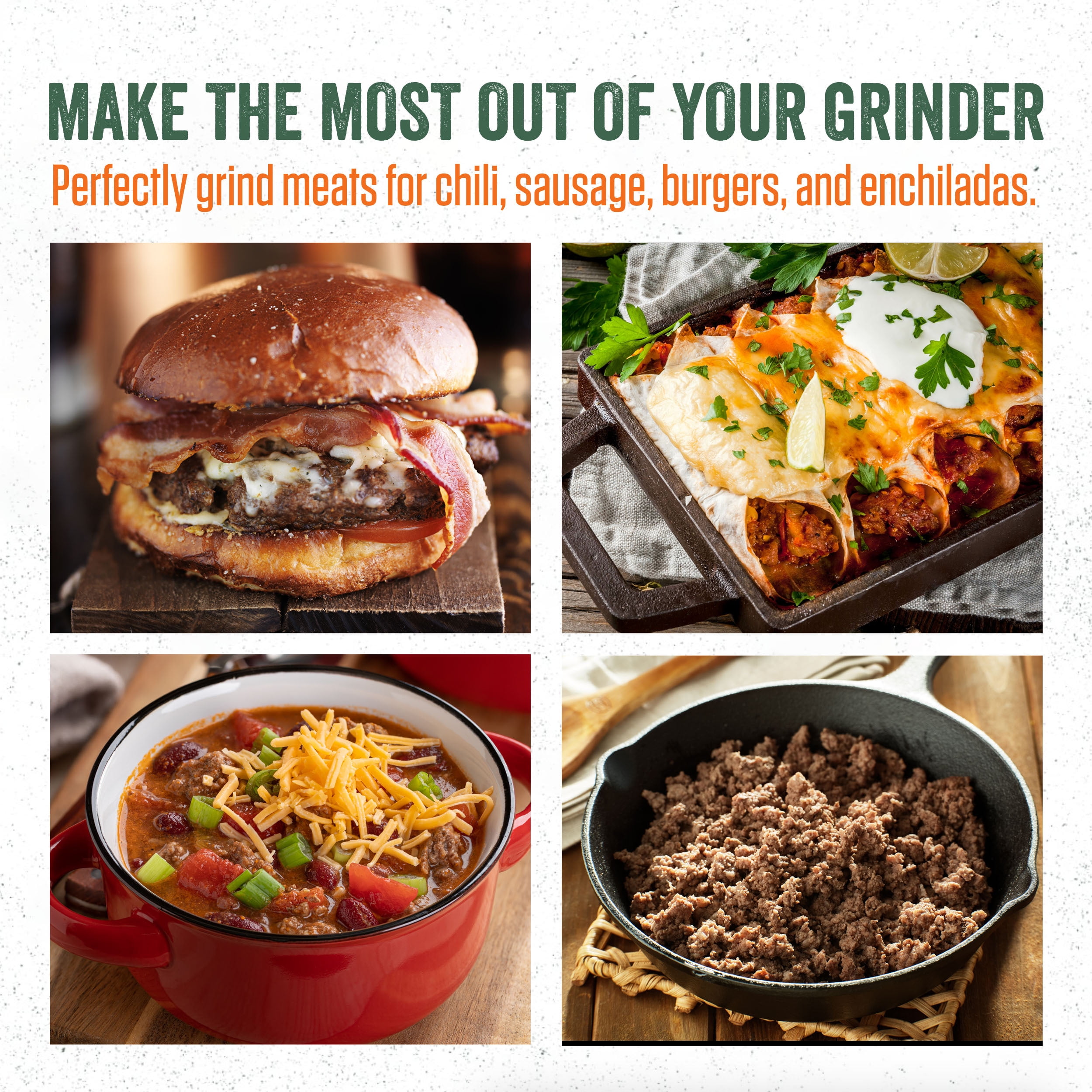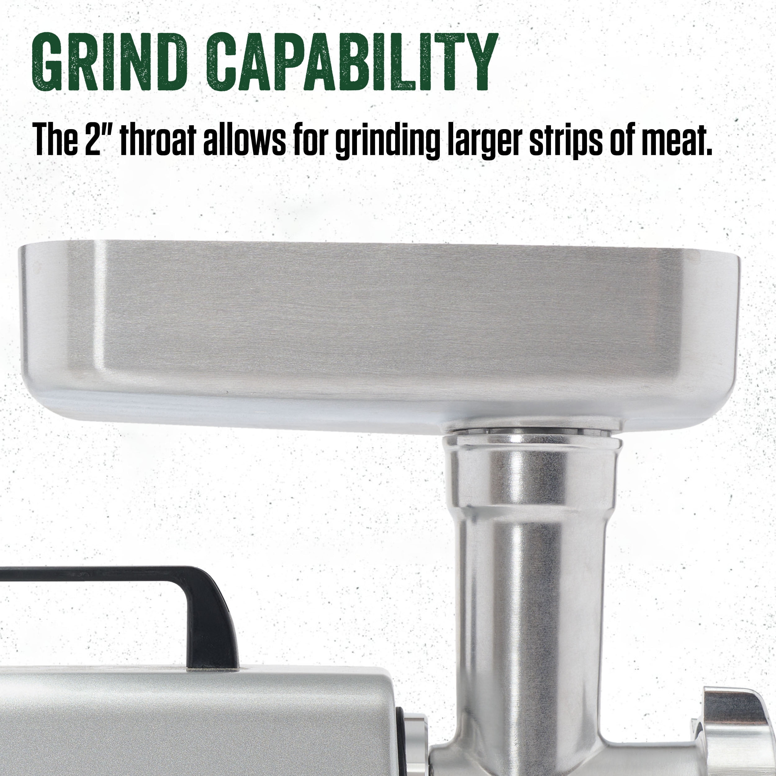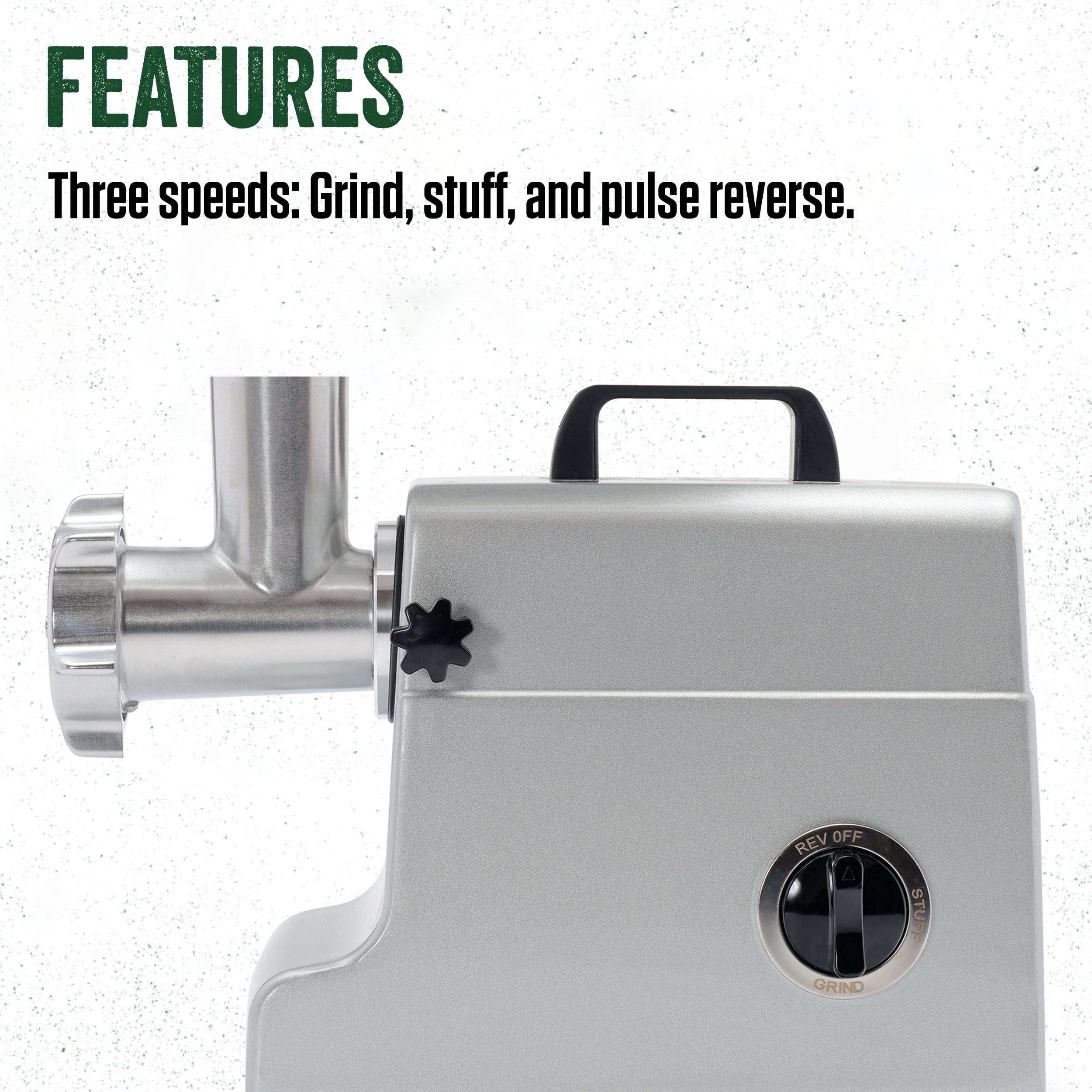 Durable aluminum motor housing and metal gears for long-lasting performance Heavy-duty handle for easy movement and operation 120-volt, permanently lubricated motor with full and slow speed plus reverse Built-in circuit breaker for added safety Includes stainless steel knife, aluminum head, auger, and meat pan Comes with stainless steel coarse (3/8″), fine (3/16″), and stuffing plates Offers 3 stuffing tubes (1/2″, 1″, 1-3/8″ OD) and a meat stomper for versatile sausage-making ETL approved and backed by a 2-year factory warranty Weighs 16.5 pounds for easy handling and storage