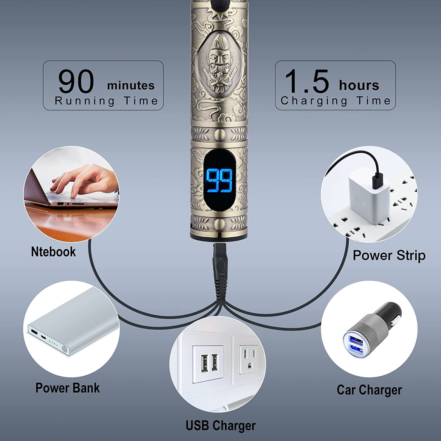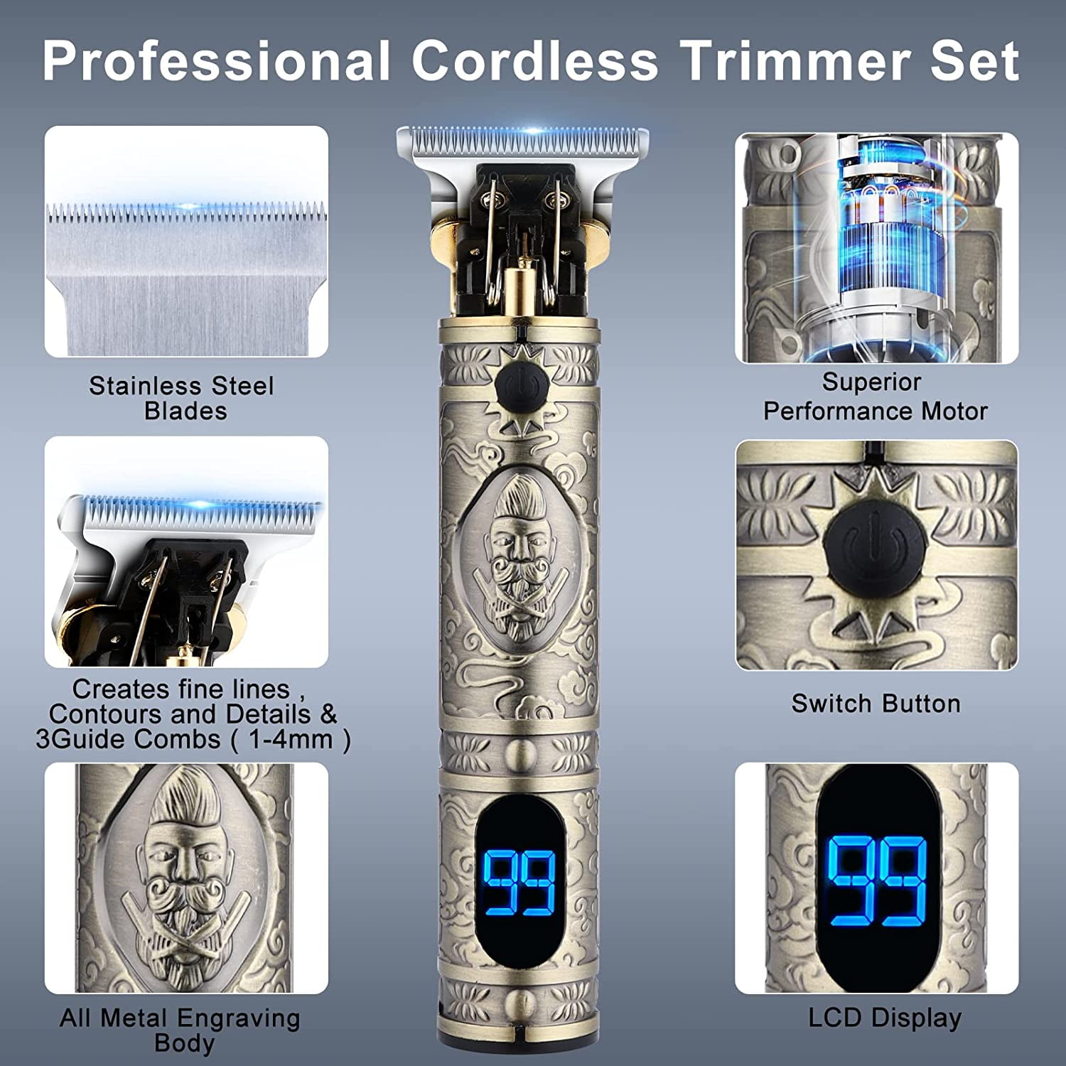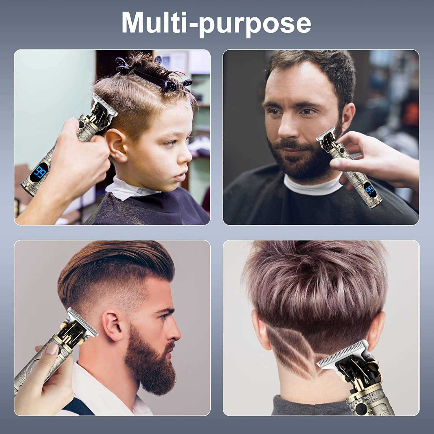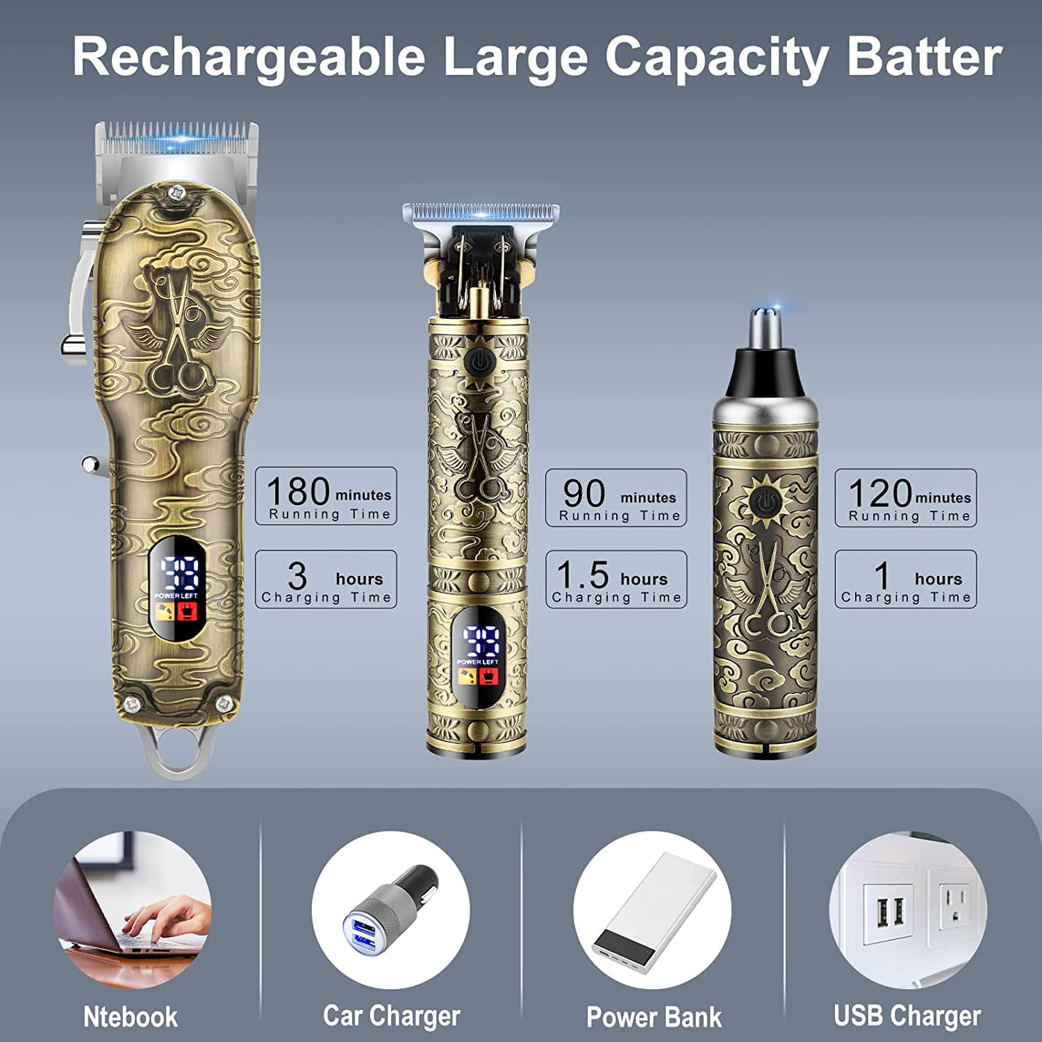 【Professional Cordless Hair Clipper + Trimmer +Nose Hair Trimmer Set】: This hair cutting kit contains everything you need to have a professional cut right in the comfort of your own home. Lemulegu professional clipper kit offers an easy way to cut your hair, which is also the first choices of the barber or stylist. 【Sharp & Durable High Carbon Steel Blade】: The blade of this barber clipper adopts precision high carbon steel blade, which can maintain long-term sharpness without pulling the hair. You can easily control the hair length and trim a variety of hairstyles with adjustable taper lever and guided combs. 【LCD Screen and Battery Life】: Built in LCD display that indicates when your hair clippers need to be oiled or charged. offers up to 180 minutes of running time with charging 3 hours for the hair clipper. 90 minutes of running time with charging 1.5 hours for the detailed trimmer.The nose hair trimmer which can provide 120 minutes of operation time with only one hour of charging 【Powerful & Quiet Motor】: This cordless clipper professional set has a powerful motor(10W) that provides a lifetime of superior performance.The noise when working is below 56db, not only suitable for men but also for kids at home all day long.