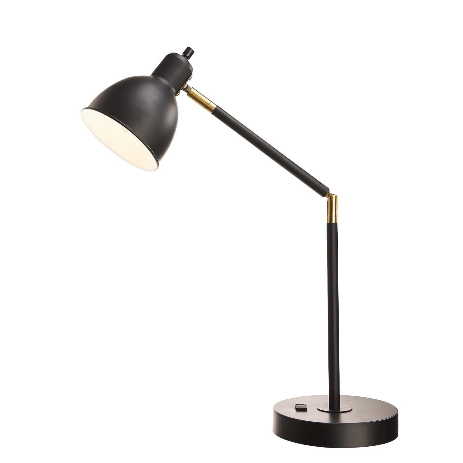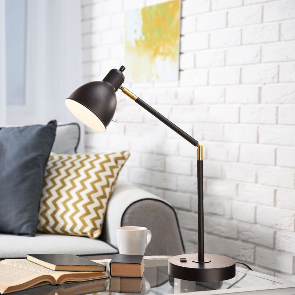 Versatile Desk Lamp: This stylish table lamp features a sturdy black metal body with antique brass accents, and is adjustable at 2 points for light where you need it Additional Outlet: The nightstand lamp features a convenient built-in AC power outlet on the base for charging electronic devices Stylish Living Room Decor: The sleek, modern desk lamp fits right in with your living room, office or bedroom decor Smart Home Compatible: This lamp can be set up using a smart outlet or smart switch (sold separately) to easily connect to Alexa, Google Home or any other smart home device Light Bulb Required: Uses (1) Type A 60-watt incandescent or LED equivalent bulb (not included) 100% Metal
