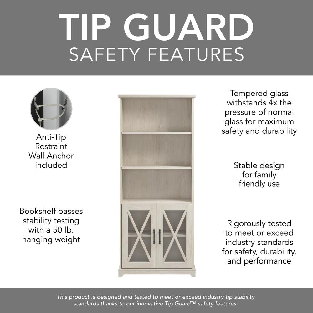 Tall Bookcase with Doors is ideal for organizing your personal library and displaying plants, pictures, and decorations Two shelves are fixed for stability while three can be raised or lowered to accommodate items of various sizes Each shelf supports up to 50 pounds, so you can store a collection of paperback and hardcover books with confidence Tempered glass doors with X pattern accents conceal materials while giving the bookshelf cabinet a stylish touch Tip Guard(TM) safety features and wall attachment hardware make the tall bookshelf a kid and pet-friendly choice Bookcase with glass doors’ distressed finish and hardware reflect the best elements of coastal and farmhouse styling Tall shelf’s stylish and practical design makes it a great fit for home offices, living rooms, and any other residential space Bush Furniture’s commitment to safety includes rigorous testing that meets or exceeds industry standards Farmhouse bookshelf is backed by a 1 Year Manufacturer’s Warranty Coordinating items in the Lennox Collection include home office desks, file and storage cabinets, living room tables, and more