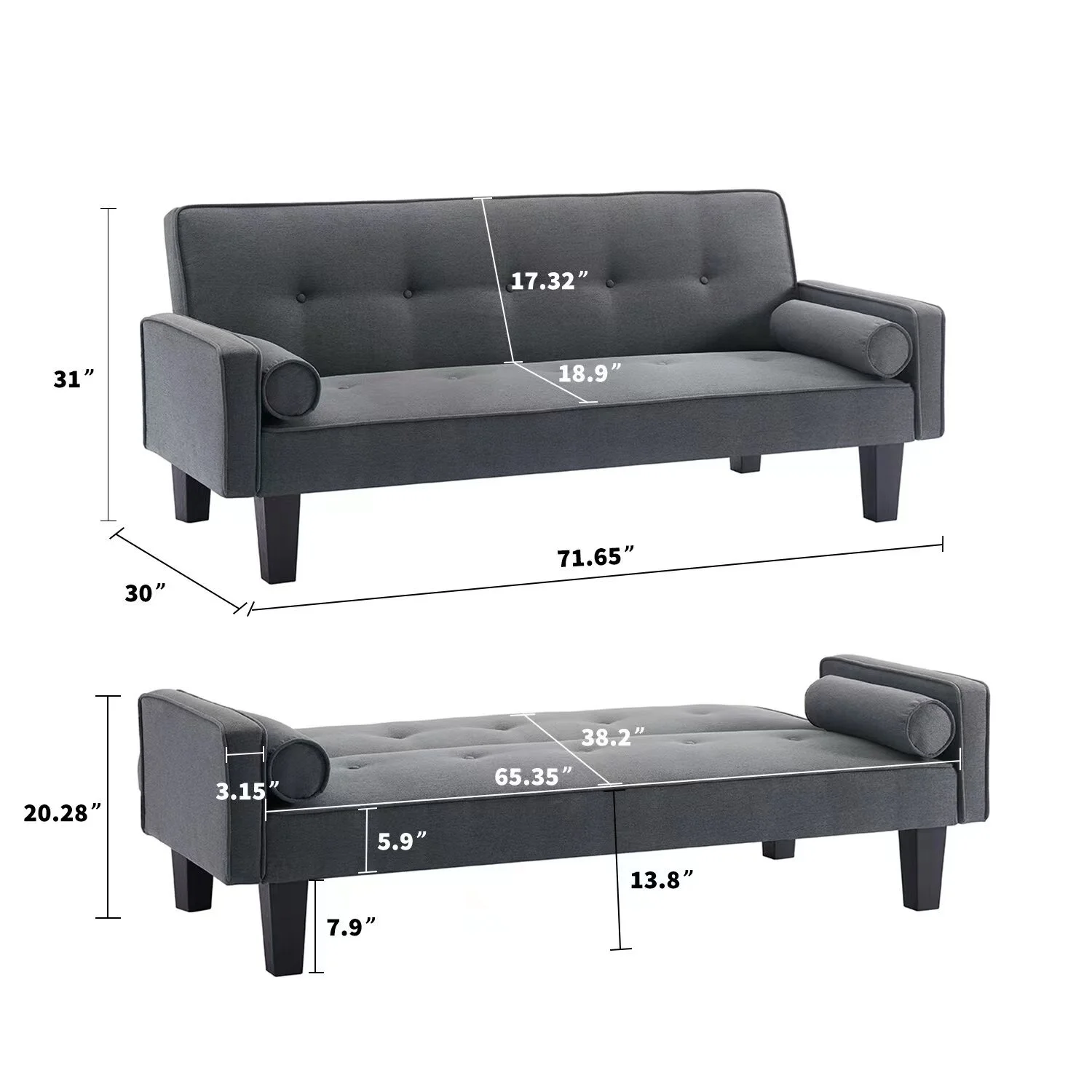72″ Modern Futon Sofa Bed Loveseat Convertible Sleeper Couch Daybed,Upholstered Folding Recliner,2-Seats Small Sofa Couches with Two Pillows Product Type: Convertible Sleeper Sofa Bed/Loveseat Sofa Couch Upholstery Material: Fabric Leg Material: Solid Wood Seat Fill Material: Foam Back Fill Material: Foam Frame Material: Solid + Manufactured Wood Seat Construction: Solid wood +serpentine spring Seating Capacity: 2-3 people Overall – sofa: 71.65”x30”x31”H Product Weight: 61.6 LBS Pillows Included: Yes Weight Capacity: 600LB Product Care: Wipe clean with a dry cloth Removable Cushion Location: armrests Assembly Required:Yes Product Dimensions Assembled Length (in.)71.65 Assembled Width (in.)30.00 Assembled Height (in.)31.00 Weight (lbs)61.60 Package Size Length (in.)66.90 Width (in.)39.30 Height (in.)7.10 Weight (lbs)68.34 Mid-Century Love Seat: With clean lines, sleek interiors and wooden legs, it’s a modern piece of design. With a simple yet refined structure, this sofa presents a minimalist style that emphasizes comfort and functionality. Comfortable Upholstery: The modern tufted velvet sofa with comfortable seat cushions provides support with reliable pull points to give any room a sophisticated look. The smooth, flawless texture facilitates this piece while adding extra comfort to the plush seat. With a generous depth, it is ideal for living rooms, bedrooms, apartments. Easy to assemble and install in 10 minutes. With backrest, solid wood feet and backrest that can be unfolded into a bed. Easy to Aseemble Convertible Daybed Upholstered sofa couch dimension: 71.65” x 30” x 31”H. Will be delivered in 1 package. All hardware is included in the package, no additional tools required. With the help of detailed instructions, you can easily assemble.