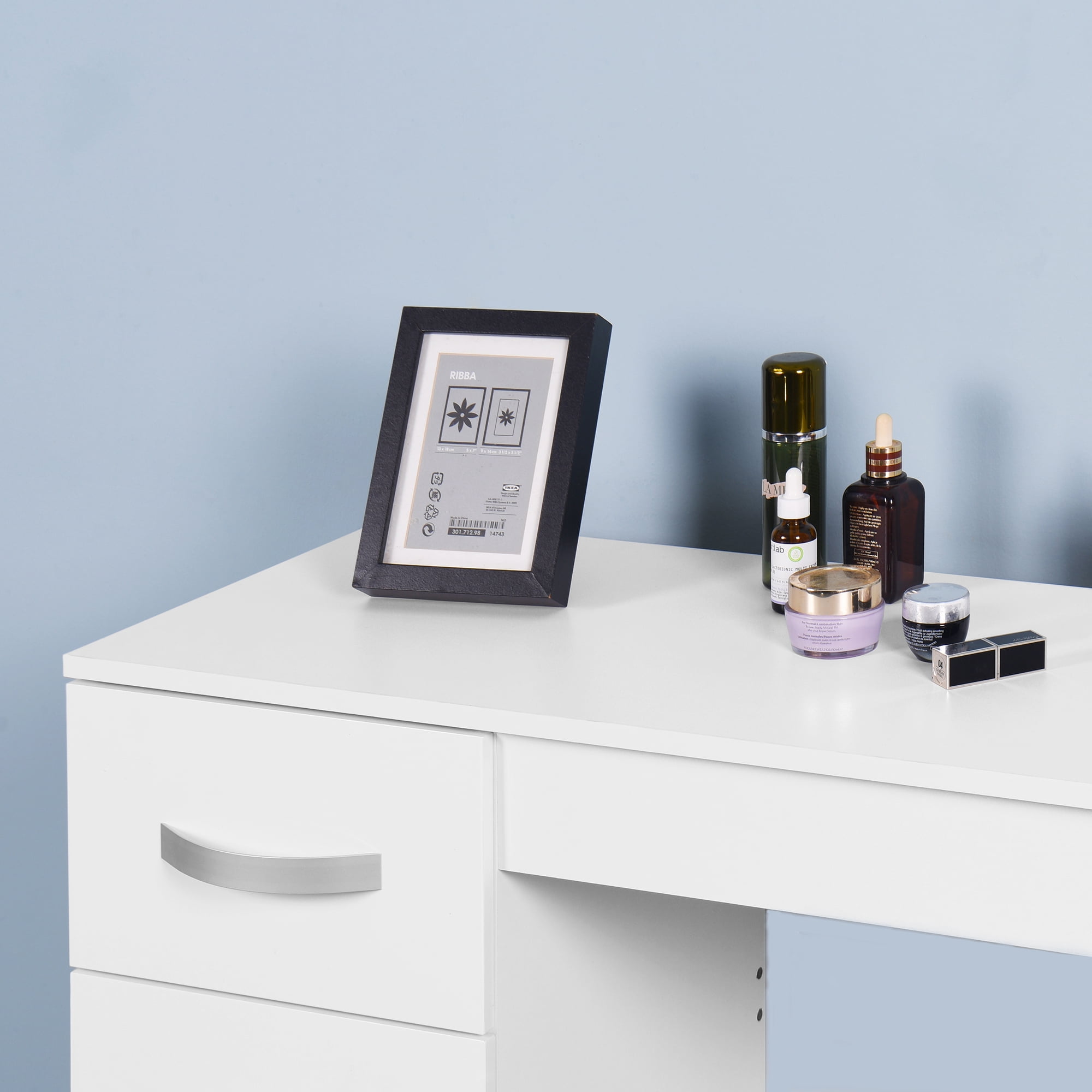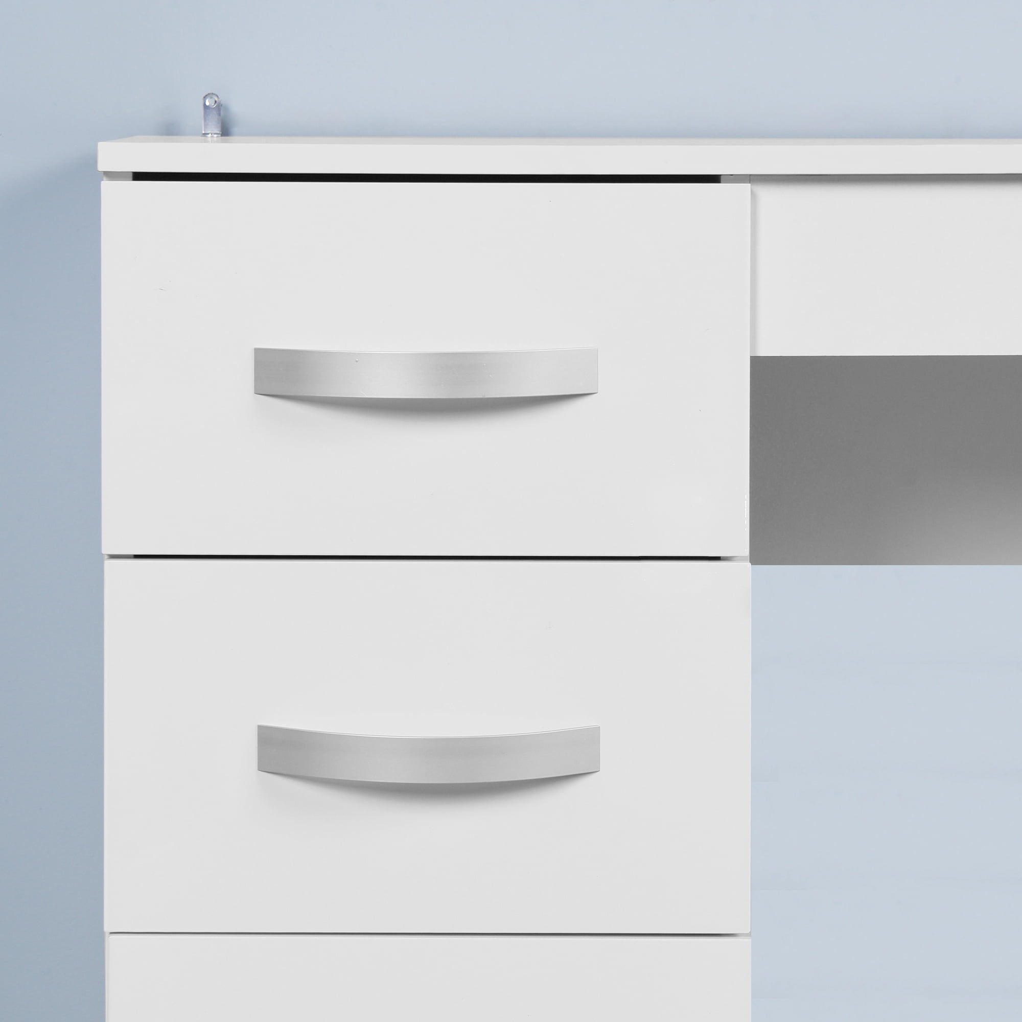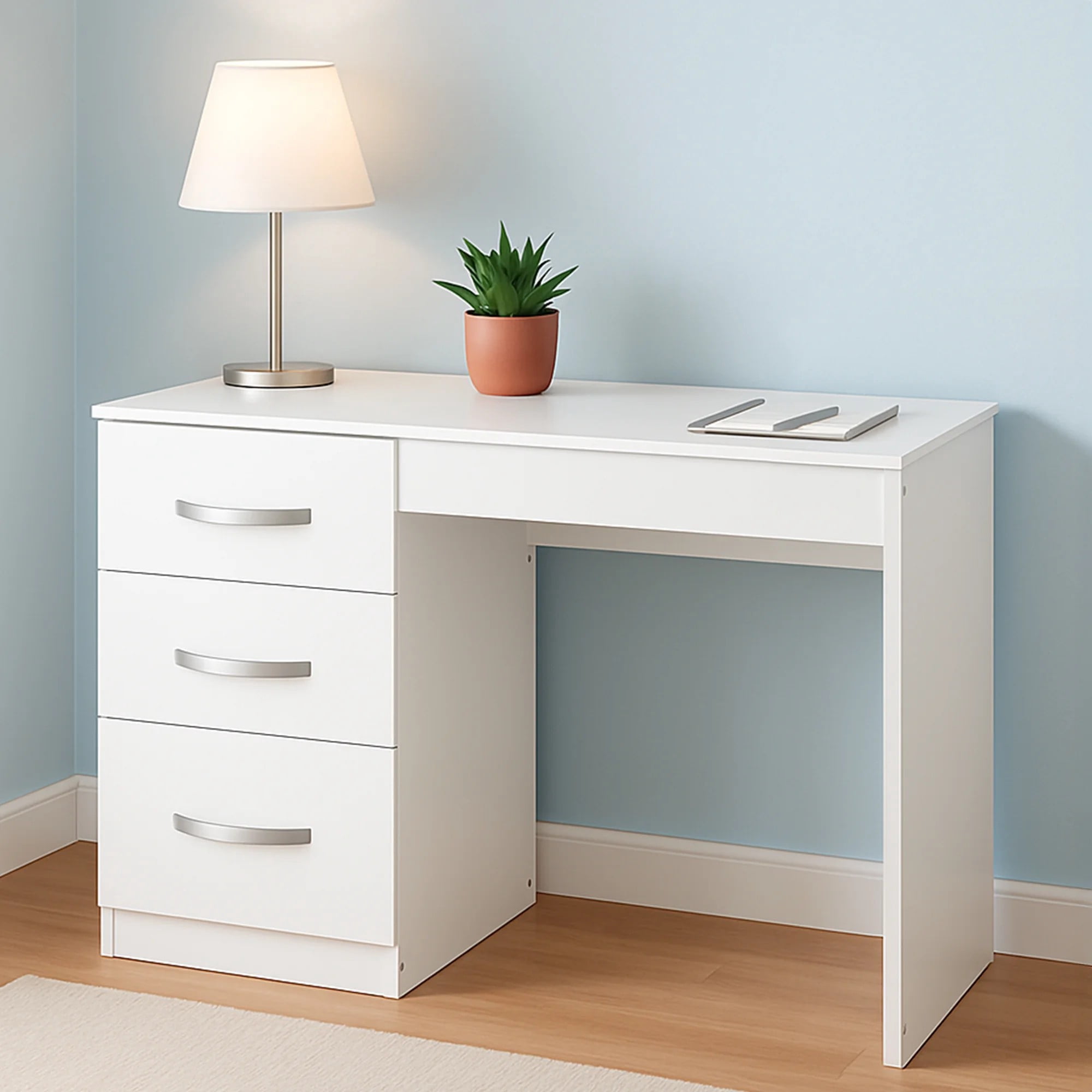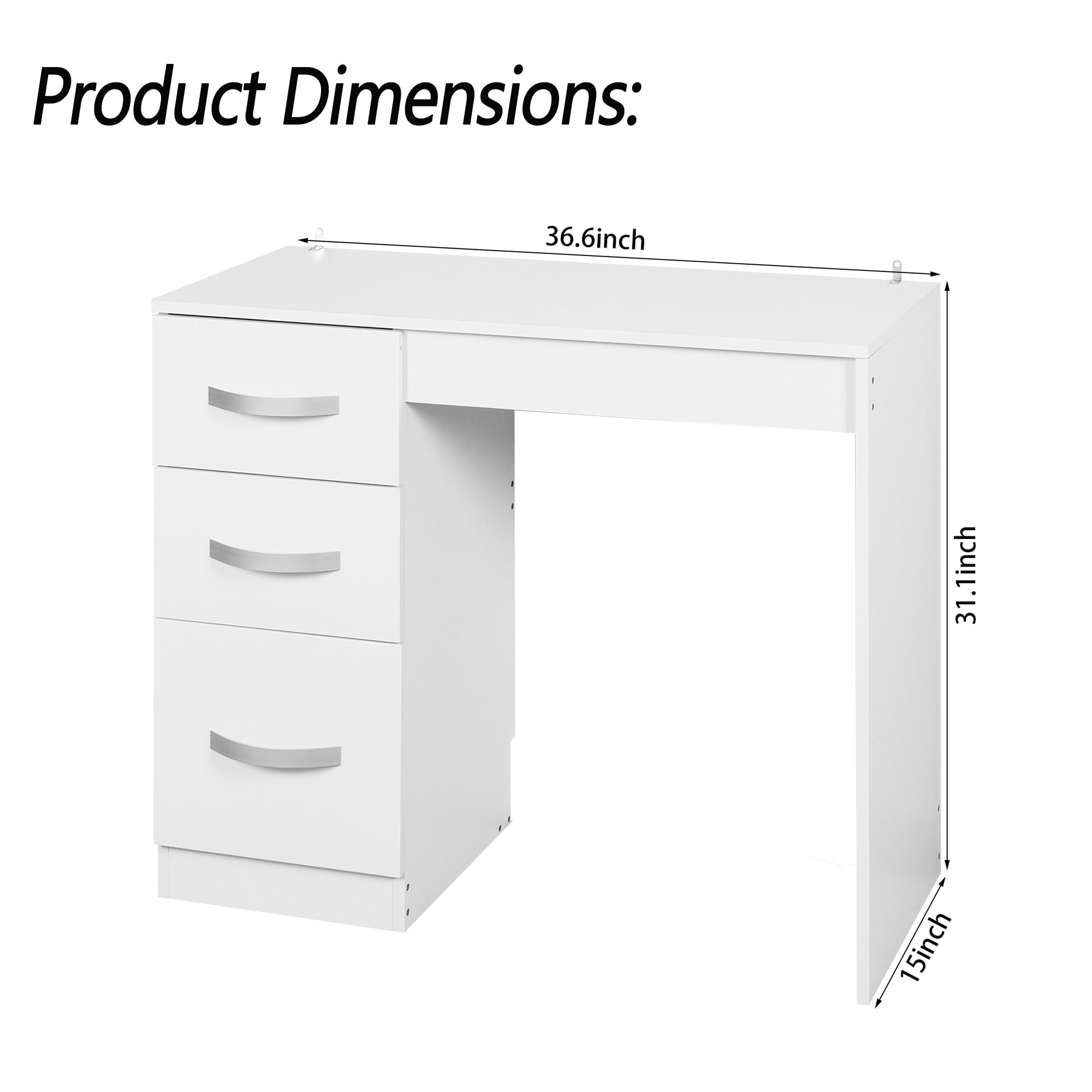 Are you still worrying about the small office space? Let our desk help you. The spacious desktop provides plenty of space for office supplies and work. This modern computer desk comes with 3 drawers to meet all your storage needs. This multifunctional desk is made of high density board and has a sturdy structure that can accompany you for long-term use. Its simple and stylish design adds charm to your home and or office, and can be used for study, office, entertainment, etc. Large desktop provides enough space for study and office Thickened load-bearing plate enhances stability and durability Chic and elegant style matches well with different home decoration Used as a laptop desk, study desk, writing workstation, vanity table, etc. Specifications: Color: White Material: MDF Dimensions: 36.6 x 15 x 31.1 inch Package includes: 1 x Table (Chair not included) 1 x Instructions 1 x Accessories Bag