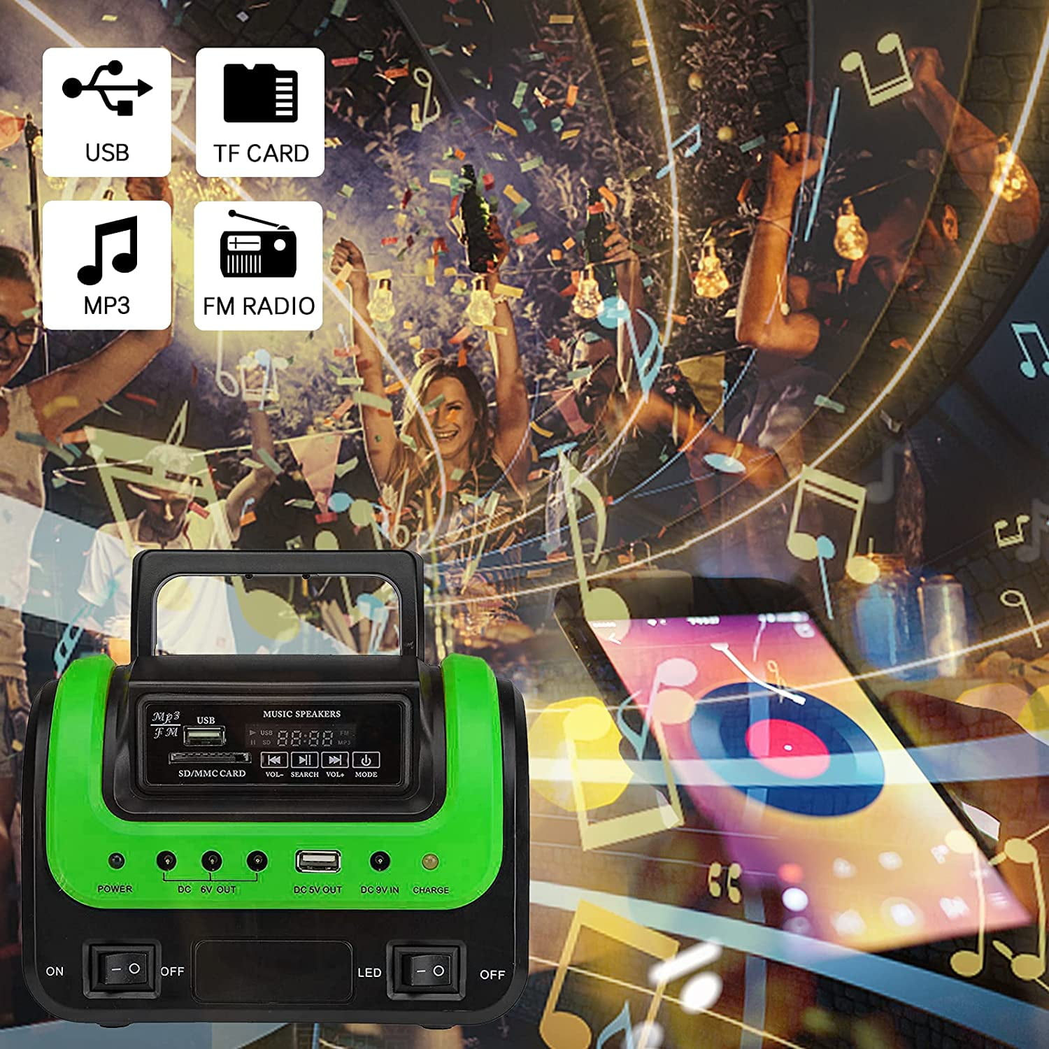 Features: * Rechargeable solar generator, solar charging, energy saving, can be used in sunny places. * Built-in MP3/FM Radio to play music. * Equipped with a USB charging cable, the large capacity can easily charge LED lights and mobile phones. * Suitable for indoor lighting, outdoor lighting, blackouts, camping, home lighting and areas without electricity. * Power storage function to help you store the power after solar charging. * When we are caught in natural disasters, such as hurricanes, snowstorms, etc. without power, when you and your family go camping or hiking without lights at night, when you are sitting in a broken down car, or staring at the side of the highway without power When you are on the phone, the emergency power supply with LED flashlight and reading light will be your best choice, it is designed for emergency preparedness, indoor home use or outdoor emergencies. * Lightweight, easy to carry with you, enjoy a unique outdoor lifestyle. Specification: Name: Radio Solar Emergency Light Solar panel: polycrystalline 5W/6V Solar panel cable length: 5m LED bulb: 3*3W Working time: 4 hours/bulb Charging time: 7 hours Radio size: 168*108*125mm Solar panel: 193*272*18mm Color: green/yellow Packing included: 1 * Solar Generator 3 * LED bulbs 1 * Solar Panel 1 * Input power cord 1 * 5 in 1 Output Charging Power Cord 1 * Remote Control