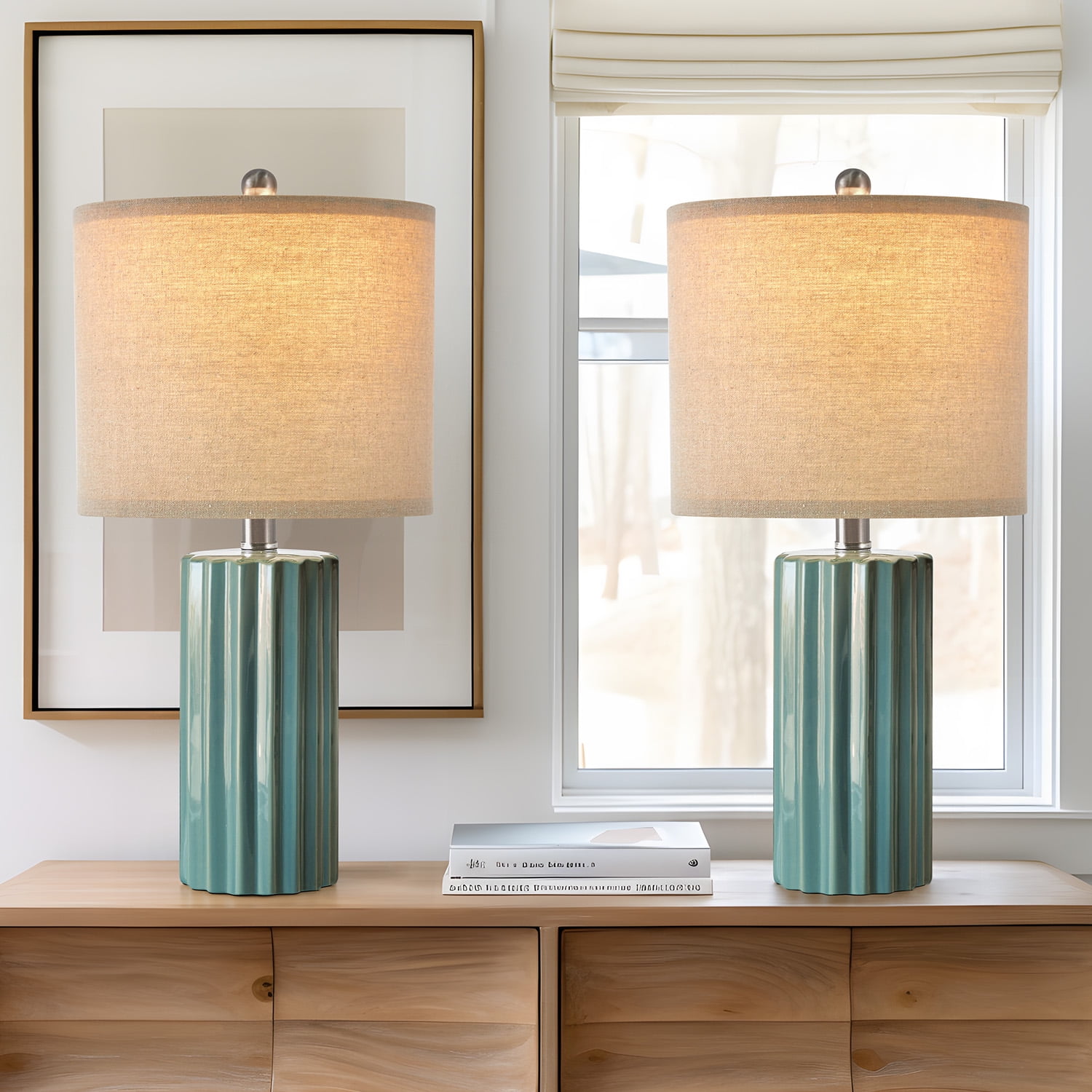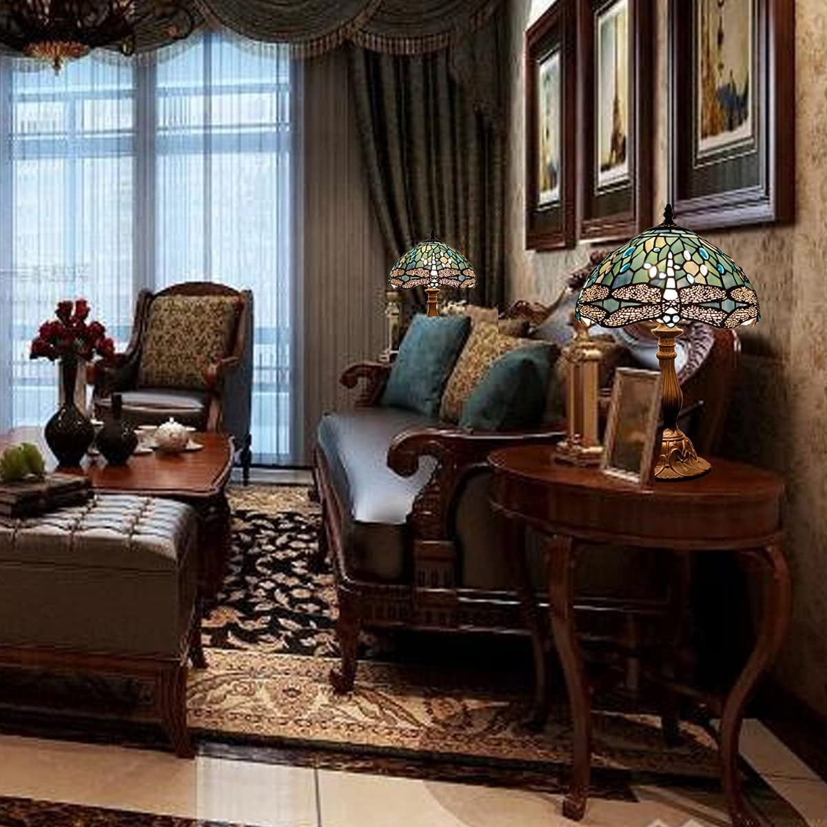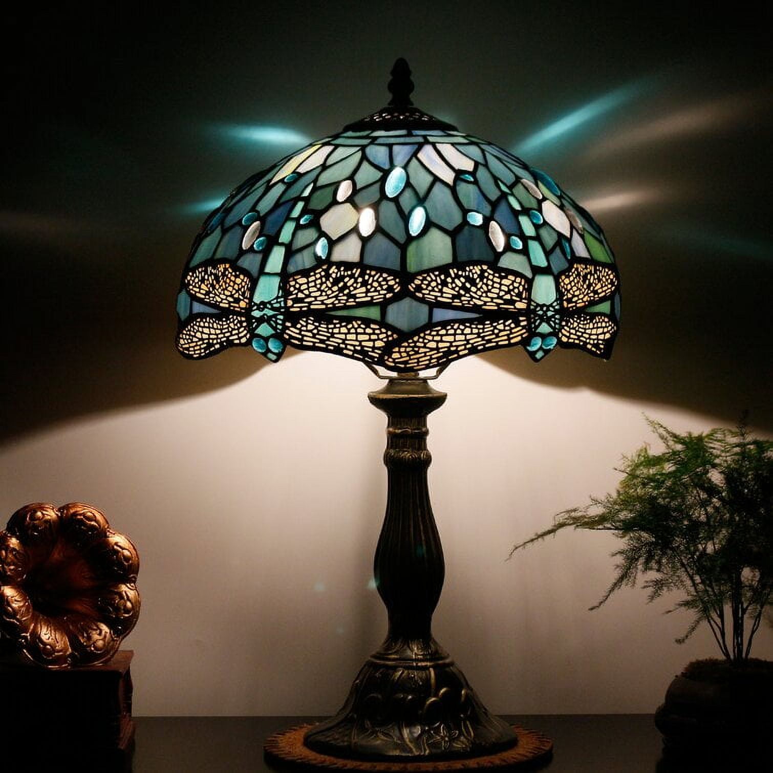 levang Tiffany Style Table Lamp Sea Blue Stained Glass Dragonfly Style Shade Antique Base