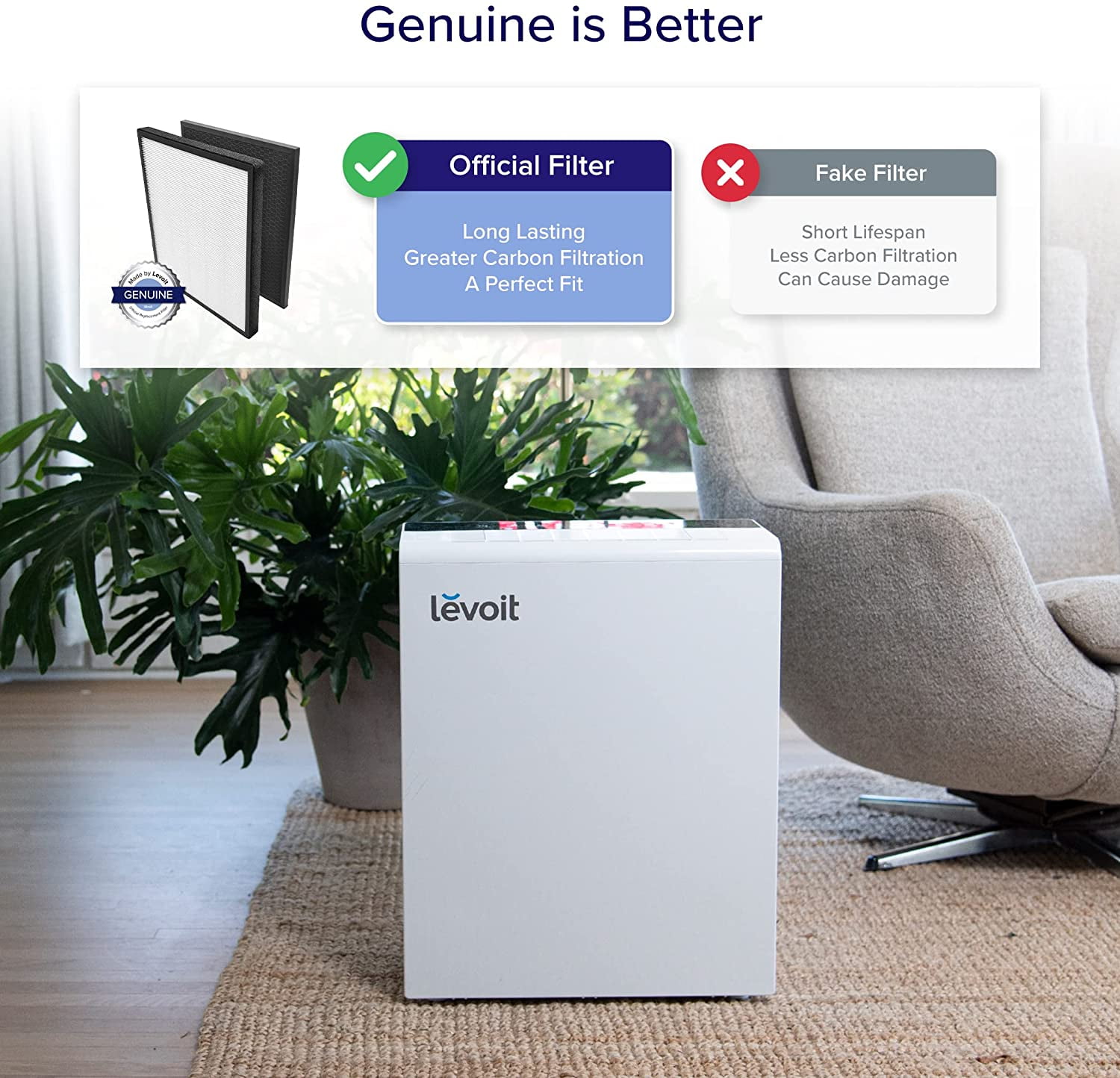 Ultra-fine Nylon Pre-Filter High-Grade Granular Activated carbon Filter Only use genuine Levoit replacement parts to maintain the best performance. Off-brand filters are inconsistent, unreliable, and may damage the air purifier. Buy With Confidence: Filters are sealed to protect their service time. Remove the plastic packaging of the new filters before running the air purifier. Hassle-Free Warranty and Friendly Customer Support Team-Based in California.