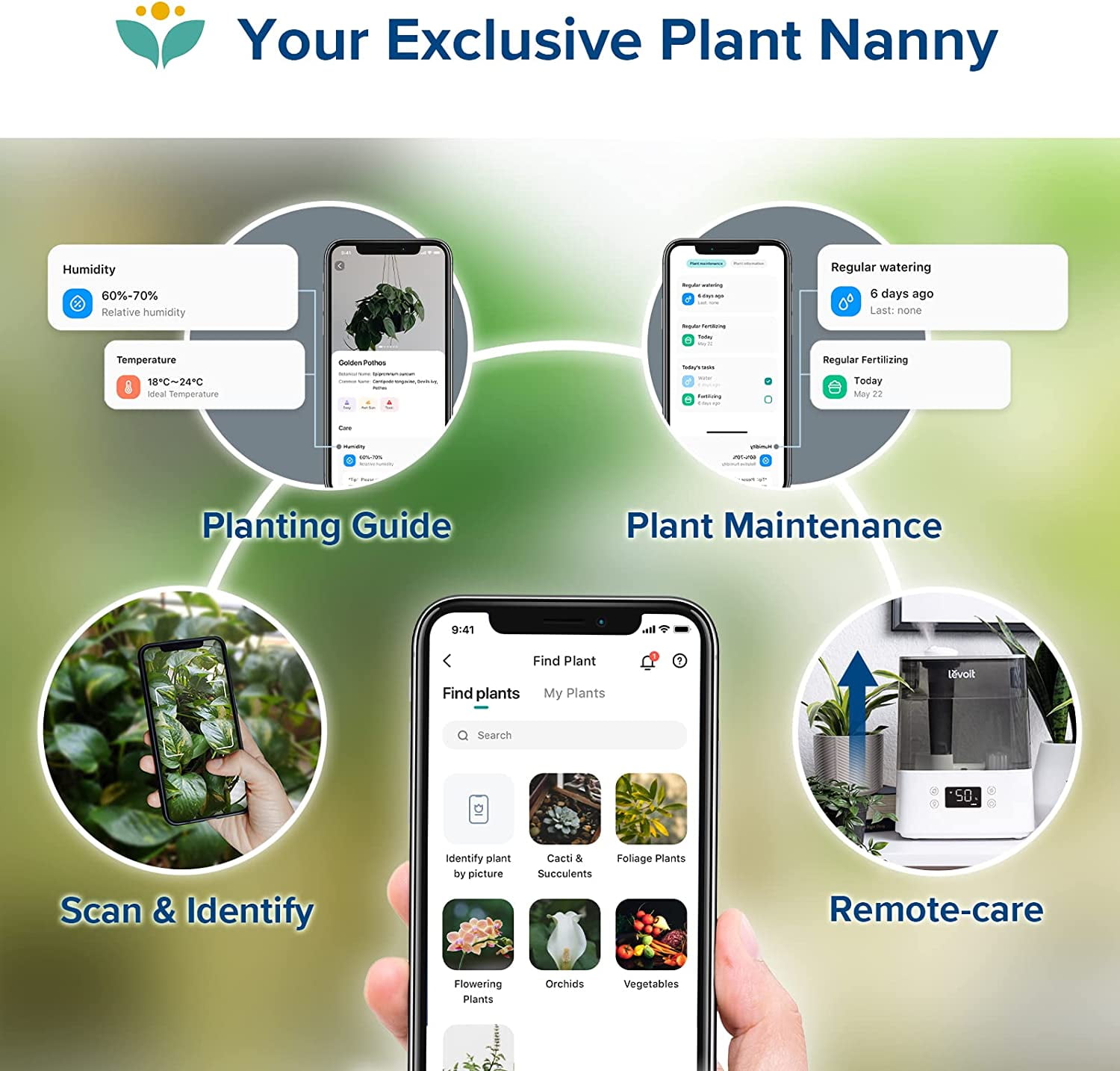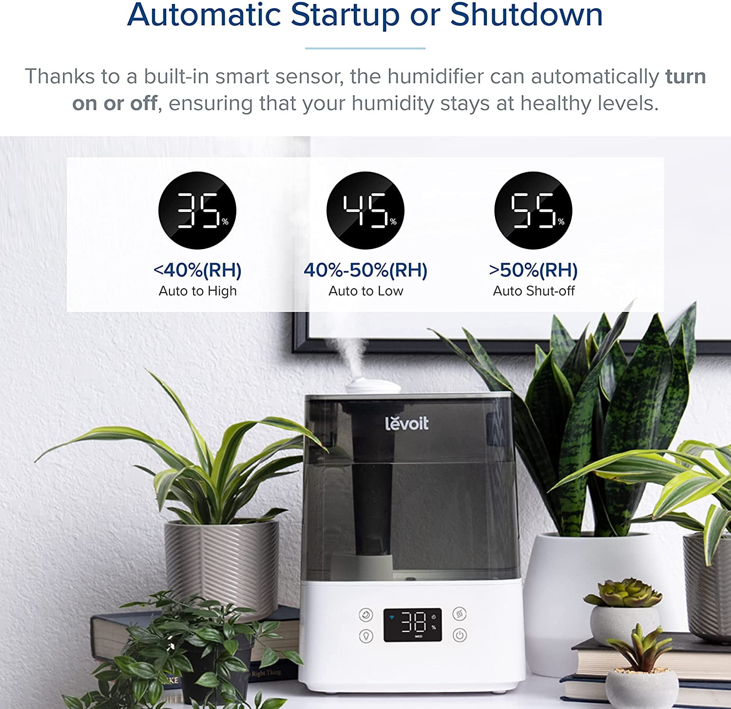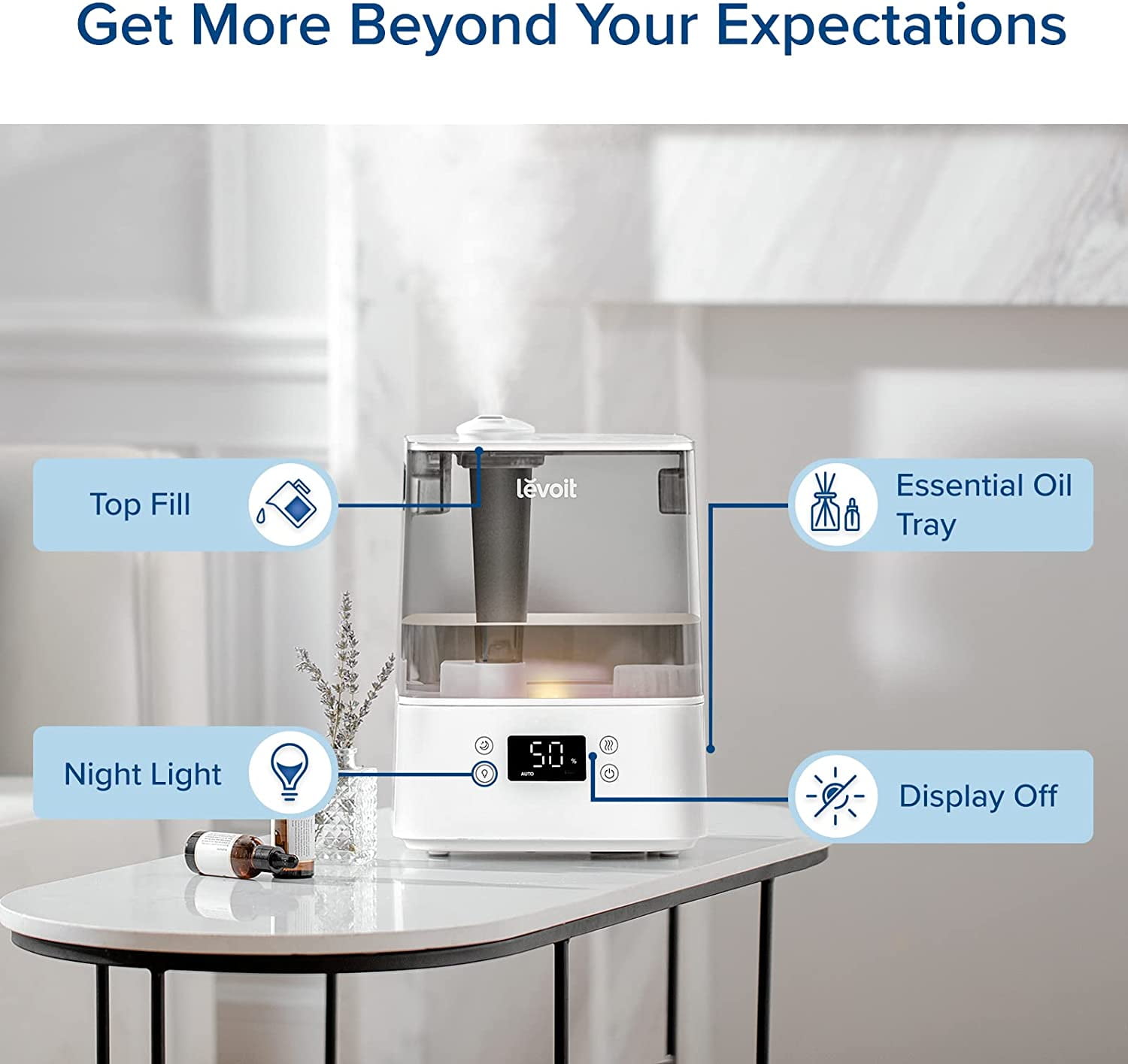 ✔️ New colors recommended by brand owners:Classic300s White 【Click me】 Levoit Cool Mist Humidifier for Room, Ultrasonic Smart Top Fill for Large Rooms, Bedrooms with Nightlight,Aromatherapy,6L, Classic 300S,Gray It is recommended to buy from the brand owner of VeSync Co. and to ensure you get a 2-year warranty and after-sales service! Cautious: other unauthorized sellers have no warranty guaranteed! A smart humidifier makes enjoying comfortable humidity more convenient. With smart scheduling in the vesync app, you don’t have to be at home to turn the humidifier on and off. Opening auto mode the smart humidifier will the free vesync app helps you stay aware of your home’s humidity level at any time. what’s more, you can connect to a third-party smart voice assistant to free your hands.In addition to the most basic plant humidification, it also provides you with a more comprehensive plant care program. Including scanning identification, a more professional encyclopedia, and professionally customized plant management. Equipped 6L large tank,the cool mist humidifier can run for up to 60 hours, giving you 7 nights of comfortable sleep without frequent water addition. With a mist output of up to 500 mL/hr, the vaporizers and humidifiers for room can easily handle spaces as large as 753 ft² / 70 m². Perfect Coverage of the large room, office, and the whole house. Unexpected 4 times faster humidification helps to quickly relieve itchy skin, sore throat, and sinusitis caused by dry air. The large opening makes refilling and cleaning the tank easy. With the design of top-fill,you only need to open the lid to add water in one step enjoying the convenience of a zero-leakage designed product. This baby-friendly humidifier running at just 30dB is nearly silent. Sleep mode and auto-off feature for a restful night’s sleep.The humidifier’s mist level will switch to low and turn off the display lights creating a sleep-friendly atmosphere for a light sleeper. Add your favorite essential oil to the aroma box for pleasant aroma experience and relax your mind. We are the customer reports recommend brand that gives you a 2-year warranty & satisfaction guarantee. If more Water Filte sponges are needed: 【Click me 】