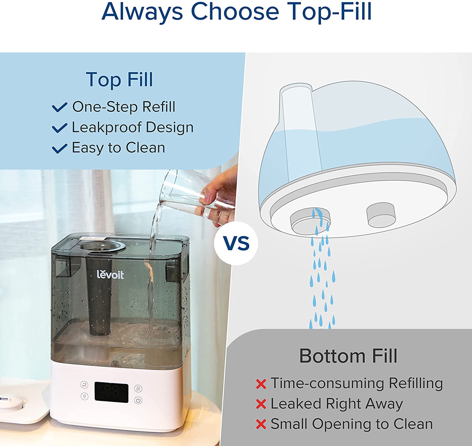 Highlights: Extra Large Water Tank: 1. 59 gal / 6 L. Effective Range: 215–505 ft² / 20–47 m². Perfect for large rooms! Run Time: Up to 60 hours. 7 nights of sleep. Quiet Operation: ≤ 30dB. Material: BPA-free, suitable for babies and adults What Makes Us Stand Out! Easy Top-Fill Design: One-Step Refill. Leakproof Design. Easy to Clean. Authoritative Media Endorsements: Top Pick by Wirecutter: “The Best Humidifier”. Wi-Fi Smart Humidifier: APP&Voice Control. Set Schedule. Timer. Exclusive Plants Caring Feature. User Friendly: Three control methods: touch panel, App, Voice control Smart Built-in Humidity Sensor & LED Display. Optional Night Light and Display Off. Comes with Cleaning Brush. Dishwasher-Safe Tank 360° Rotating Nozzle. 2 Year Warranty What’s in the Box? 1 × 6L Ultrasonic Smart Top-Fill Humidifier 2 × Water Filter Sponges (1 Pre-Installed) 3 × Aroma Pads (1 Pre-Installed) 1 × Cleaning Brush 1 × User Manual Why Levoit? Hassle-Free 2-Year Warranty and Customer Support Team-Based in California. ETL Listed & Automatic Shut-Off & BPA-Free for Water Tank.