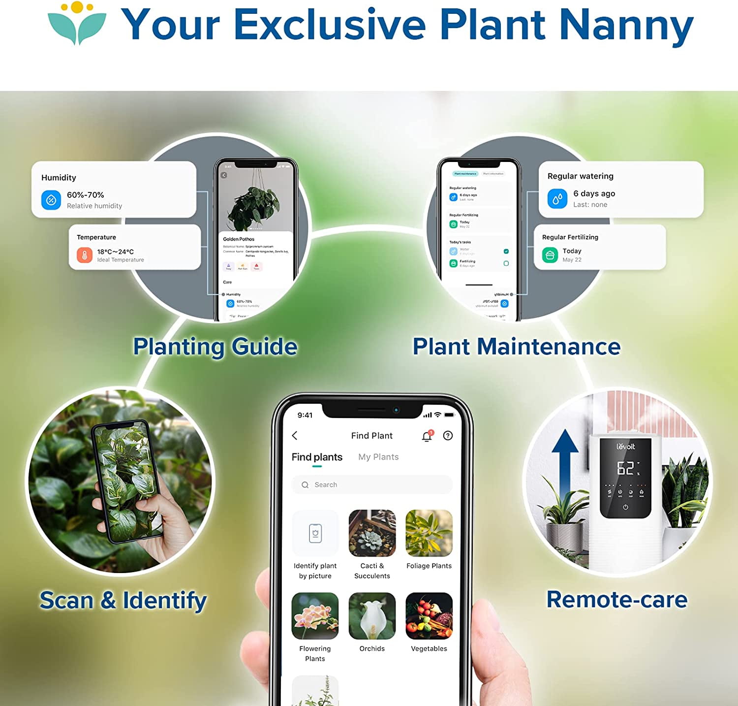 Large Water Tank: 1. 18 gal / 4.5 L Levoit Patented cold and warm mist mixing technology Dual 360-degree Rotating Nozzle Handle Design Set schedule Automatic Shut-Off Adjustable Mist Levels Exclusive plant care features Healthy Mist, Reduces Dust 4x Faster Humidification Optional Lights Off Easy to Scrub Clean Water Tank Effective Range: 215-430 ft² / 20-40 m². Perfect for bedrooms and nurseries! Essential Oil Easy Top-Fill Design APP & voice control Ultra-Quiet Operation: Run Time: Up to 45 hours.