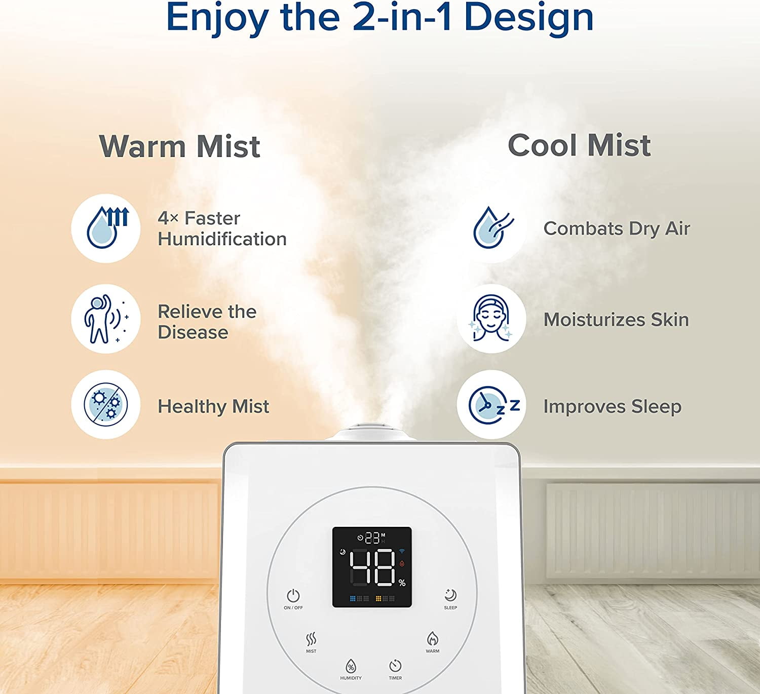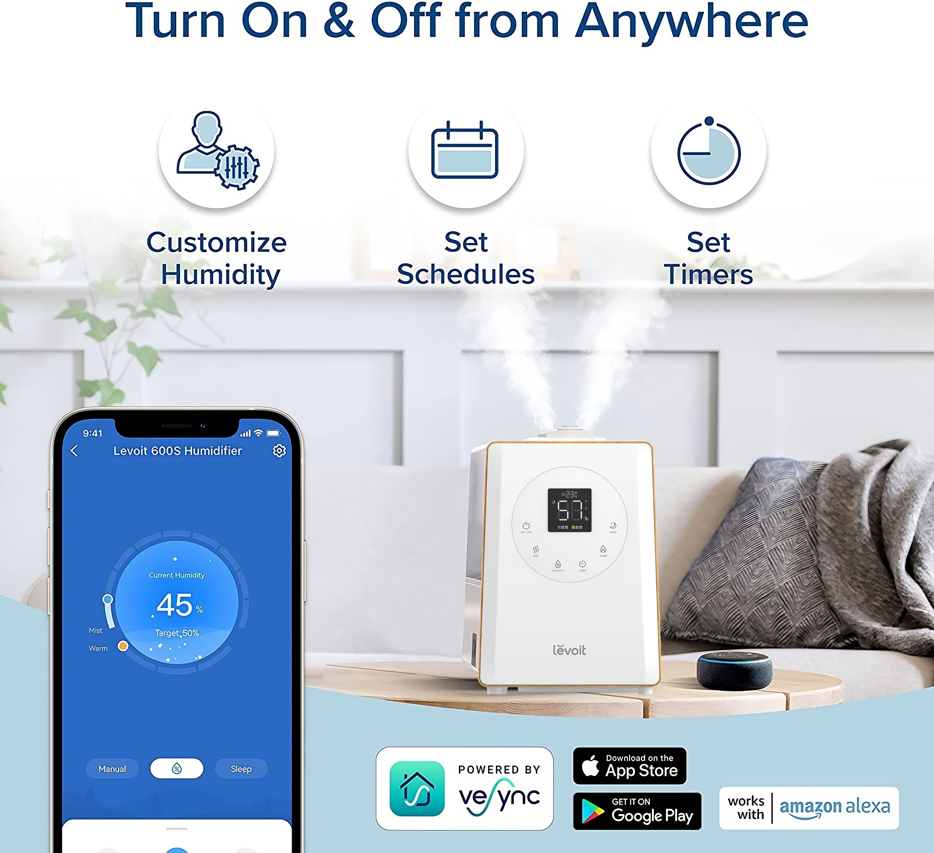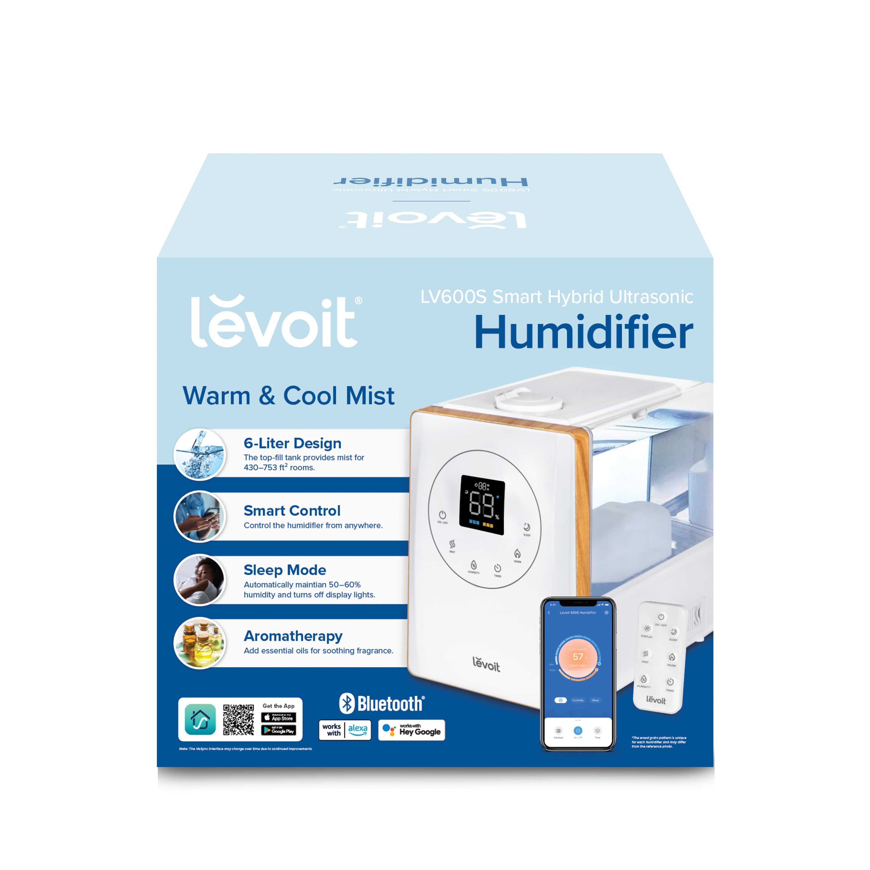Highlights: Extra Large Water Tank: 1. 59 gal / 6 L. Effective Range: 430-753 ft² / 40- 70 m² Run Time: Up to 60 hours. 7 nights of sleep. Ultra-Quiet Operation: 25dB (Cool)/45dB (Warm) What Makes Us Stand Out! Easy Top-Fill Design: One-Step Refill. Leakproof Design. Easy to Clean. Patent Warm and Cool Mist Hybrid Technology: 4x Faster Humidification. Healthy Mist, Less Dust. Wi-Fi Smart Humidifier: Voice Control. Set Customized Humidity. Schedule & Timer. Exclusive Plants Caring Feature. User Friendly: Smart Built-in Humidity Sensor & LED Display. Easy Auto Mode. Convenient Smart & Voice Control. Aromatherapy. Package Included: 1 x Smart Ultrasonic Humidifier 1 x Remote Control 1 x Cleaning Brush 3 x Aroma Pads (1 pre-installed) 3 x Absorption Pads (1 pre-installed) 2 x Water Filter Sponge (1 pre-installed) 1 x User Manual 1 x Quick Start Guide Why Levoit? Hassle-Free Warranty and Friendly Customer Support Team-Based in California. ETL Listed & Automatic Shutoff & BPA-Free for Water Tank.