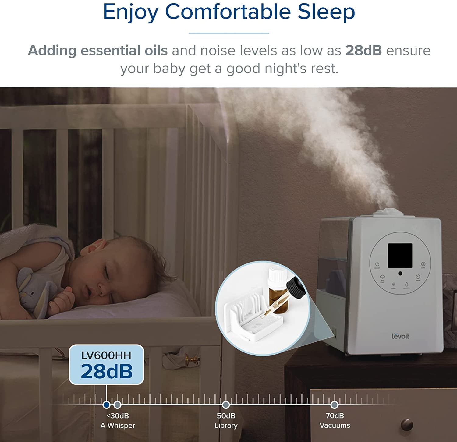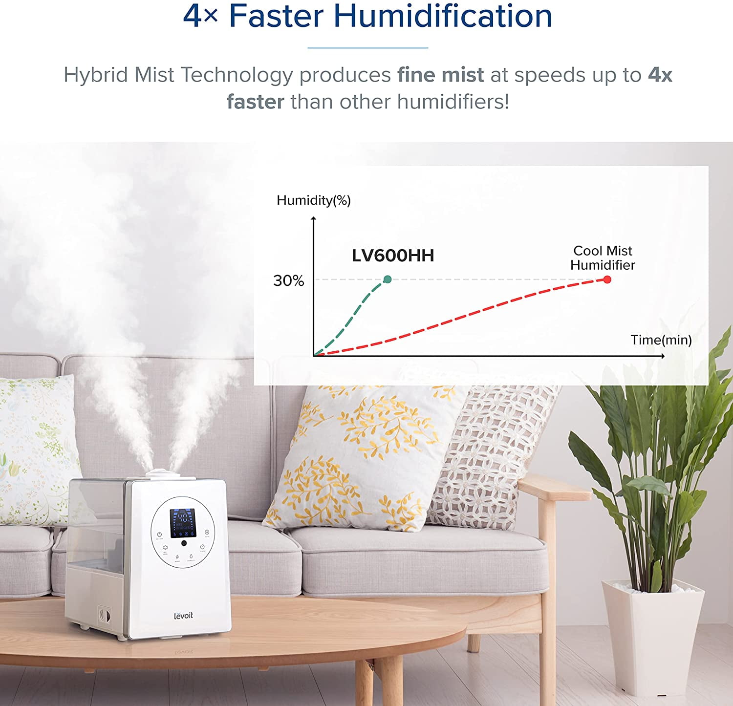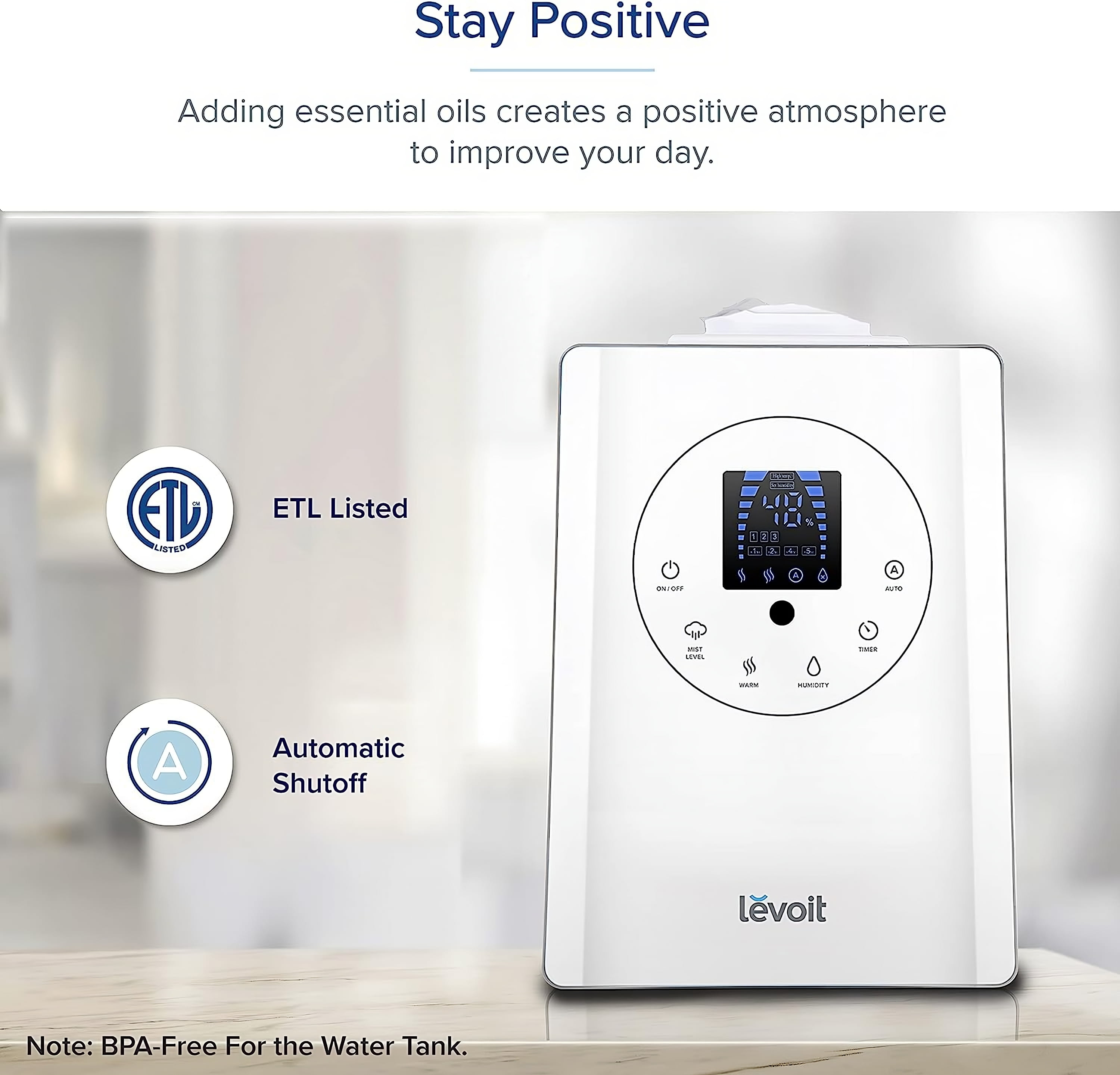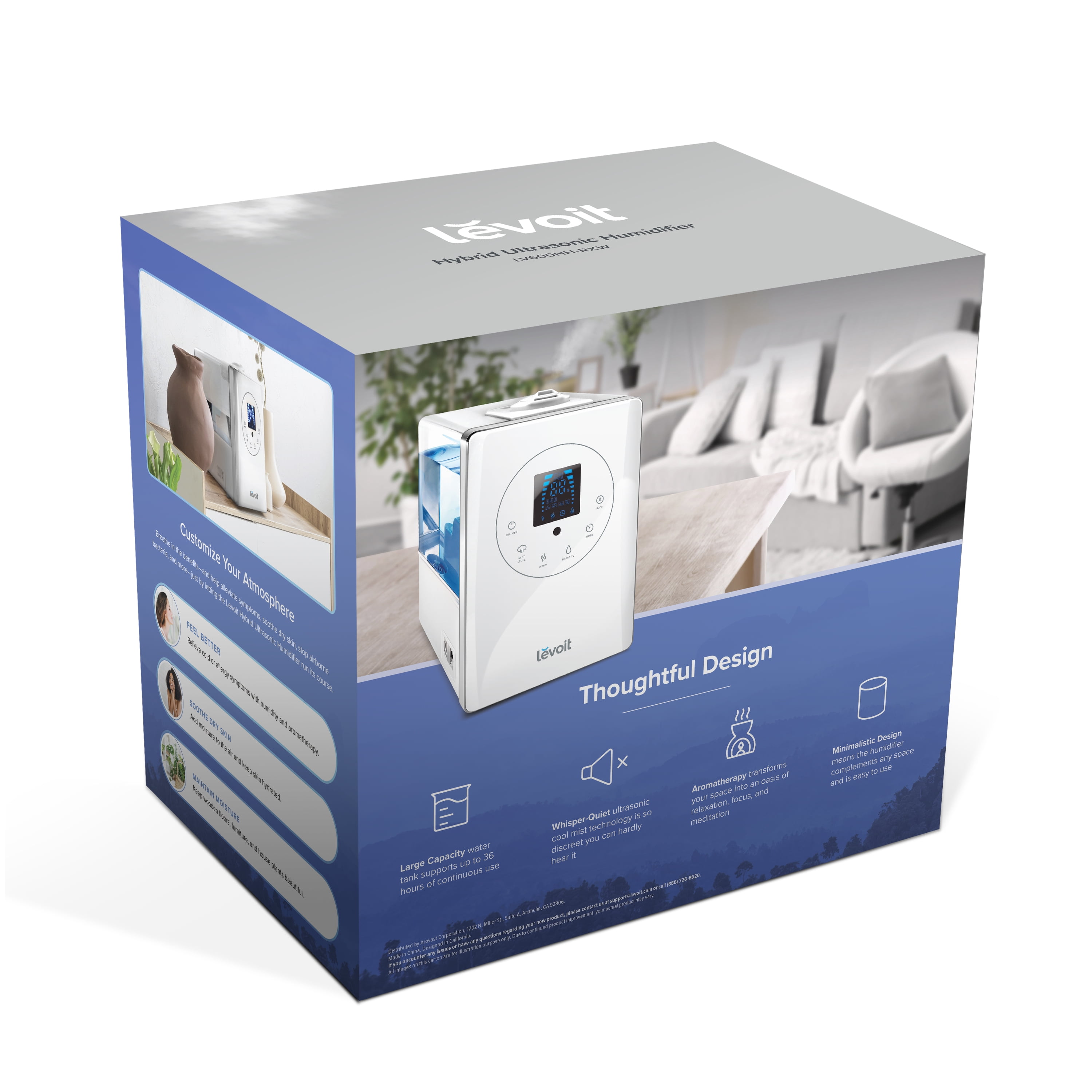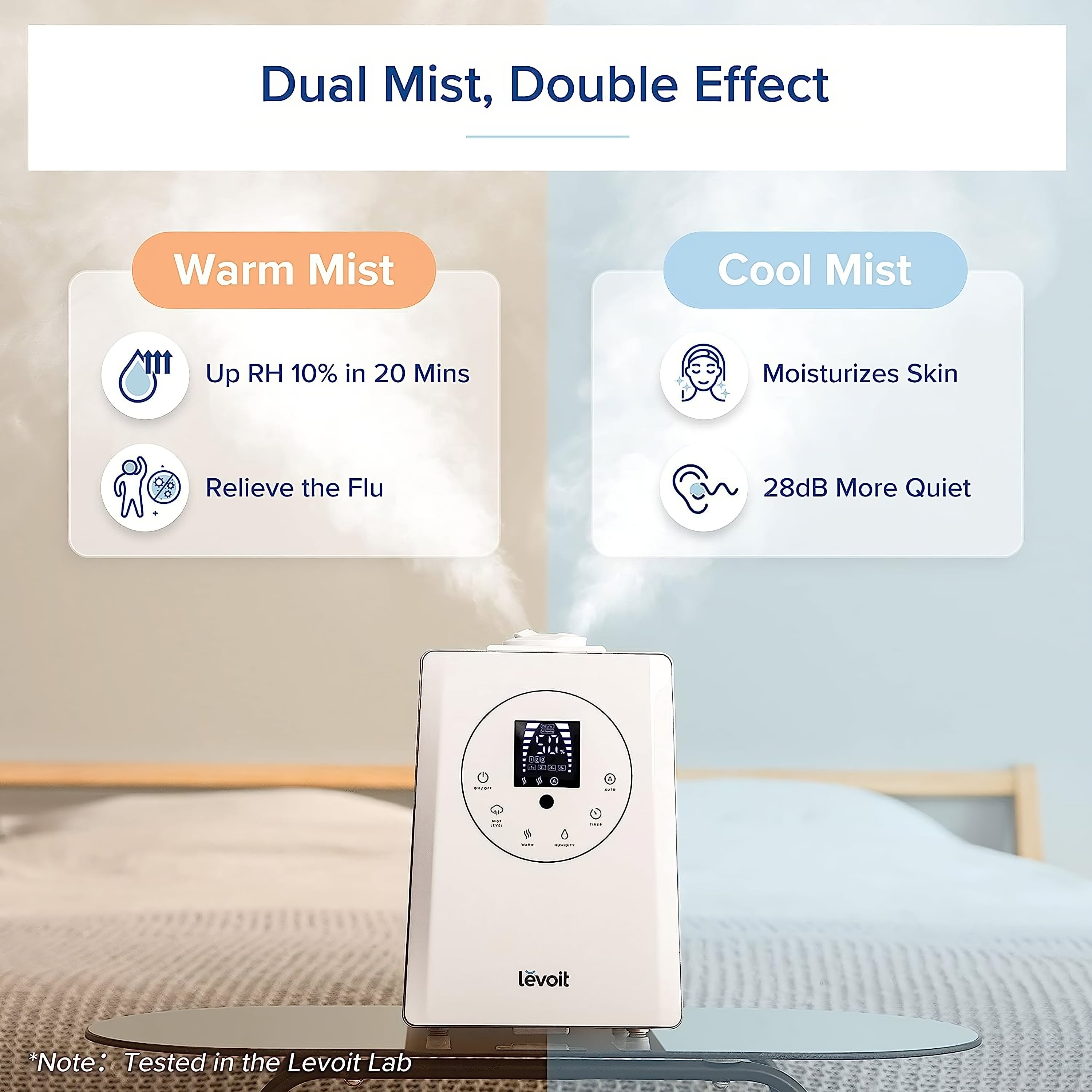 Specification Extra Large Water Tank: 1. 59 gal / 6 L. Effective Range: 430-753 ft² / 40- 70 m². Perfect for extra-large rooms! Run Time: Up to 60 hours. 7 nights of sleep. Quiet Operation: ≤ 28dB (Cool)/≤ 36dB (Warm). Material: BPA-free, suitable for babies and adults. User Friendly: 360° Rotating Nozzle. Aromatherapy. Remote Control Adjustable Mist Levels. Dishwasher-Safe Tank. Auto Shut-off. LED Control Panel, Comes with a Cleaning Brush. 2-year warranty. 86°F-140°F, no risk of Burns, unlike other Warm What Makes Us Stand Out! Patent Warm and Cool Mist Hybrid Technology: 4x Faster Humidification. Healthy Mist, Less Dust. Authoritative Media Endorsements: Wire cutter Pick: “A Humidifier for Super-Dry Space!” Good Housekeeping Pick: “Best Humidifier for Large Rooms!” What’s in the Box? 1 x Warm and Cool Mist Humidifier 5 x Absorption Pads (1 pre-installed) 5 x Aroma Pads (1 pre-installed) 1 x Remote Control 1 x Cleaning Brush 1 x User Manual Why Levoit? Hassle-Free 2-Year Warranty and Friendly Customer Support Team-Based in California. Our Commitment to Fresh Air: Since 2019, Le has planted 2,000 trees through our partnership with We Forest. Trusted by 3M+ Customers: LEVOIT brings fresh air to over 3 million customers worldwide.