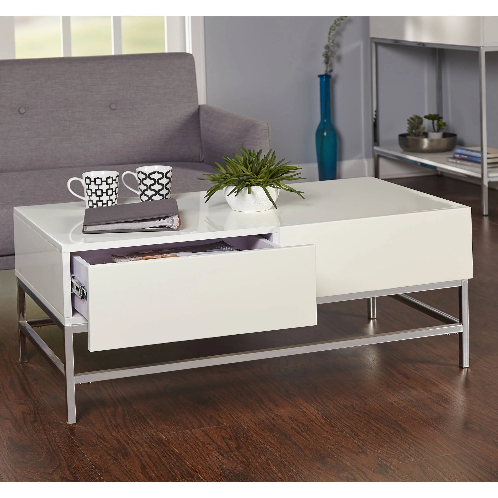Lewis Occasional Coffee Table, White: Includes 1 occasional coffee table Materials: MDF with high gloss, Metal Finish: White Two concealed drawers perfect for small keepsakes Dimensions: 43.3″ wide x 23.6″ deep x 18″ high Requires some assembly Model# WM724020