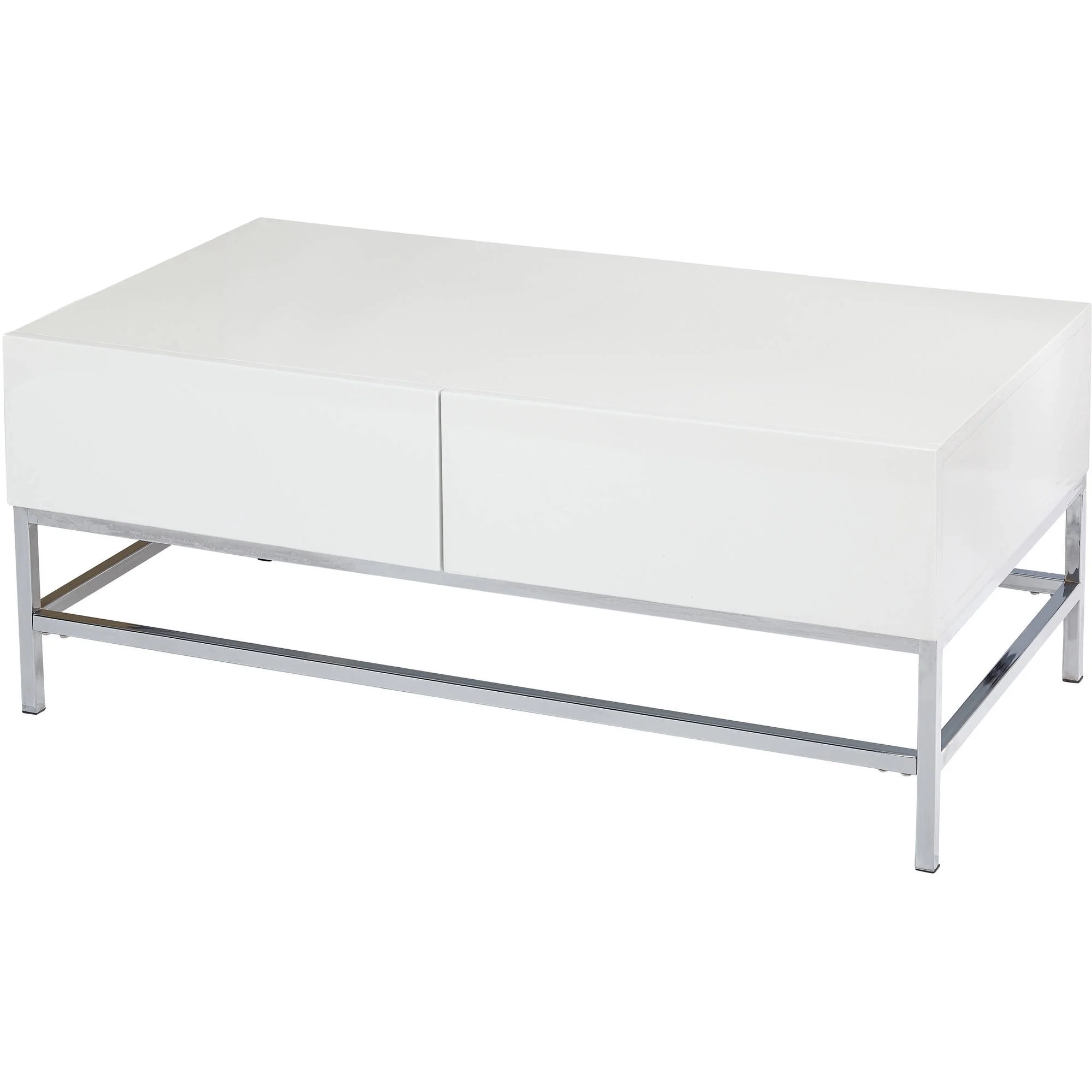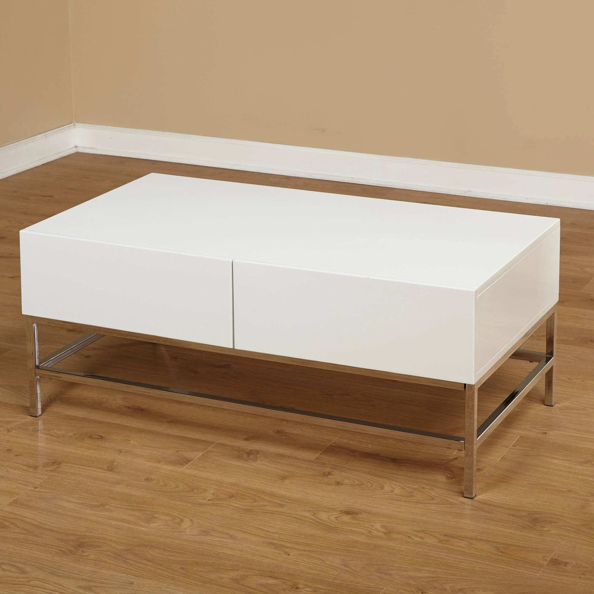 The Lewis Occasional Coffee Table will bring a modern flair to your room. Classic contemporary styling can be seen in the high gloss finish, metal legs and squared shape with two concealed drawers.