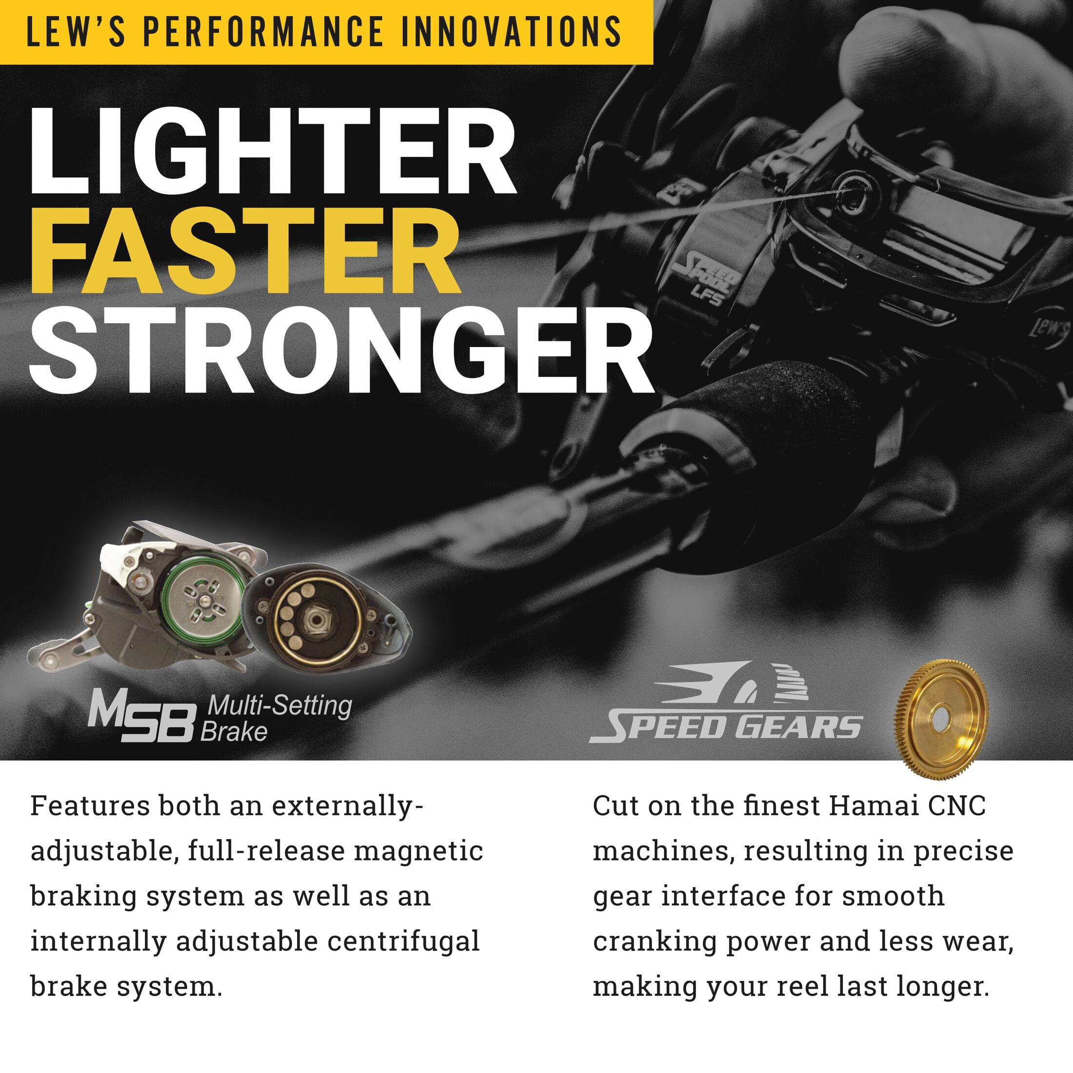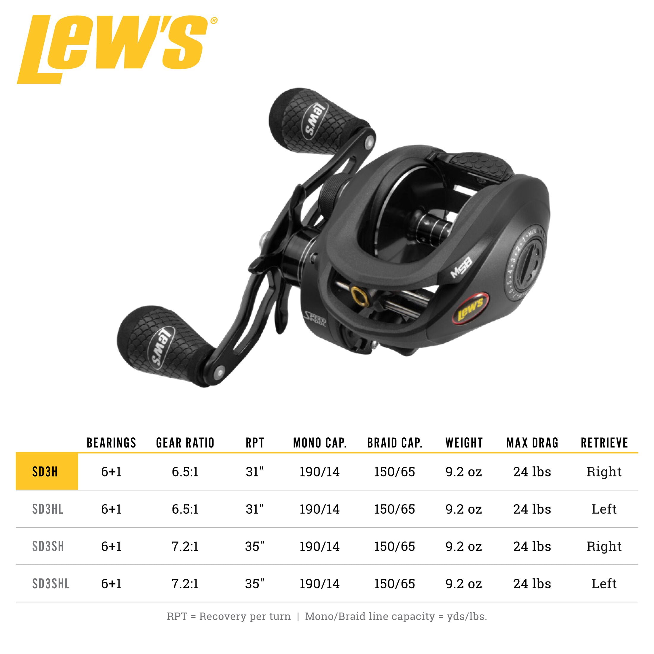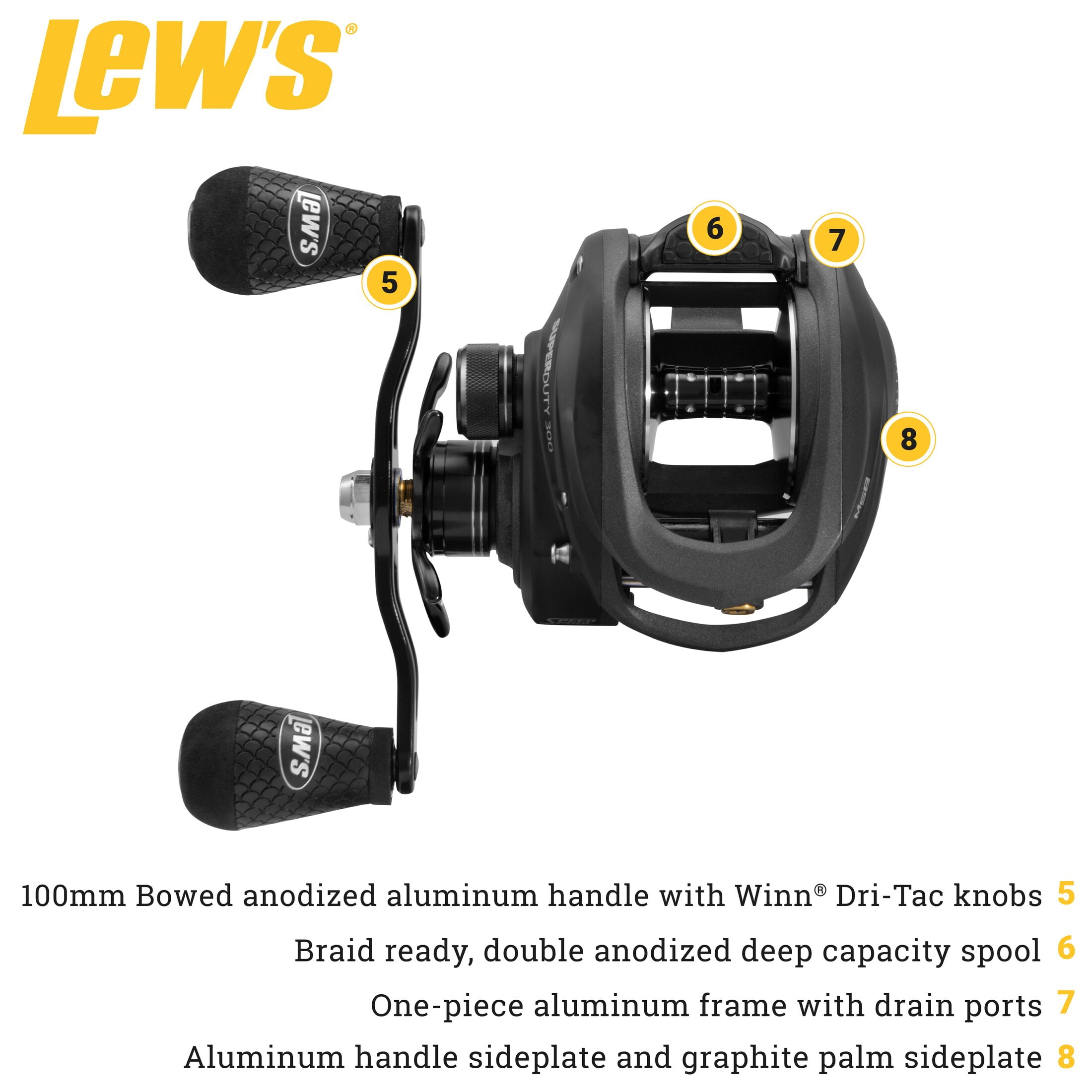 U-SHAPED 39mm SPOOL is oversized, machined, and double-anodized, and is braid-ready with a large line capacity MULTI-SETTING BRAKE SYSTEM (MSB) combines externally adjustable magnetic and internally adjustable centrifugal braking for ultra-precise casting SPEED GEARS® are cut on the finest Hamai CNC machines to provide smooth cranking power with less gear wear 100mm BOWED HANDLE is made with anodized aluminum with Winn® Dri-Tac knobs to provide control and power in all conditions SPEED KEEPER® HOOK KEEPER is Lew’s® patented and retractable, increasing your efficiency and protecting the reel from hooks