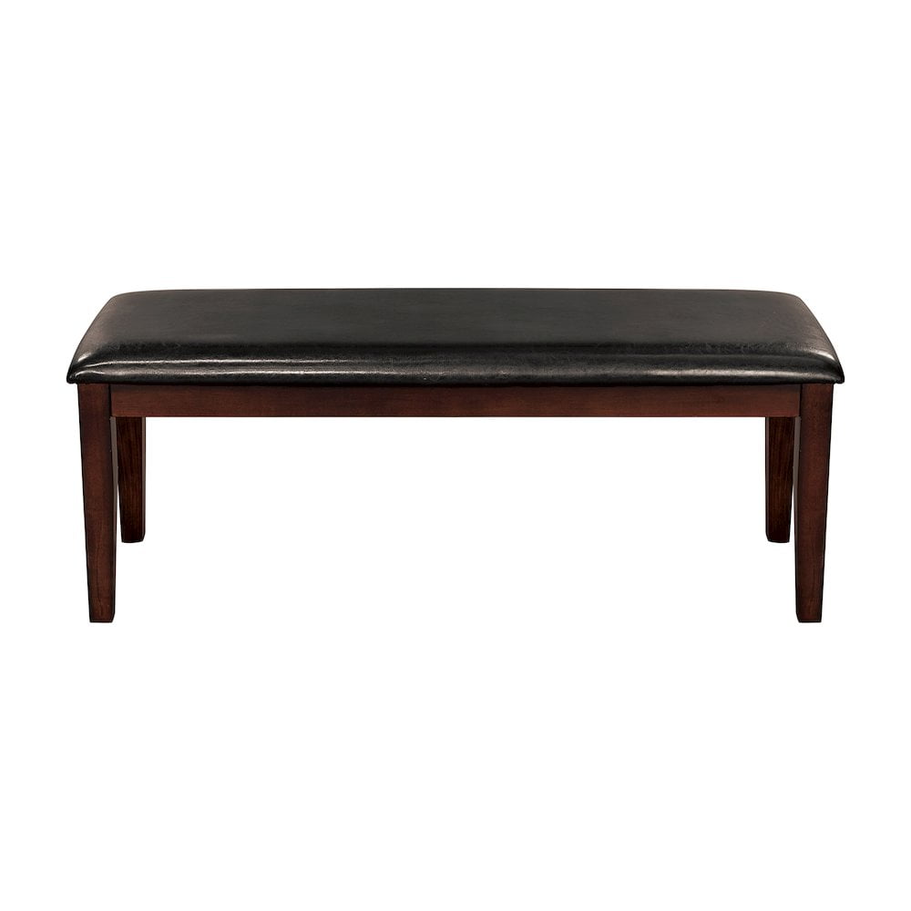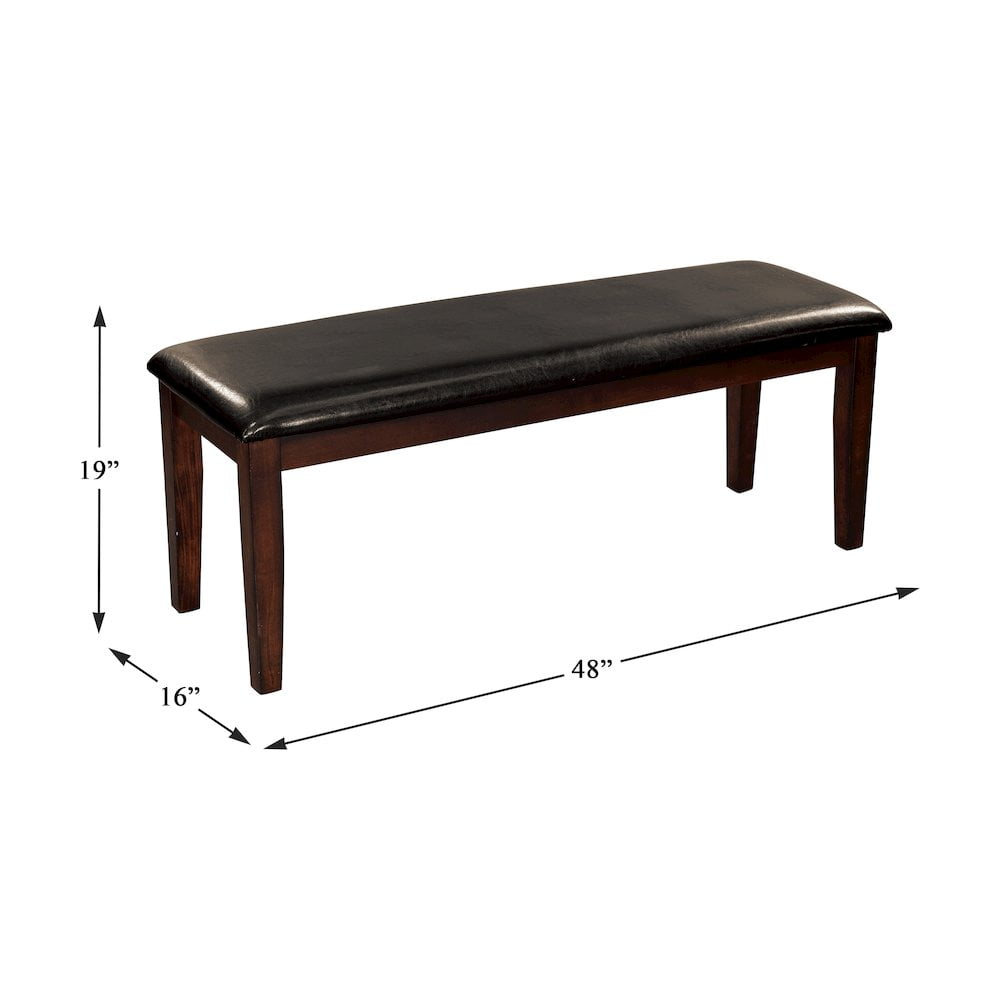 Transitionally styled for your home is the Mantello Collection. The dining height bench’s cherry finish over mango veneer and classic styling will provide the perfect seat for your mealtime gatherings. Dark brown bi-cast vinyl covers the side chairs for complementing contrast to the wood’s finish. Features: Wood frame Cherry finish Faux leather upholstery Specifications: Product Dimensions: 19″ H x 48″ W x 16″ D Seat Dimensions: 19″ H x 48″ W x 16″ D Product Weight: 23.75 lbs Weight Capacity: 300 lbs