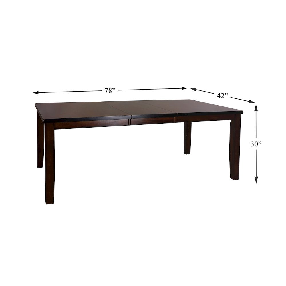 Transitionally styled for your home is the Mantello Collection. The dining height table’s cherry finish over mango veneer and classic styling will provide the perfect platform for your mealtime gatherings. Designed to comfortably seat six, it features a separate extension leaf for added versatility, extending easily by pulling both ends. Assembly required. Features: Made of mango veneer, wood and engineered wood Cherry finish Separate extension leaf Table extends by pulling both ends and dropping in leaf Easily Seats Six (6) persons Specifications: Product Dimensions: 30″ H x 78″ W x 42″ D Product Dimensions: (Apron to floor) 25.75″ Product Dimensions: (Distance between legs from the shorter side) 34.75″ Product Dimensions: (Distance between legs from the longer side) 70.75″ Product Dimensions: (Length of leaf) 18″ x 1″ Product Weight: 125.5 lbs