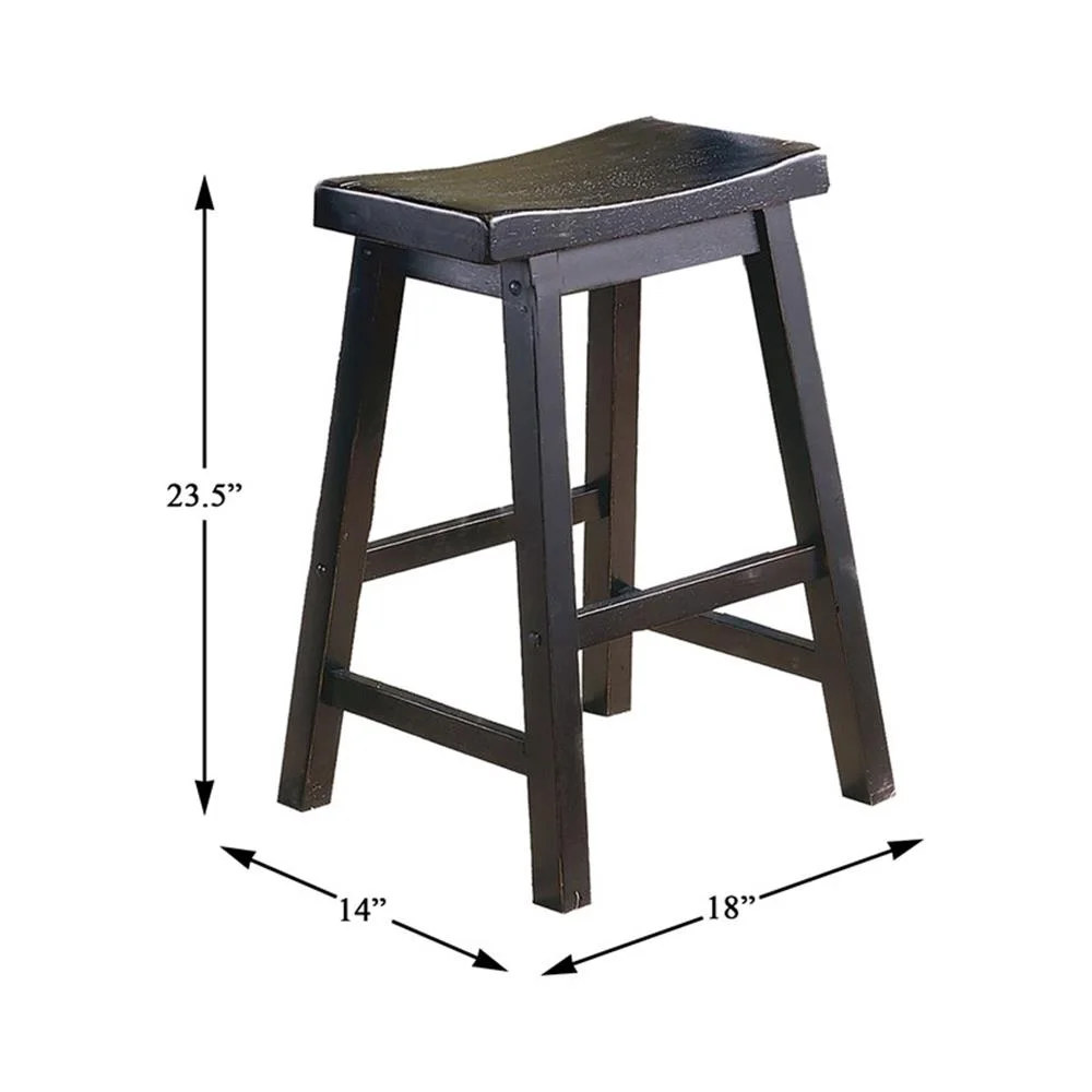 The saddle seat stools and 24-inch height of the Saddleback Collection are designed for placement within your casual dining area. The black sand-through finish allows for neutral complement to your dining space. Features: Solid wood frame Black finish Counter height design Assembly required Minimum order qty 2 Specifications: Product Dimensions: 23.50″ H x 18.00″ W x 9.50″ D Seat Width: 17.75″ Seat Depth: 9.25″ Seat Height: 23.5″ Product Weight: 22 lbs Weight Capacity: 250 lbs