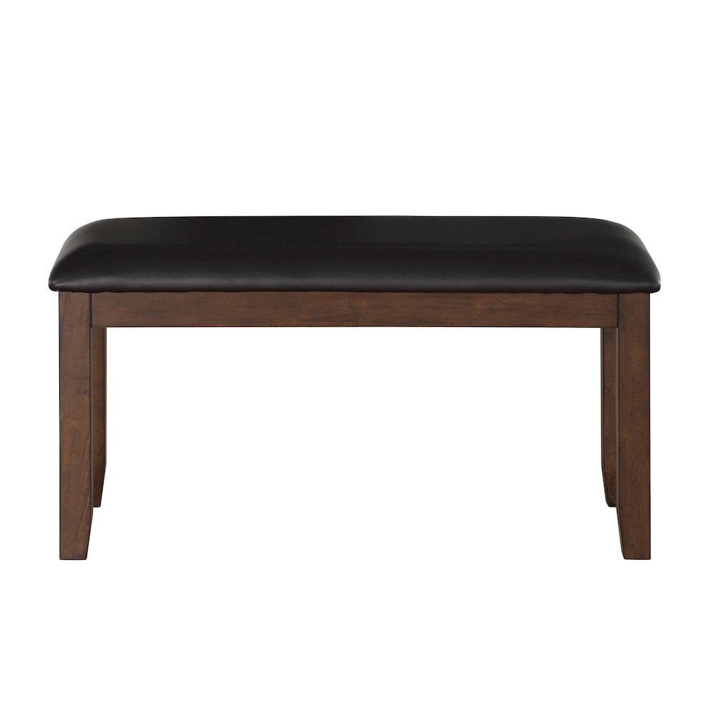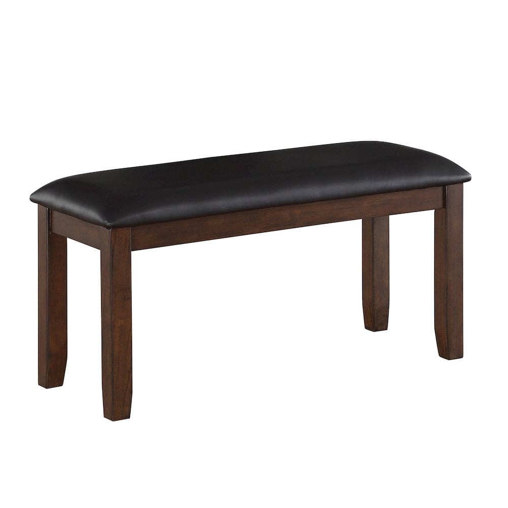 Includes dining room table, 4 chairs and bench Made of birch veneer, wood and engineered wood Cherry finish Faux leather upholstery Seats 6 Assembly required