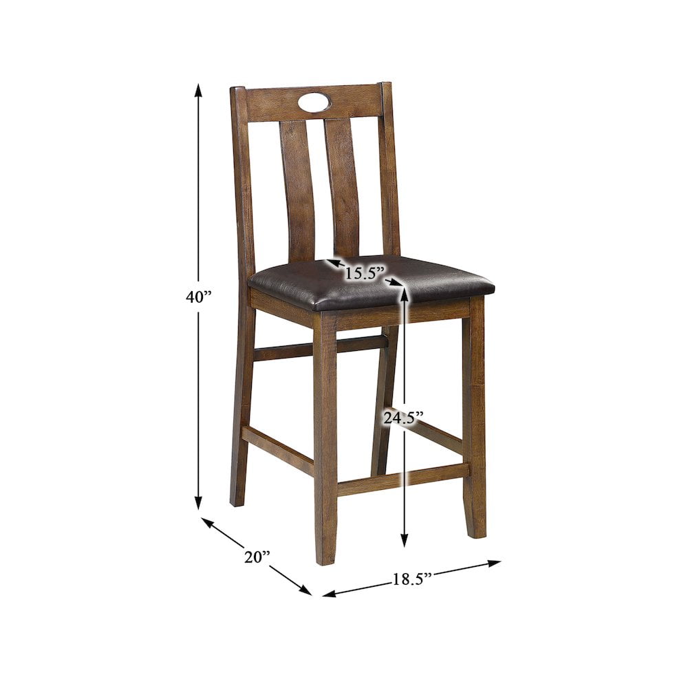 Includes counter height table and 4 counter height chairs Made of acacia veneer, wood and engineered wood Brown finish Faux leather upholstery Counter height design Seats 4 Assembly required