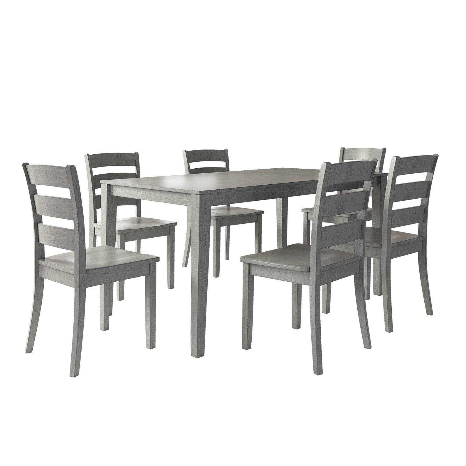 Set includes one (1) dining table and six (6) dining chairs Ladder back chair design Classic, rectangular table design Antique, distressed wood grain finish Made with rubberwood, veneer, aukuman, and MDF Side chair overall dimensions: 17.2 in. width x 20 in. depth x 36 in. height Seat dimensions: 17.2 in. width x 15.5 in. depth x 17.3 in. height Under chair height: 14 in. Dining table overall dimensions: 60 in. width x 36 in. depth x 30 in. height Under table height: 26.6 in.