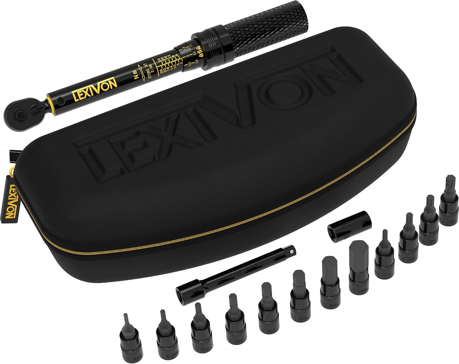 Lexivon Bike Torque Wrench with 12 x Bit Socket Ultimate Bike Tool: This 15-piece bicycle torque wrench features precise scales of 2-26 Newton Meter (17.7 in-lb) with micro-adjustments to 0.2 Nm Comprehensive Bit Set: Includes bit sockets: HEX – H2, H2.5, H3, H4, H5, H6, H8, H10; TORX – T10, T20, T25, T30; along with a 3-inch extension bar and 1/4-inch adapter 72-Tooth Gear: Reinforced, hardened, and heat-treated ratchet head constructed from Chrome-Molybdenum alloy steel. The quick-release button mechanism allows for a secure fit and rapid socket swaps Precision Measurement: Ships pre-calibrated and measures torque in both clockwise (+/- 4%) and counterclockwise (+/- 6%). Includes a calibration certificate with a traceable and unique serial number Durable Construction: Features rust and corrosion protection with a unique Electro-Black finish treatment. The non-slip knurled handle is made of high-grade aerospace aluminum and equipped with an exclusive slide-to-lock mechanism to set your desired torque