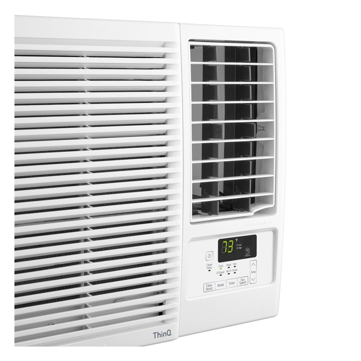 The SMART way to keep your house feeling comfortable no matter what the weather is like outside! LG ThinQ technology lets you control your air conditioner with your phone or use with Amazon Alexa and Hey Google to have control with the sound of your voice. This unit ideal for cooling medium rooms up to 550 sq. ft. and you can even add a bit of warmth on cooler days with the supplemental heat option. With 2 cooling and fan speeds and a 24 hour timer you can create the perfect cooling schedule. 4-way air deflection lets the flow of air be directed where it’s needed most whether cooling, heating, dehumidifying or just circulating air. If there is a power outage, the auto restart feature will automatically turn your unit back on when power is restored. Other features include a remote control, easy window installation kit, removable, washable filter and a check filter alert.LG Electronics 12,000 BTU (11200 Heating BTU) Heat and Cool Window Air Conditioner, White, LW1221HRSM