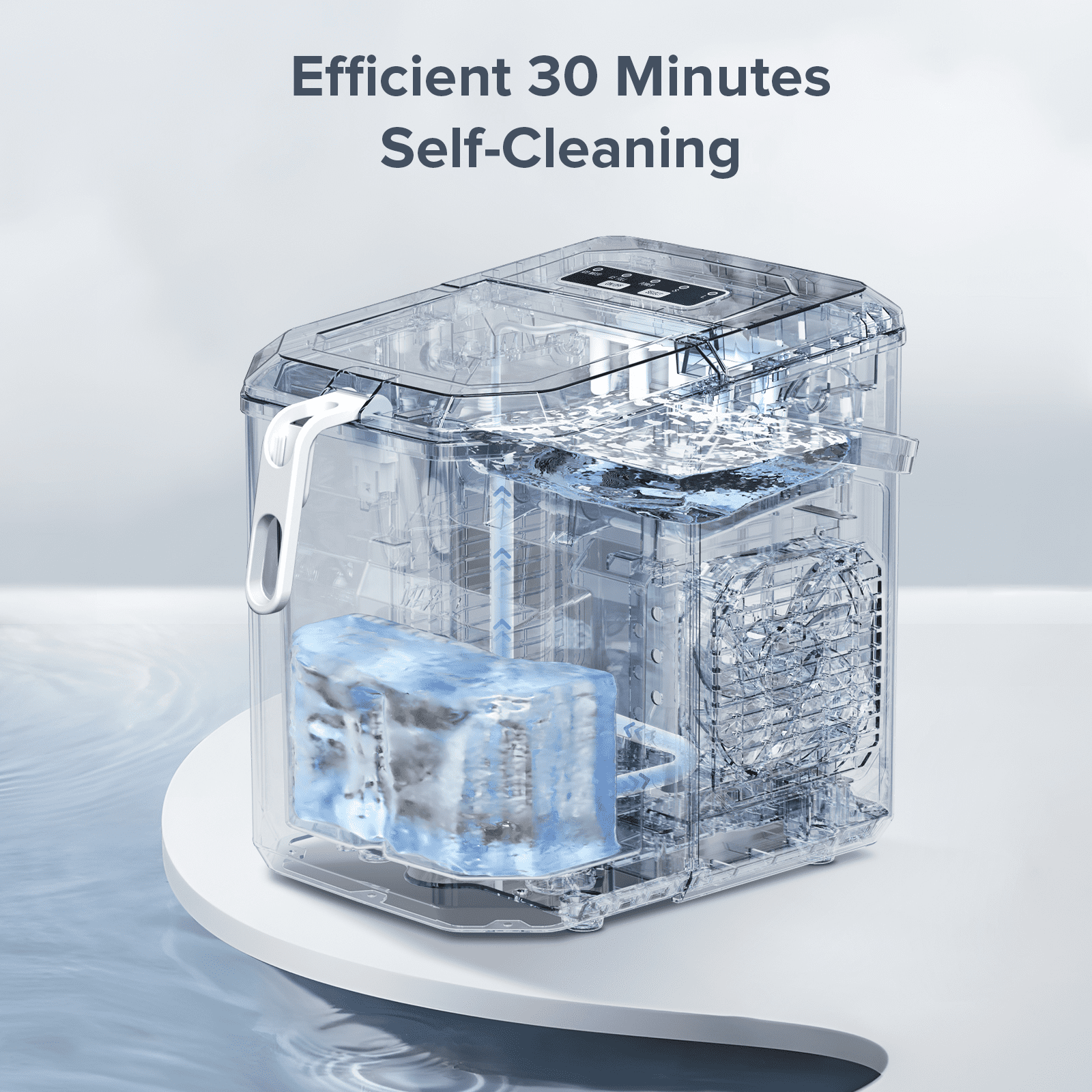 Due to the small size of the Ice Maker – 8.74*11.57*11.42in, it will not take too much space of your place. And with the durable handle on the top, you can easily move the machine or carry it out with you. The ice produced by our ice maker is bullet-shaped, and due to its characteristics, it will provide you with a long duration of use. And you can adjust the size of the ice cubes you like (S/L). The ice maker can provide appropriate ice in a short time, it can produce 9pcs bullet ice within 8mins and 26lbs in 24h. Also with the Noise reduction design, you can make ice in your daily time, It won’t bother your life. When the water tank is full of water, the only thing you need to do is press the “ON/OFF” button to start working, which can give you and your family the best and most convenient use experience. The ice Basket can not hold a low temperature environment for the ice, so to prevent the ice from melt and stick together, please use it immediately after the bullet ice is made or put it into the refrigerator. The machine includes a self-cleaning function, eliminating the need to clean the product after each use. However, to ensure long-term usability of the product, please manually clean it at appropriate intervals. Instructions: Plug in the power, press and hold the “ON/OFF” button on the control panel for more than 5 seconds to enter the automatic cleaning program, which takes about 30 minutes. During the cleaning, the “Ice Full” and “Add Water” indicators will flash alternately. After the cleaning, drain the water from the internal water tank through the drainage outlet at the bottom of the machine.