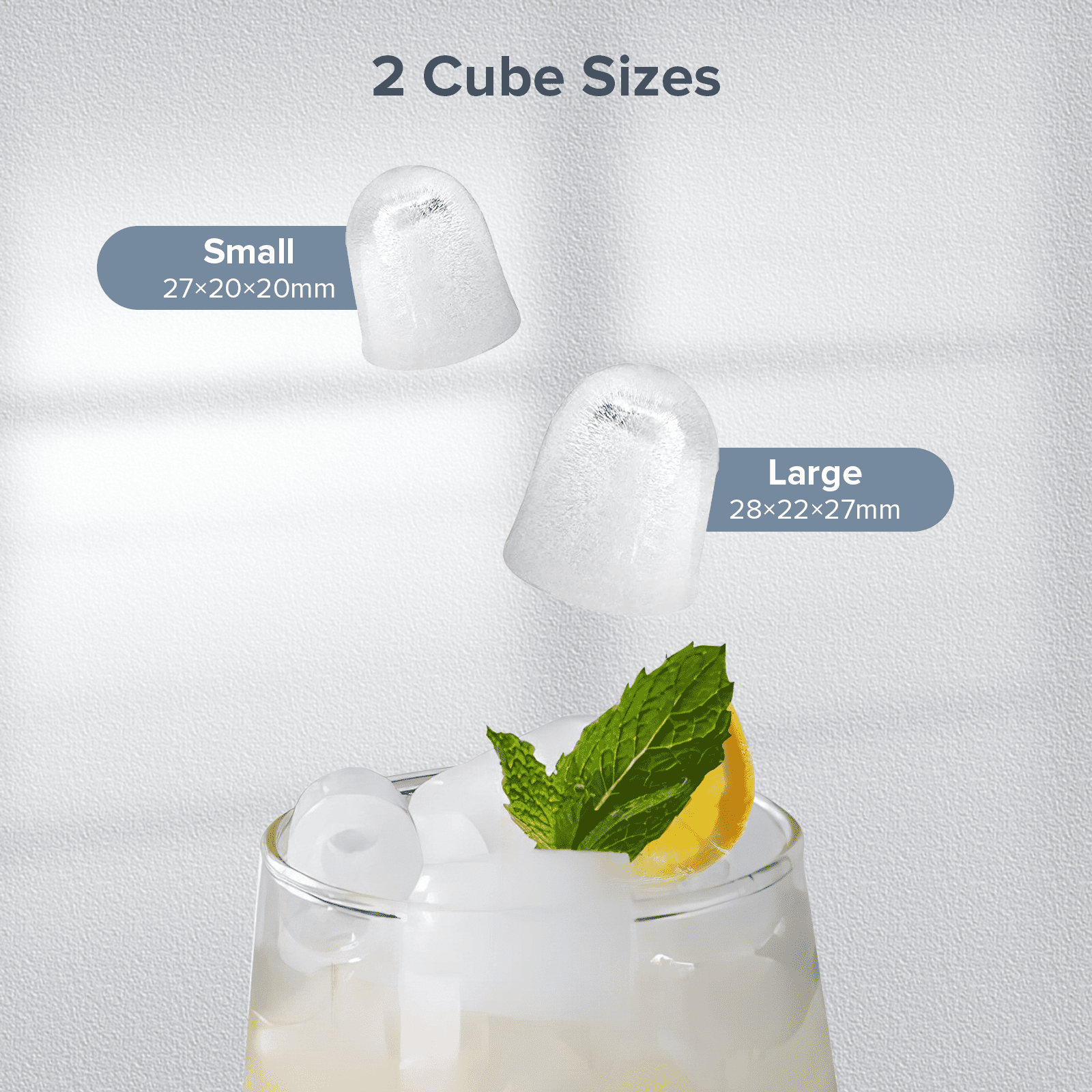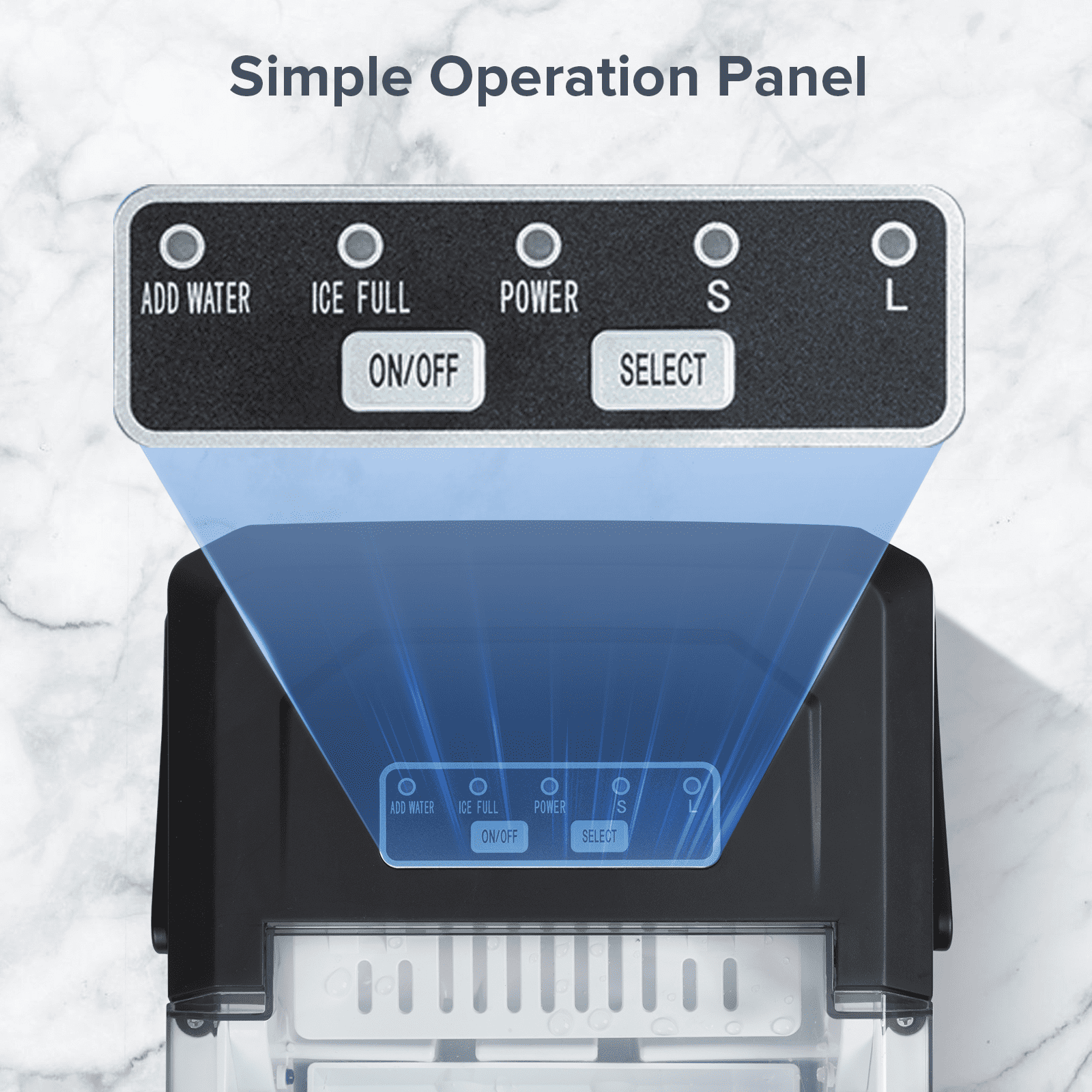 LHRIVER Ice Maker: Type of ice: Bullet ice Water adding mode: Manually add water Tank volume: 1.2L Ice production: 26lbs Ice storage capacity: 1lb Display mode: indicator (reminder) Control mode: mechanical button Ice cube size: Adjustable S/L Ice making time: a round of 9 pcs /8min Single ice weight: 0.02lb Accessory: Ice basket, ice shovel, handle, ice basket handle
