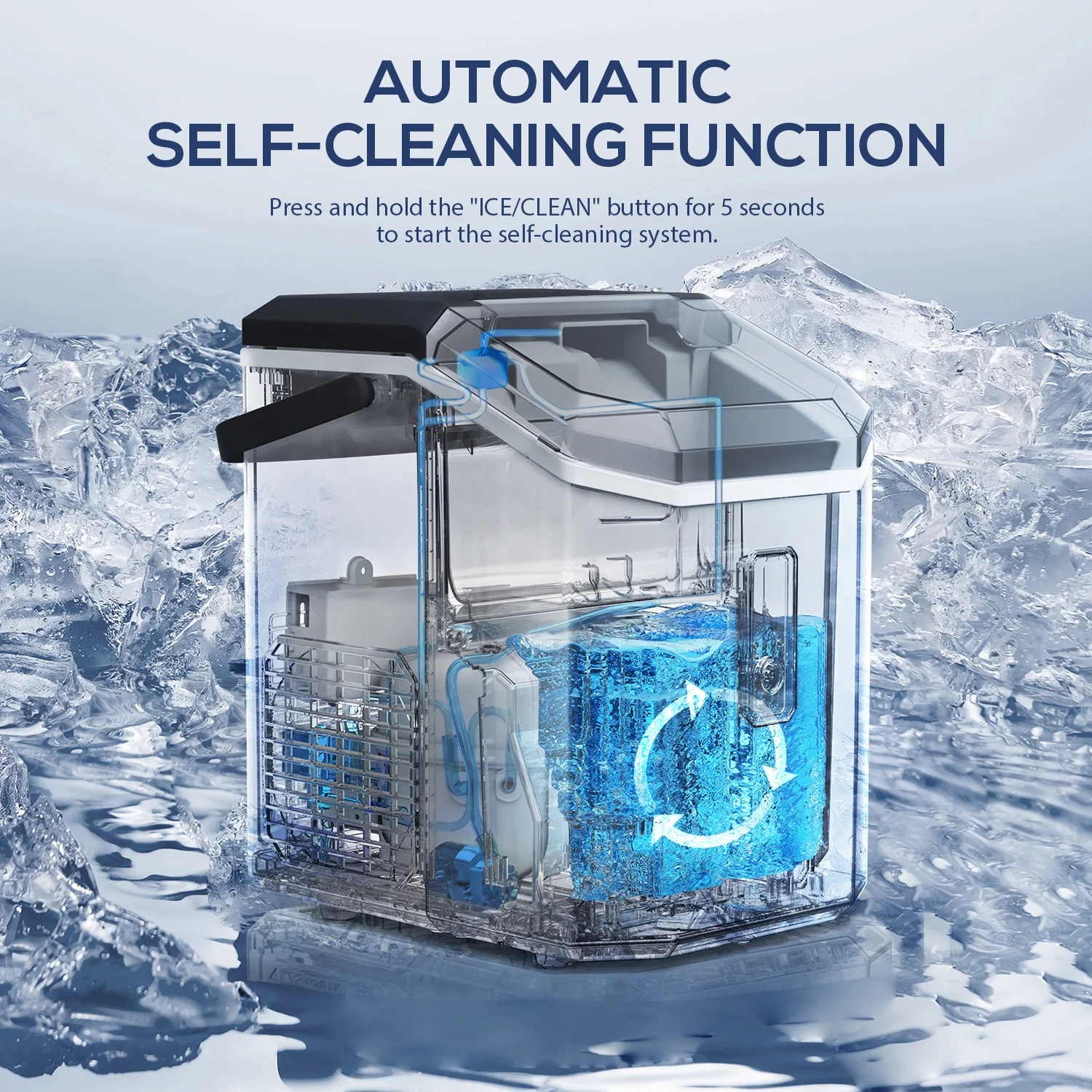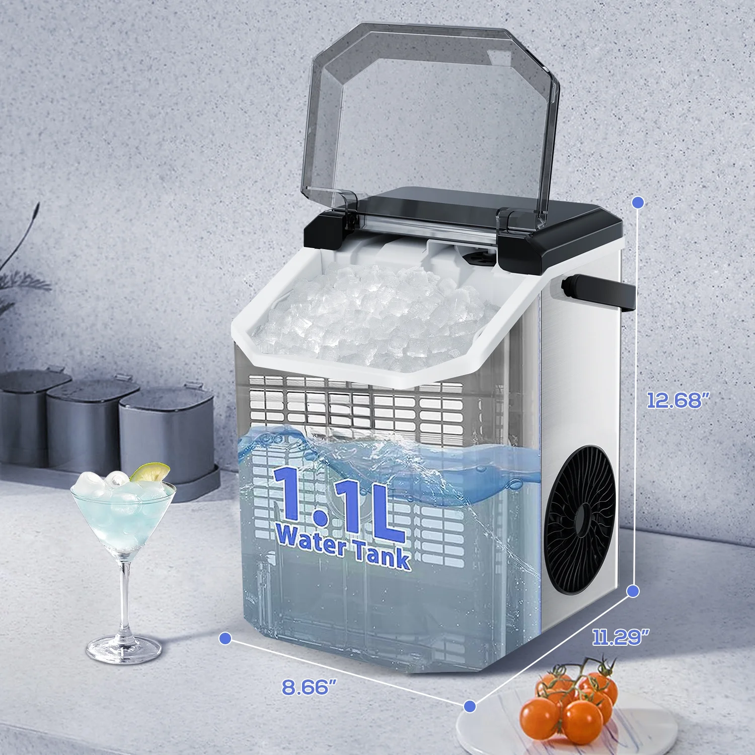 FAST ICE MAKING: Fill 1.1l of water into the water tank, maximum ice capacity can reach 35lbs in 24 hours. It won’t make you feel anxious because of waiting, let you and your family have ice cubes all day long. CHEWABLE NUGGET ICE: Chewing-block ice is made from crushed ice cut with blades, as opposed to traditional hard block ice which are chewable, brittle, ready fast and retains its flavor. The optimal melting speed preserves the original flavor of whisky and cold drinks. QUIET AND USER FRIENDLY: It makes ice with low noise. The transparent lid allows you to monitor the ice making process. A considerate ice scoop holder, easy to find your ice scoop before making ice. Only need to press one button, helps you to quickly understand how to use it. When the water is insufficient or the ice basket is full, the indicator light will turn on. SELF-CLEANING FUNCTION: Press “ICE/CLEAN” button for 5 seconds, the ring indicator light flashes white. It will run the cleaning procedure for 15 minutes and automatically exit. Press this button again during the cleaning procedure and it will exit immediately. SMALL FOOTPRINT: This mini ice maker measures just 12.68*11.30*8.66 inches. Large Capacity Based on Small Footprint, Small Enough to fit on most countertop and easy to store when not in use. It takes up less space at home or in the office, barbeques, outdoor parties, or basement bars.