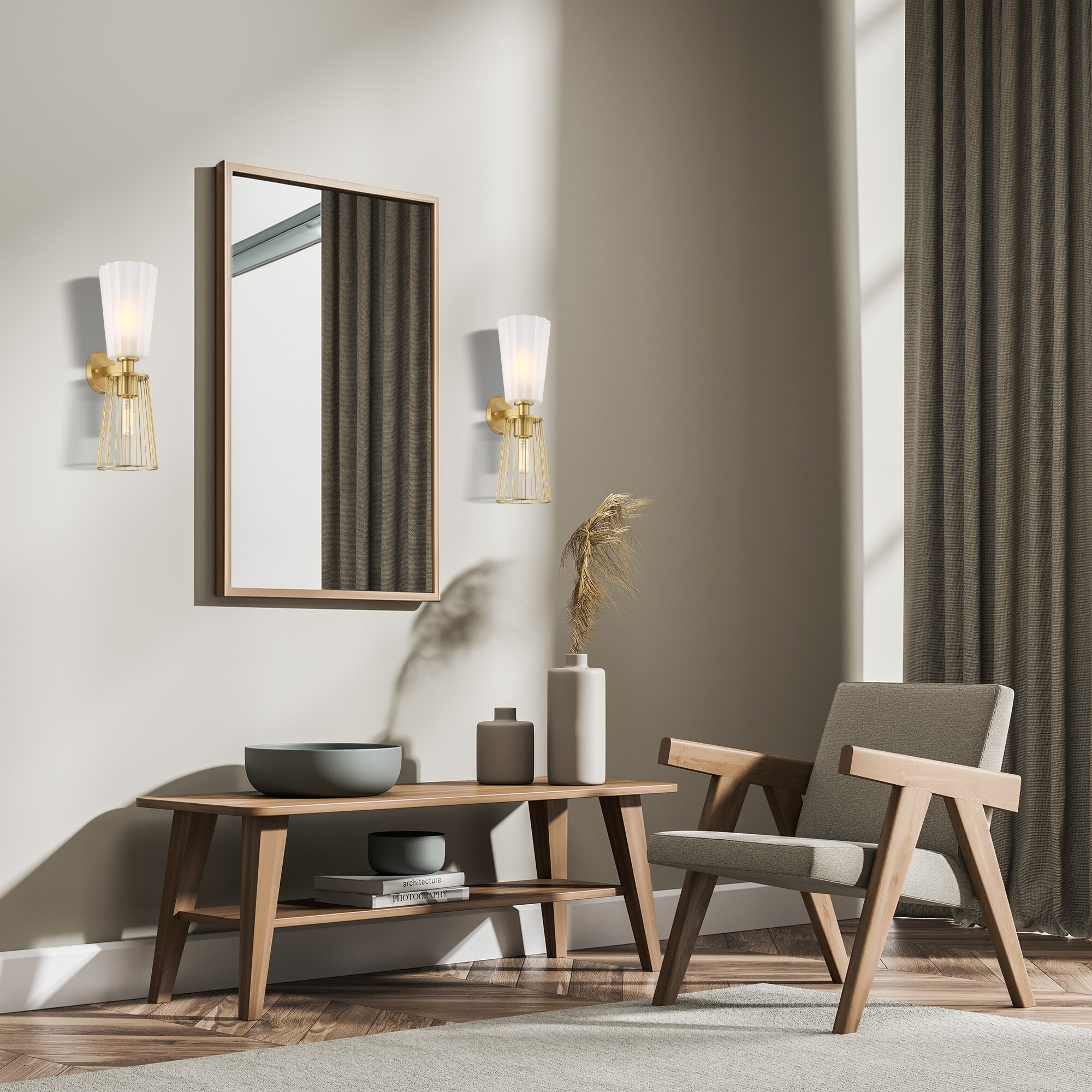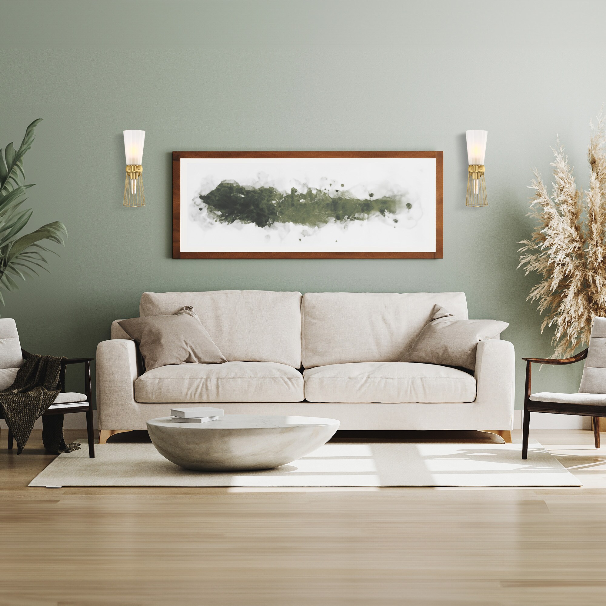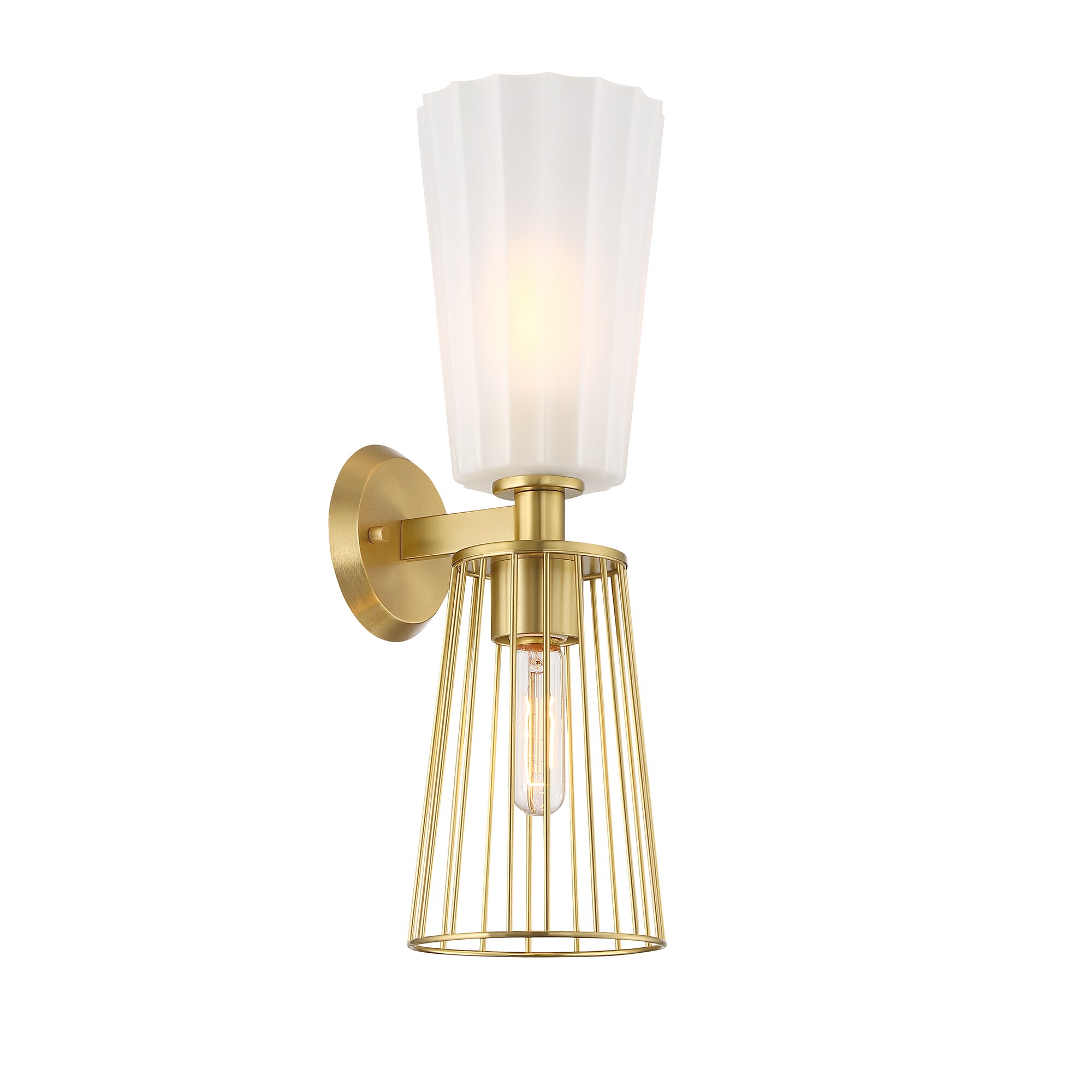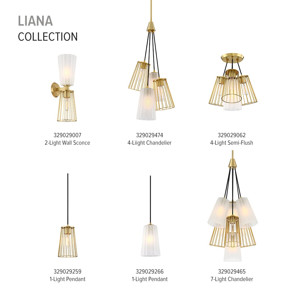 The elegant Liana collection from Designers Fountain features modern layered lighting and mixed materials that add texture and visual interest. A warm brushed gold finish is combined with a mix of etched glass and metal cage shades to provide a glamorous addition to any room. With several pieces in the collection, including wall and hanging solutions, place throughout your home for an added touch of sophistication. Installation is a snap, with easy-to-follow instructions and all mounting and wiring hardware included.