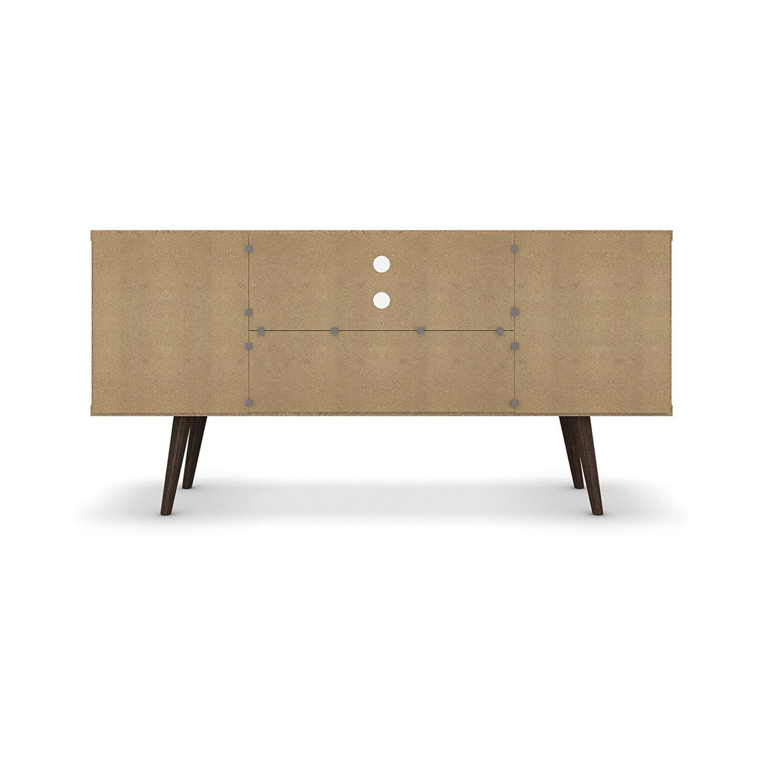 Free-standing entertainment stand can be used in your living room or bedroom for TVs measuring between 46 to 50 inches Includes 1 large open cubby space, 1 concealed cubby space, and 3 center shelves with 1 side semi-opened for a variety of storage options Mid-century modern style will fit in seamlessly with your existing room decor Solid wood legs add durability while splayed design enhances the mid-century modern look Includes 2 wire management holes to keep electronic cords organized Built with high-quality MDF to last you through the years Hardware included for easy assembly Color: Brown and Blue Dimensions (D x W x H): 14.17 x 53.17 x 26.57 inches Weight: 60.12 pounds
