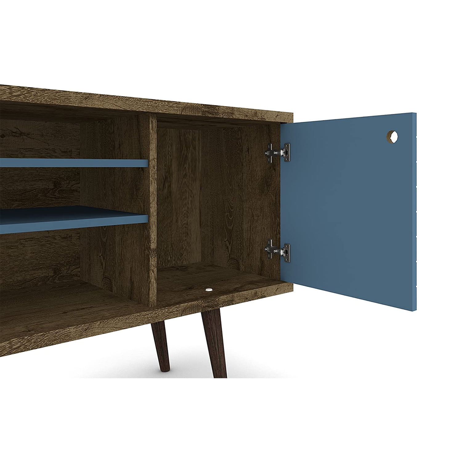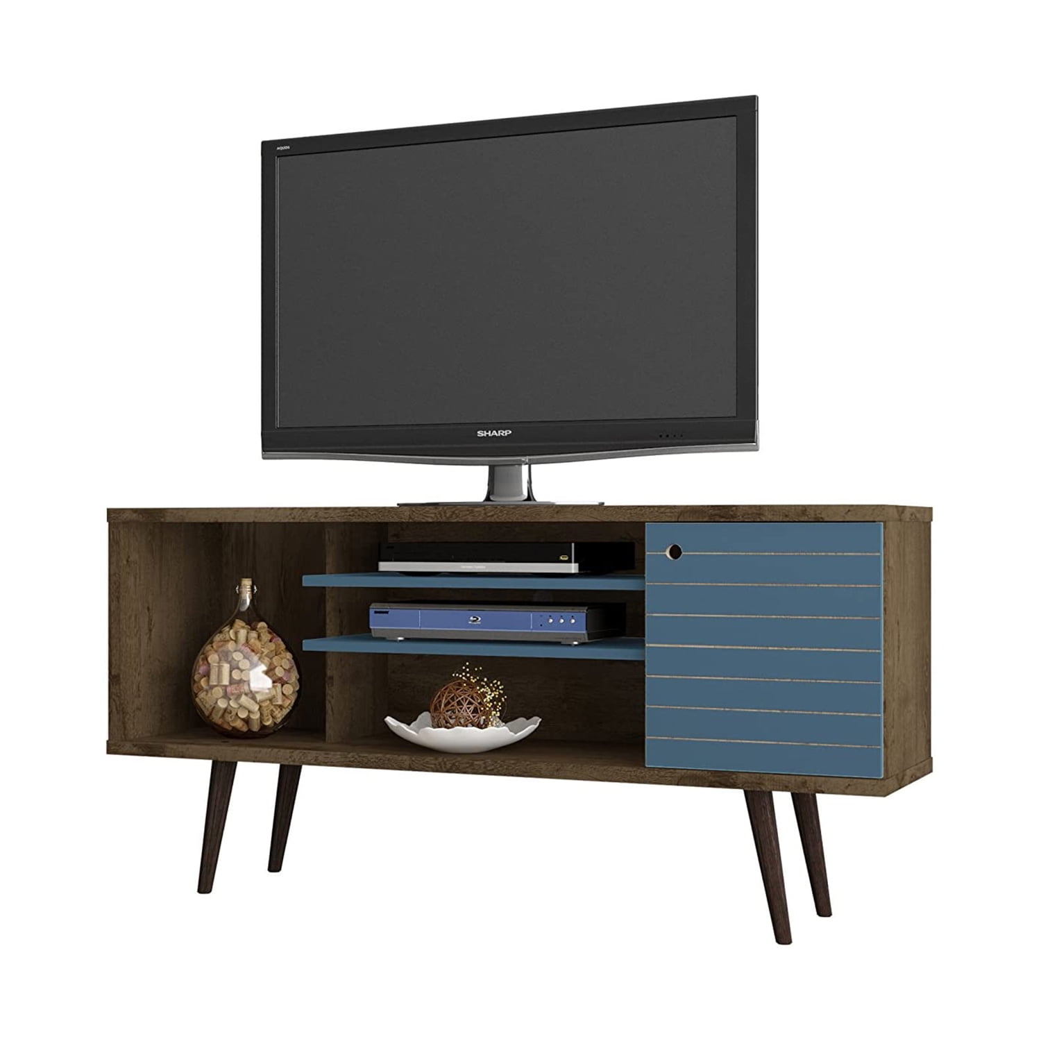 Liberty 53.14″ Mid Century – Modern TV Stand with 5 Shelves & 1 Door with Solid Wood Legs, Brown & Blue
