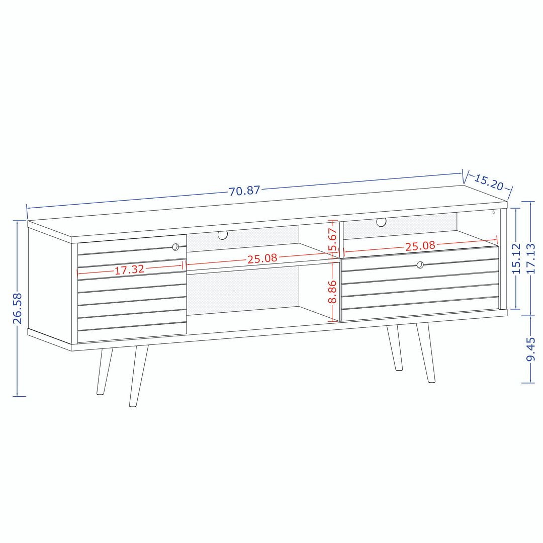 Liberty 70.86″ Mid-Century Modern TV Stand with 4 Shelving Spaces and 1 Drawer with Solid Wood Legs