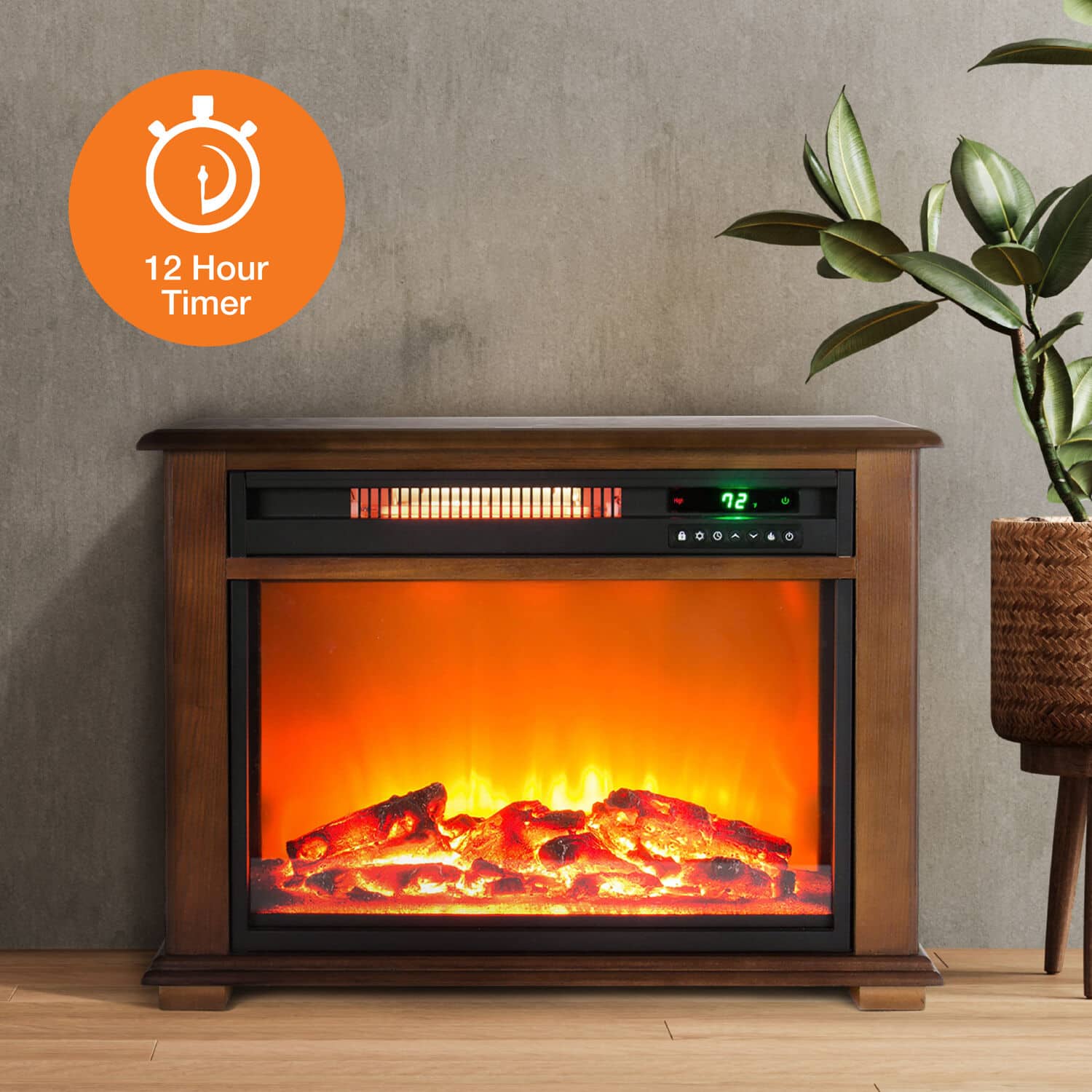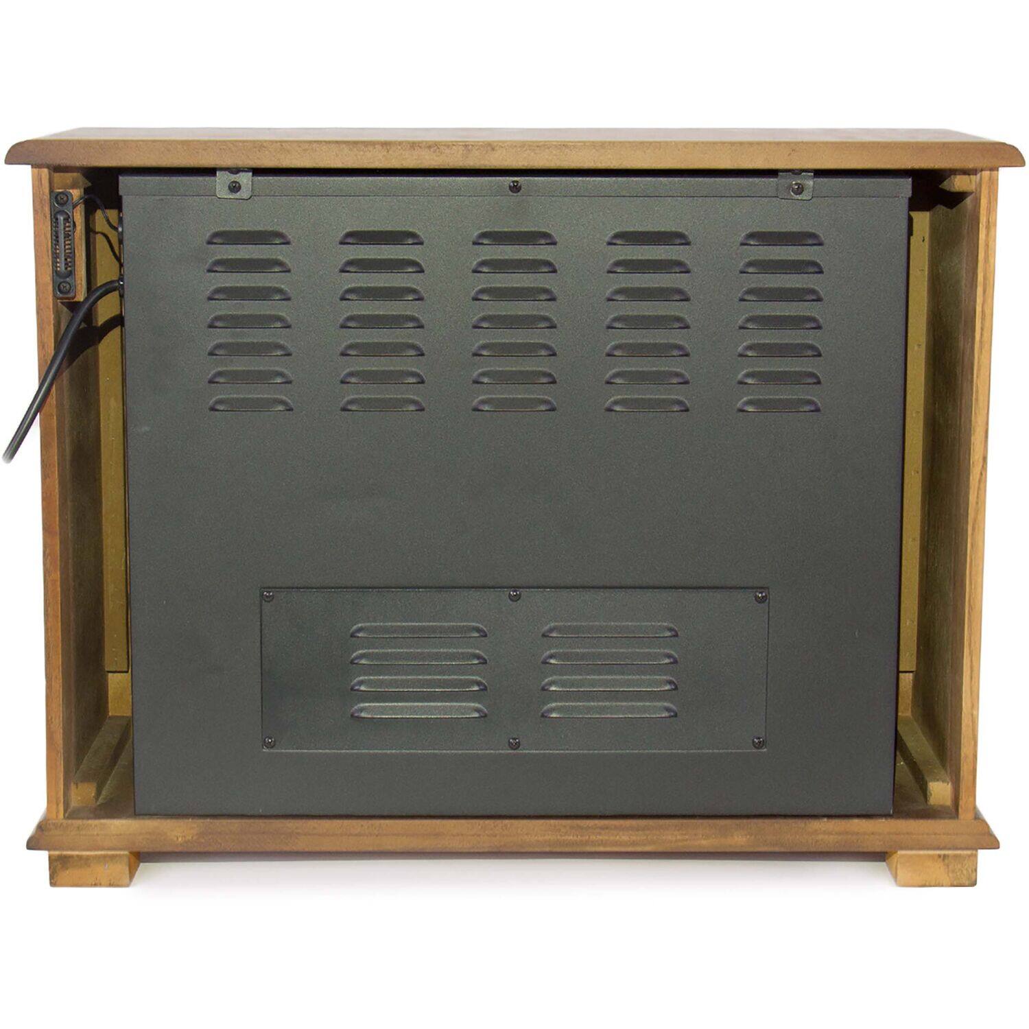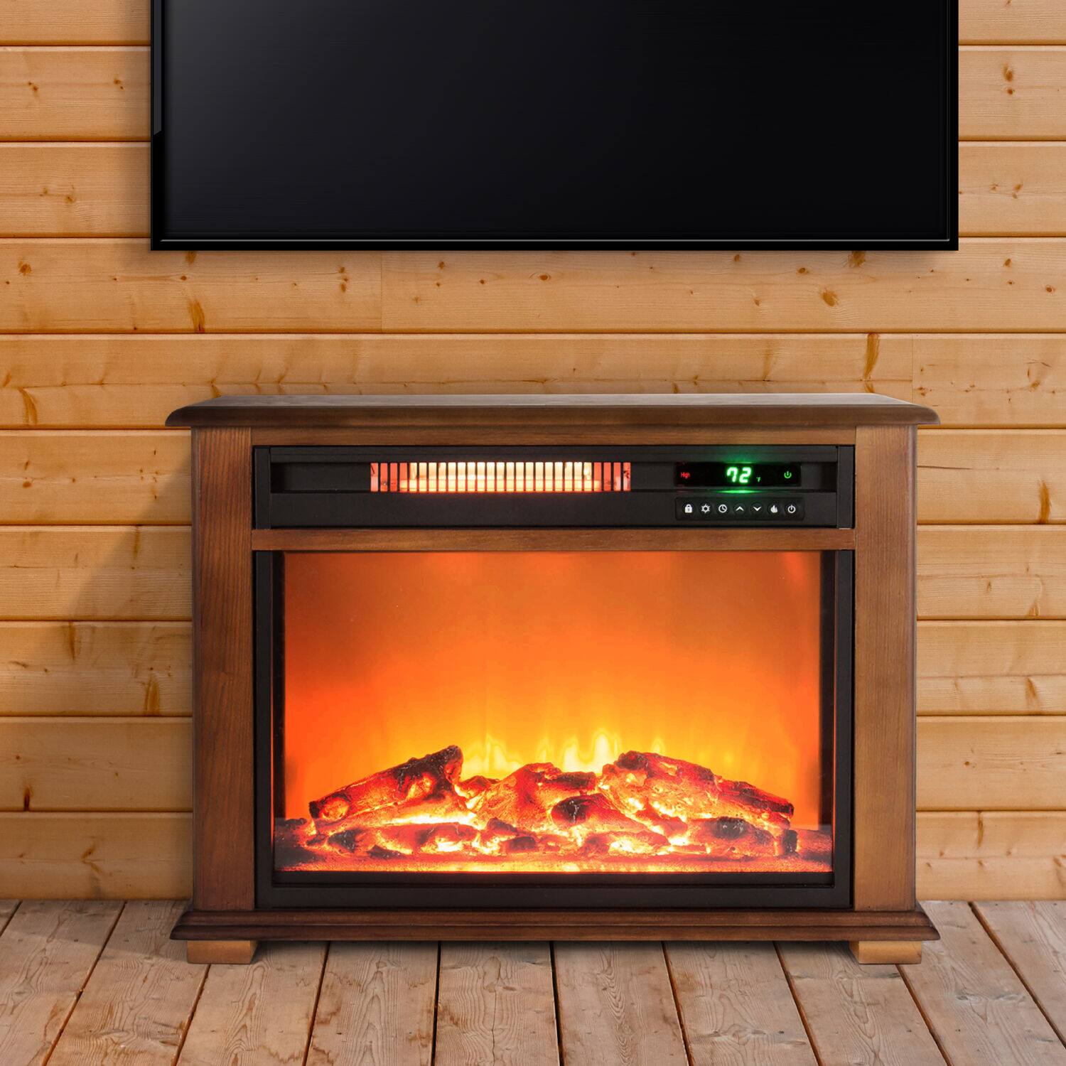The Lifesmart infrared fireplace can be installed anywhere since no venting is required. Imagine the warmth and beauty of a fireplace anywhere in your home with no costly installation. A beautiful oak mantle surrounds the fireplace to match your decor. Unlike most electric fireplaces, this is truly an infrared heater made to heat a large room. Our fireplace uses 3 commercial grade quartz infrared elements to produce a soft, cozy heat. All electrical components are warrantied for 1 year. This fireplace is ideal for zone heating and only uses up to 1500 watts which is no more than a common hairdryer. Simply plug into a standard 15 amp 110-volt outlet and enjoy. The fireplace produces beautiful and realistic dancing flames just like a real fire. The fireplace may be operated with or without heat so you can enjoy the ambiance year-round. A quiet scroll fan helps circulate the heat. A new large remote control is also included to operate your fireplace from across the room.