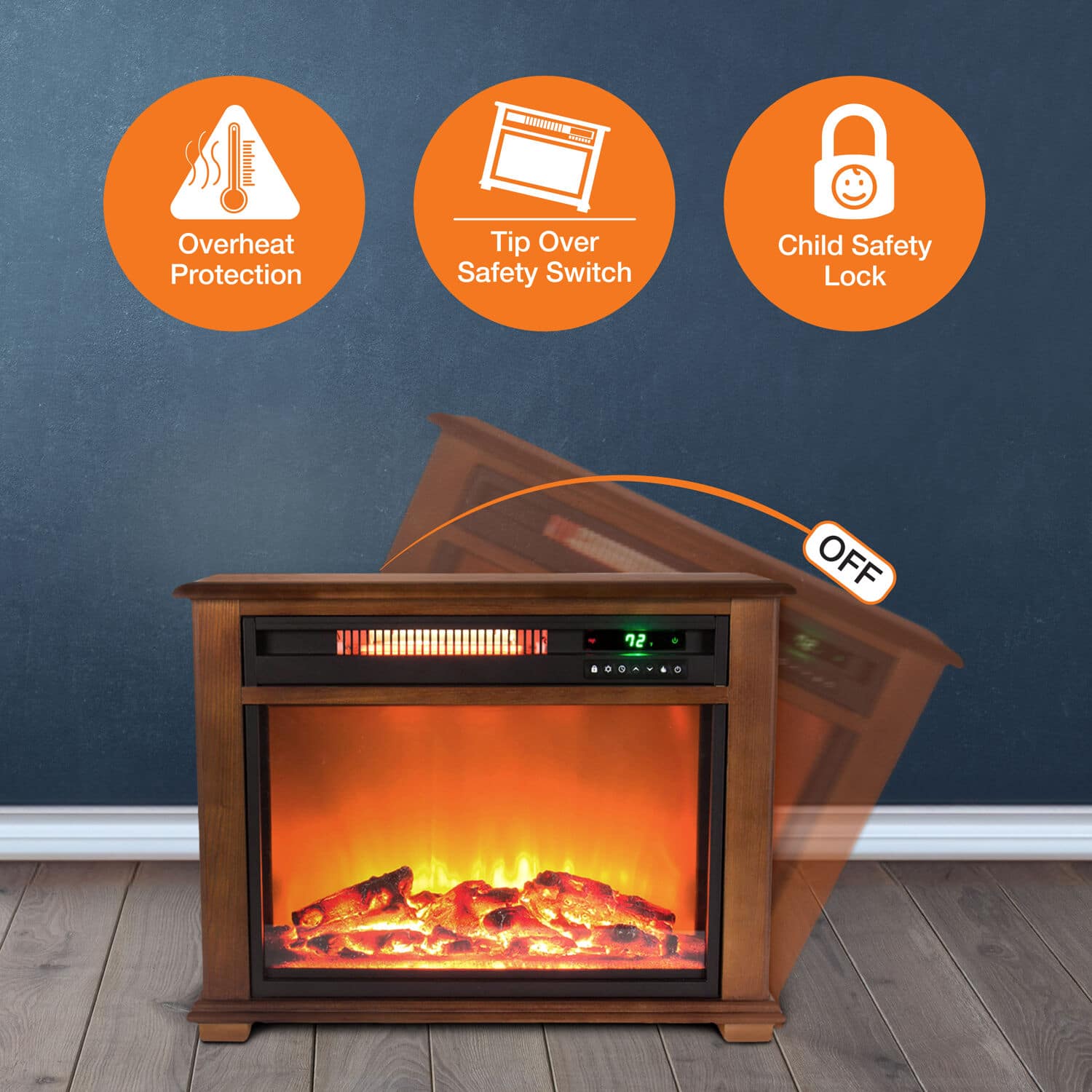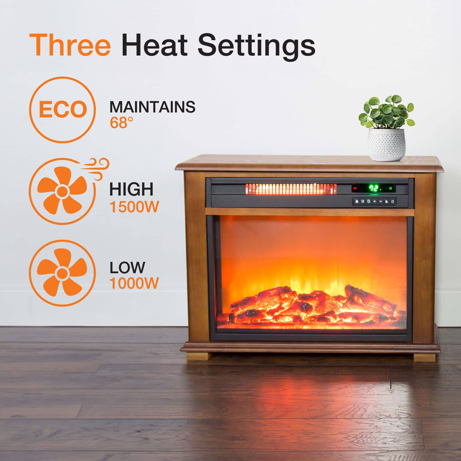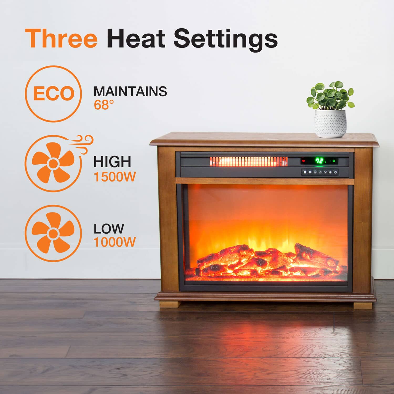 The Lifesmart infrared fireplace can be installed anywhere since no venting is required. Imagine the warmth and beauty of a fireplace anywhere in your home with no costly installation. A beautiful oak mantle surrounds the fireplace to match your decor. Unlike most electric fireplaces, this is truly an infrared heater made to heat a large room. Our fireplace uses 3 commercial grade quartz infrared elements to produce a soft, cozy heat. All electrical components are warrantied for 1 year. This fireplace is ideal for zone heating and only uses up to 1500 watts which is no more than a common hairdryer. Simply plug into a standard 15 amp 110-volt outlet and enjoy. The fireplace produces beautiful and realistic dancing flames just like a real fire. The fireplace may be operated with or without heat so you can enjoy the ambiance year-round. A quiet scroll fan helps circulate the heat. A new large remote control is also included to operate your fireplace from across the room.