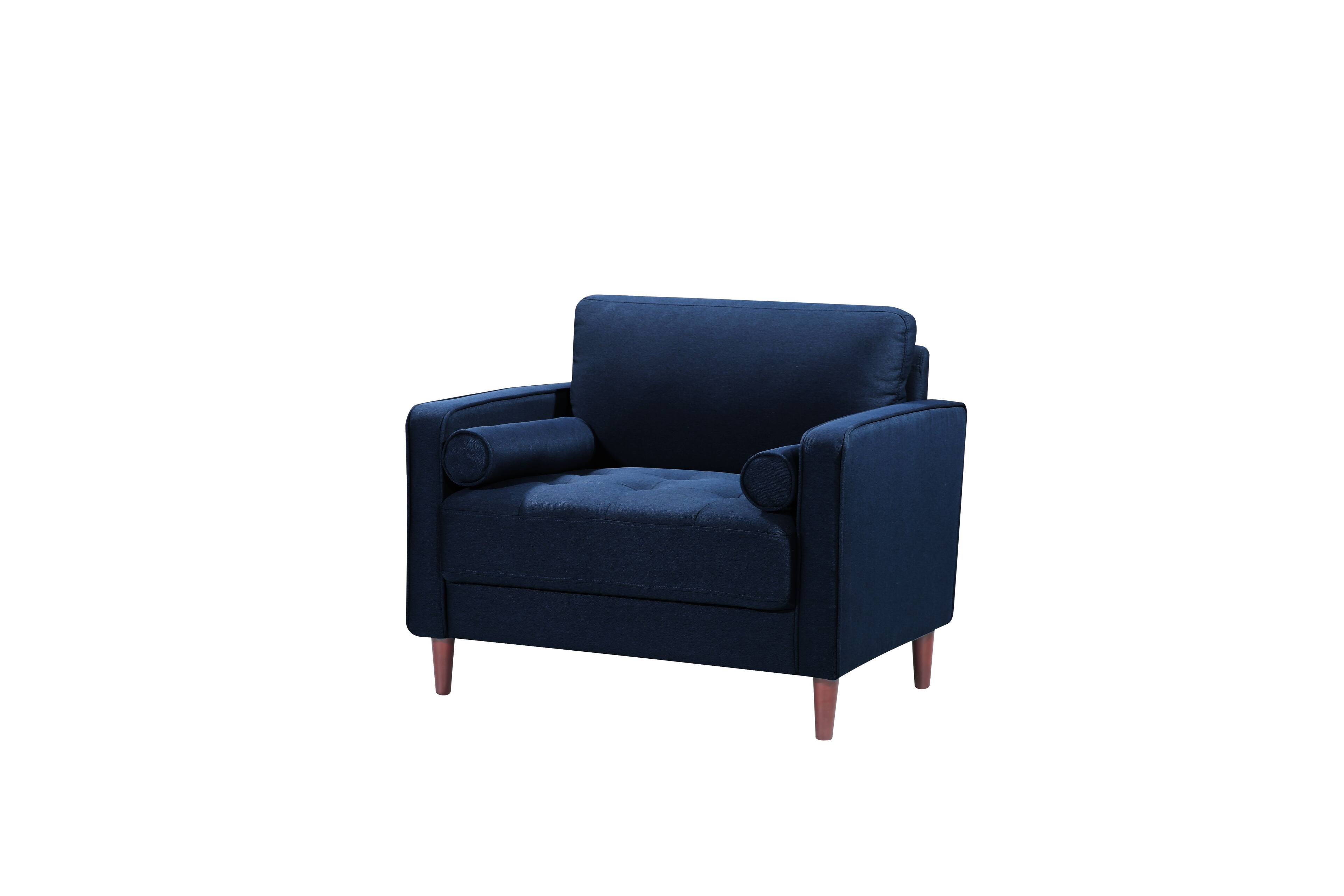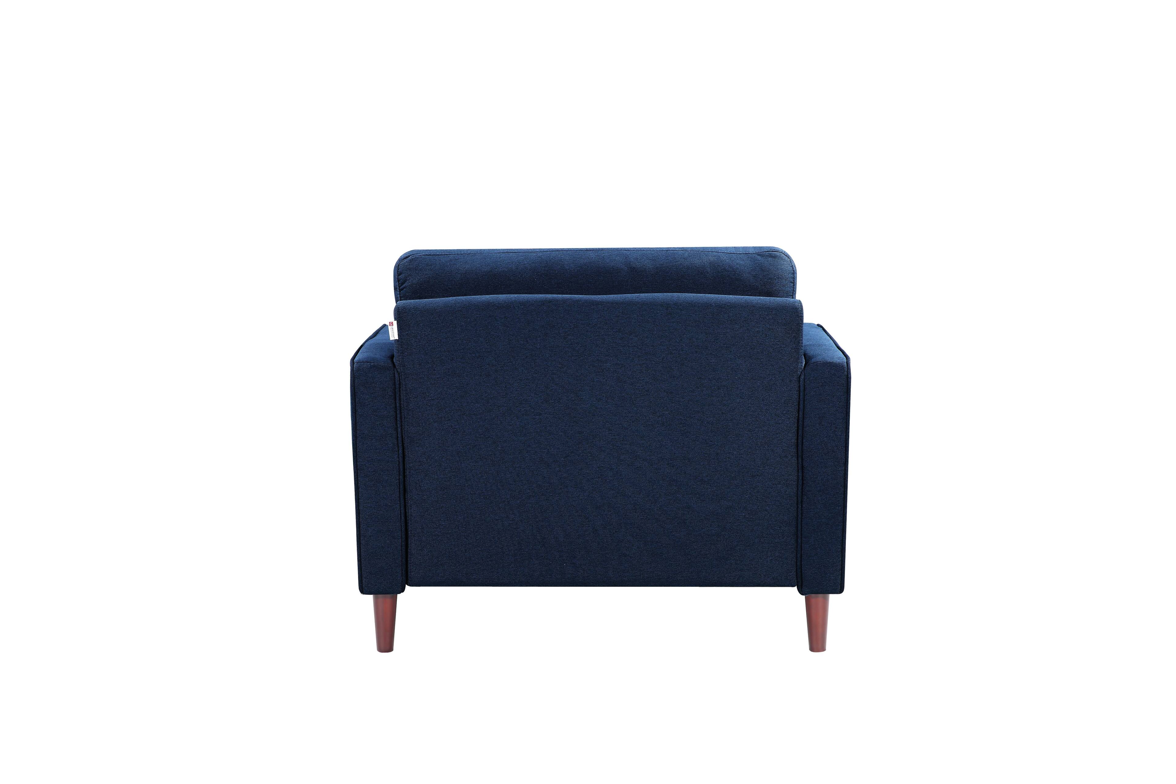 The Langford Chair brings together minimalistic style and functionality in this beautifully designed collection. The Langford’s compact profile makes it ideal for small spaces. Constructed with kiln dried solid hardwood eucalyptus frame and wood finished Black legs, the structure of this chair is made to be tough. Additionally, the Langford is fitted with tufted high density foam seat cushions with pocket Dream Coils® construction, removable back cushions and high performance upholstery. This inviting chair epitomizes lasting quality and comfort, upholstered in highly durable Navy Blue fabric this stunning piece is the focal point of any room big or small. Easy to clean, the Langford will keep secret any spills from game night and last for years. Made to be lived-in, you will love this chair from first sight but in time it is sure to become the family’s “comfy place” to relax and lounge.