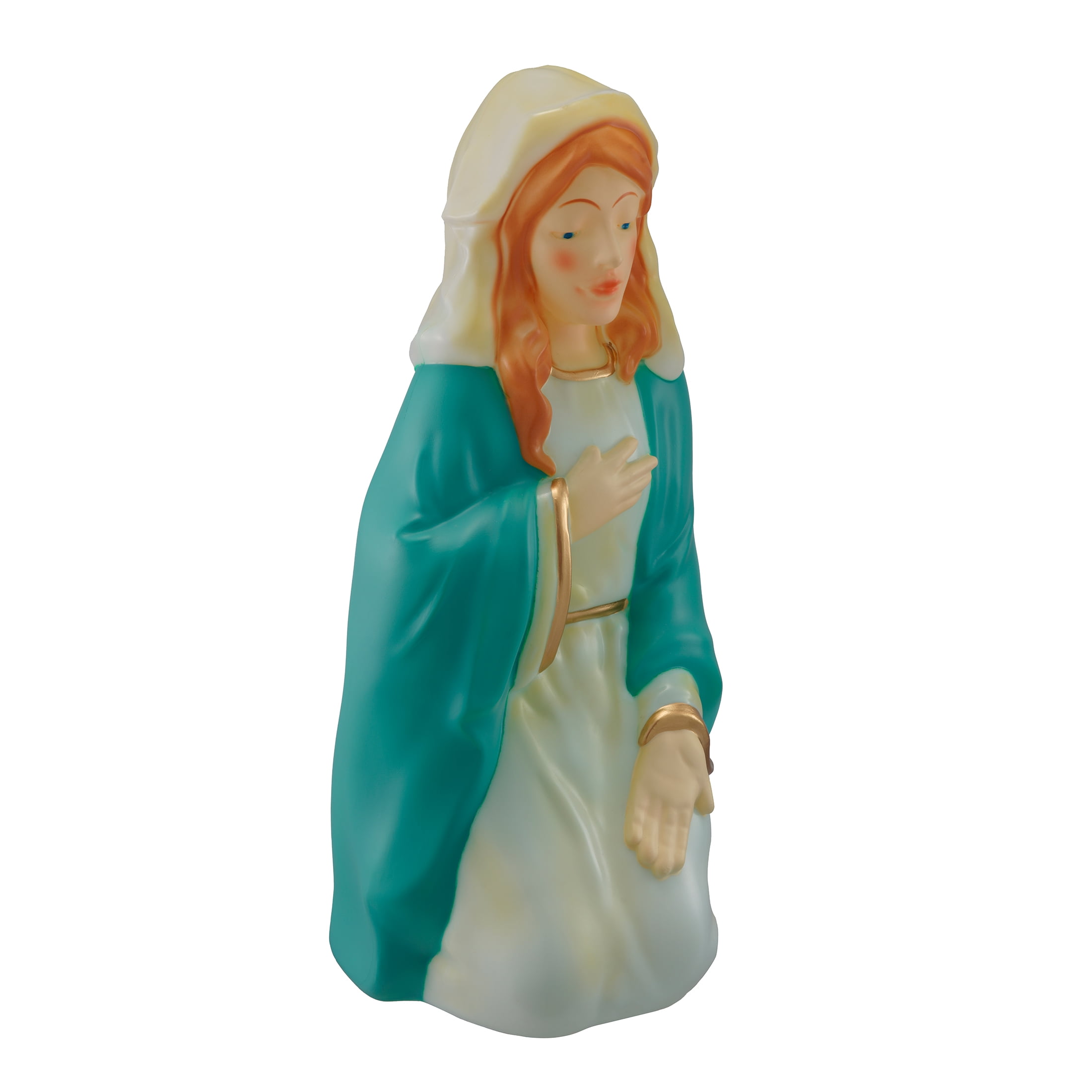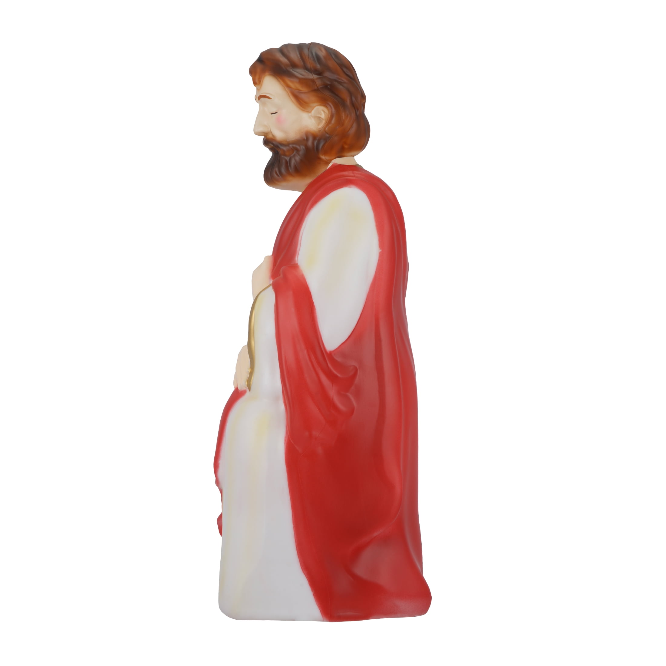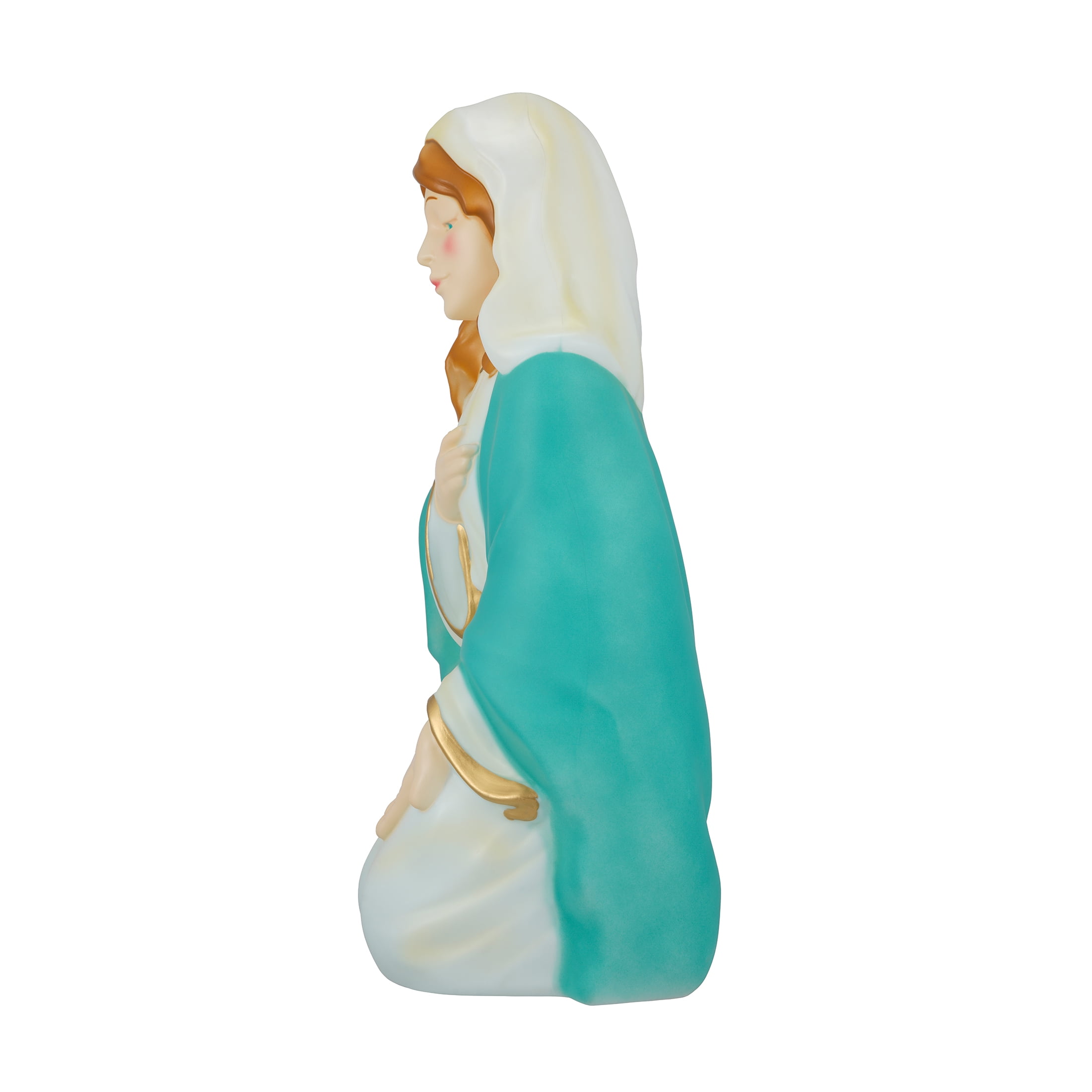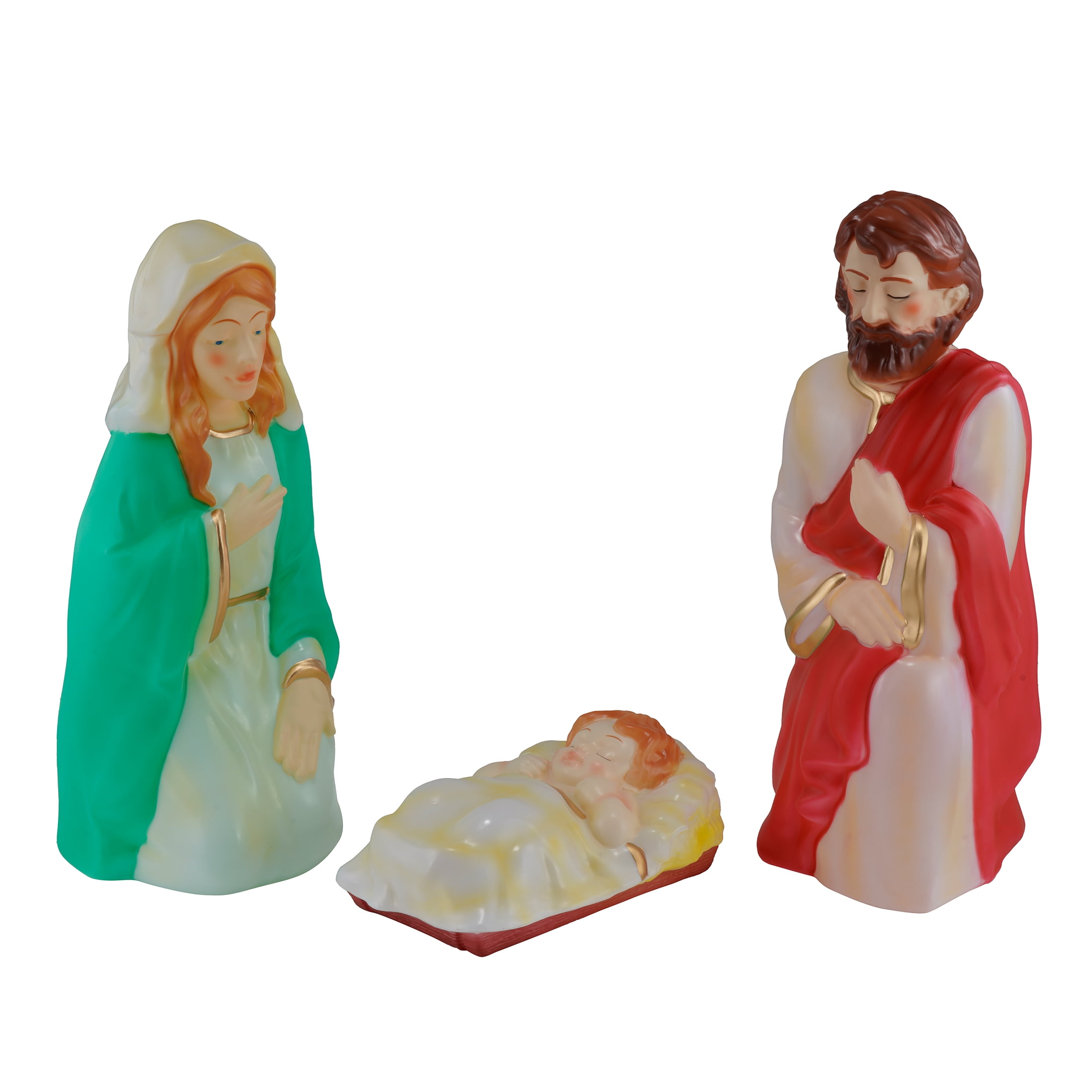 Light-Up Christmas Nativity Scene Blow Molds, 28 in, Set of 3, by Holiday Time 28 Inches tall Set of 3 including Joseph, Mary and baby Jesus Stunning, pearlescent finish Beautiful rich colors and gold details Made with durable and light weight blow molded plastic Includes C7 (standard) traditional light bulbs that are also easy to replace when needed Plugs in to standard US household outlet 110/120 volt AC Elegant Christmas design that accents any Christmas indoor/outdoor décor or theme Pairs great with any of the Holiday Time Christmas blow mold items Product Dimensions: Joseph 11.6”(W)x11.2”(D)x28”(H), Mary 12.2”(W)x10.8”(D)x27”(H), Baby Jesus 10.6”(W)x16.5”(D)x6.5”(H) Weight: 3.1kg
