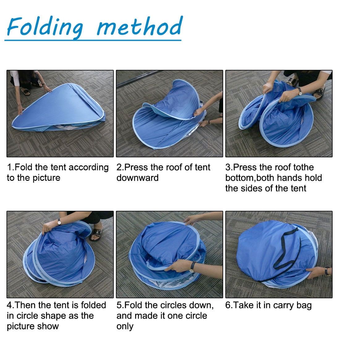 Specification: Size: 78.7 x 47.3 x 51.2inches Package Bag Diameter:19.7inches (50cm) Weight: 2.4 pounds Material: 190T silver coated fabric Anti-UV Net yarn: polyester nylon mesh type B (dense) Outside Tent Water Resistant Index: less than 1000 mm Bottom Water Resistant Index: less than 1000 mm Building Type: Quick Automatic Opening Features: -Very simply to pop it up when ready to use, then fold it back down to store. -The convenient handled carry bag is easy for compact storage and easy transport. -All material non-toxic, odorless, According to international standards produce, adults and can be safe to use. -Tent with a nail and fixing holes, under windy conditions in outdoors, tents can be fixed. -Larger space, stable structure, suitable for beach, lake, parks and other places -Application: Beach/Fishing/Camping -Function: Sun shade and UV Protective Way to open: Tust throw it into sky and it will open automatically,use the tent pegs to make the tent stable. Note: Way to fold: Pls refer to the instruchtion which coming with the tent . 1,Take off 4 tent pegs,hold the bottom of tent and folded inward. 2,Folded inward again and like shape of 8. 3,Tidy up the tent cloth,Put into the bag. Package include 1 x Beach tent 1 x Package bag 4 x mental ground stakes Tips:If the wind is too strong ,just put down your bags in the corner of the tent to prevent being blew away .