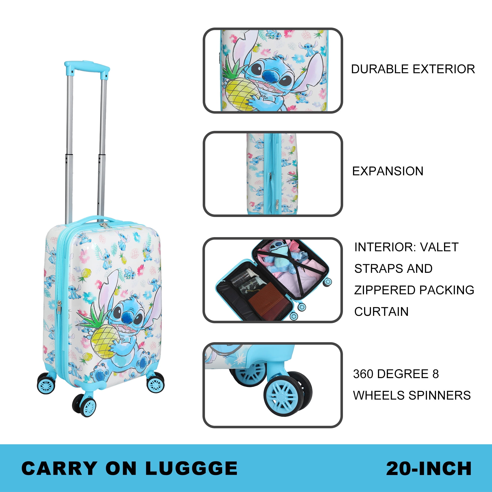 CUSTOM DESIGN: Infuse your travels with character using this Lilo & Stitch carry-on luggage, featuring an enchanting image of Stitch holding a pineapple, surrounded by tropical blooms, creating a unique and delightful accessory for your journeys. WHEELS: Navigate airports and destinations effortlessly with the smooth-rolling 360-degree wheels on this Lilo & Stitch carry-on luggage. Experience seamless mobility, making your travel experience both convenient and enjoyable. OFFICIALLY LICENSED: Showcase your love for Lilo & Stitch with officially licensed merchandise. This carry-on luggage is a genuine representation of the beloved characters, letting you travel in style while expressing your fandom. HIGH-QUALITY MATERIALS: Crafted from durable ABS and PC film materials, this carry-on luggage ensures a sturdy and reliable exterior. The high-quality construction is designed to withstand the rigors of travel, providing functionality and longevity. CARE INSTRUCTIONS: Maintain the pristine appearance of your Lilo & Stitch carry-on luggage with ease. Simply wipe it clean for quick and convenient care, ensuring that your travel companion stays as vibrant as the characters it showcases.