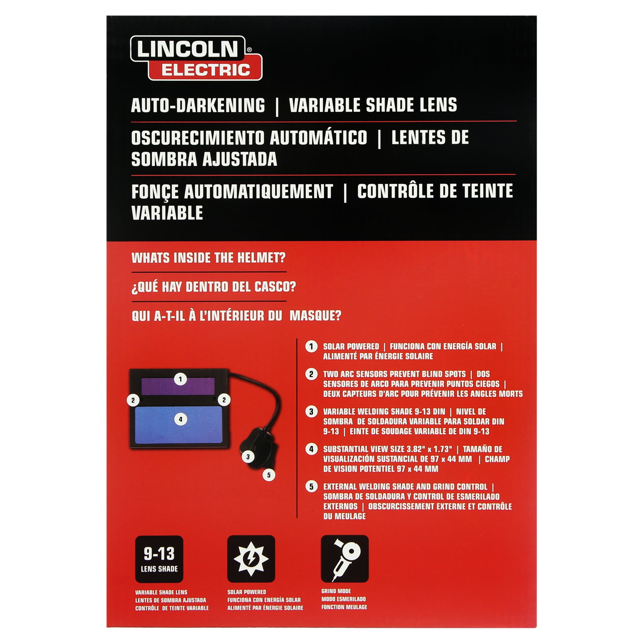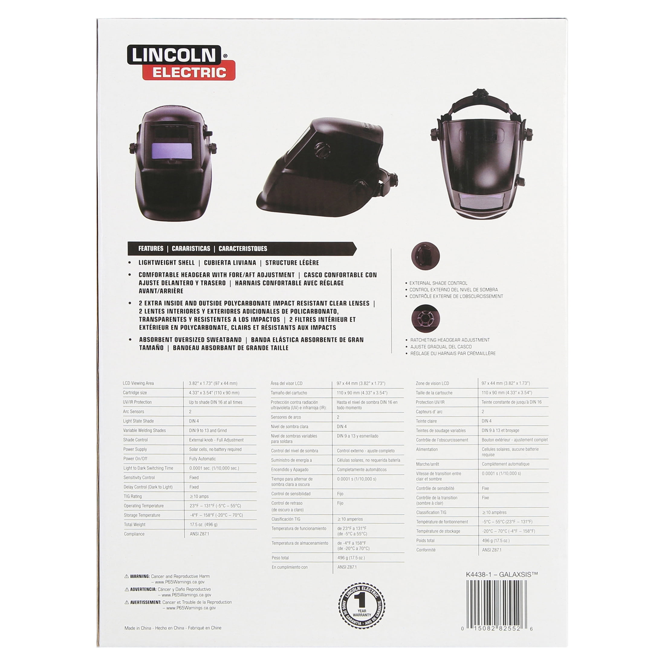 Lincoln Electric Galaxsis Auto Darkening Welding Helmet Features a variable shade range of 913 for optimal protection during welding Equipped with an autodarkening filter (ADF) for enhanced visibility and safety Lightweight design for comfort during extended use Adjustable sensitivity and delay settings to suit different welding applications Durable construction ensures longlasting performance in tough environments Ideal for both professional and hobbyist welders