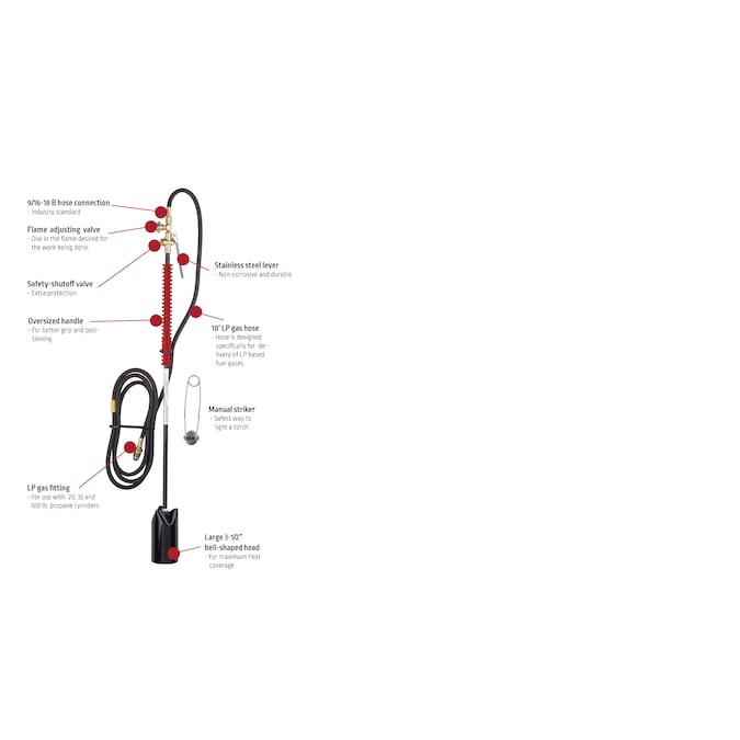 - INCLUDED IN KIT: Comes with (1) Inferno Torch that has a 6.75” straight shaft design, (1) 10′ LP Gas Hose with 9/16”-18 B fitting to work with propane cylinders, and a Flint Striker